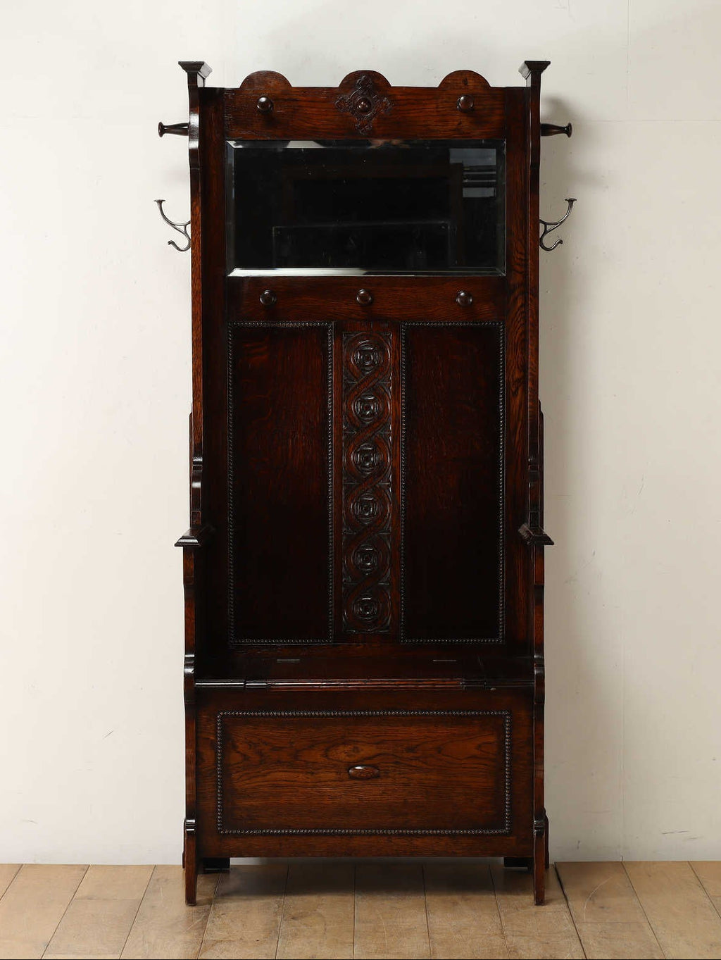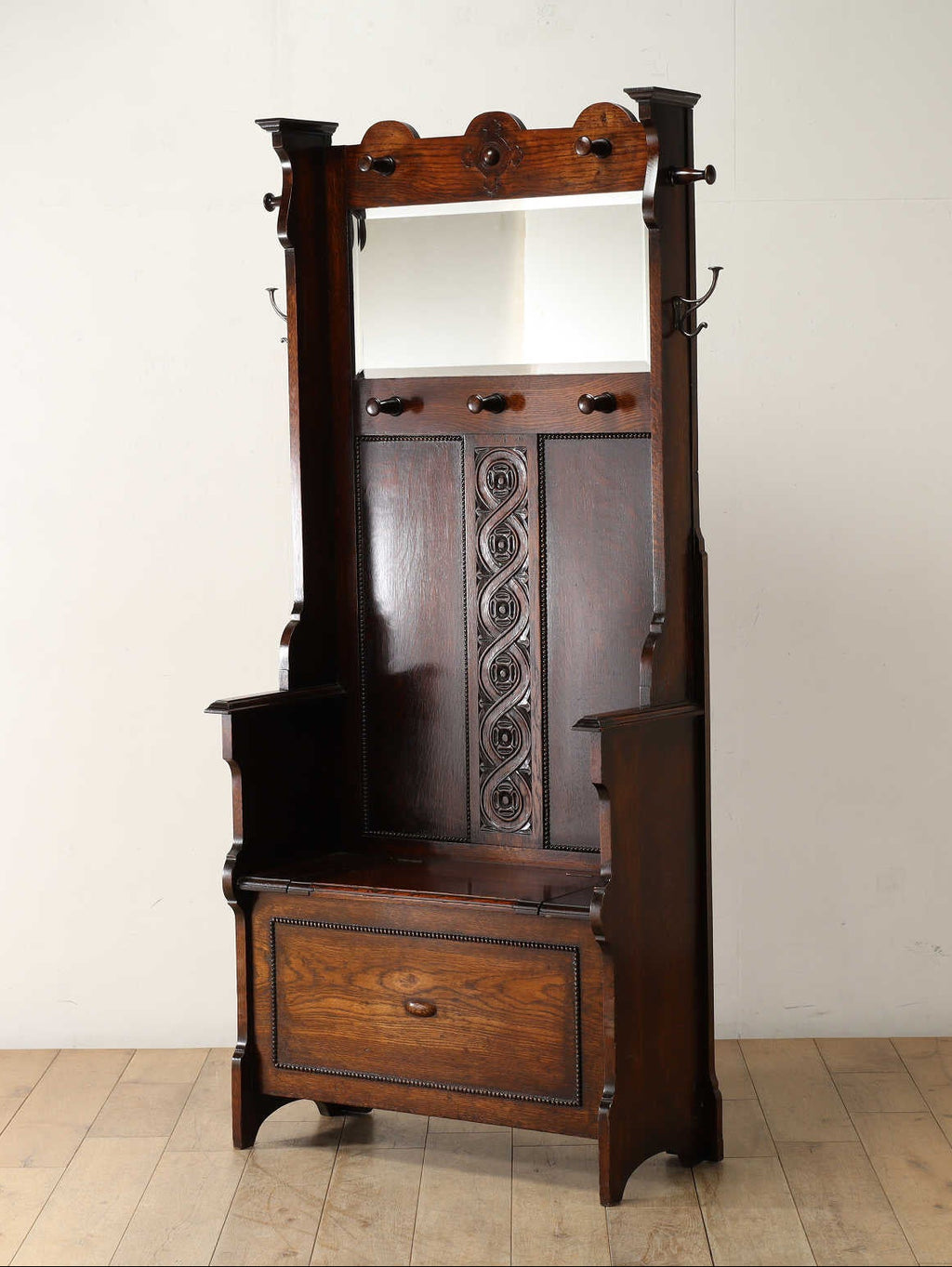 その名の通り、玄関ホールなどで使用されていたホールスタンド。ミラーやフック、スティックスタンドが集約されていることがベースになるものの、個体によって様々なデザインがあります。こちらの一台は収納を兼ねたベンチが備え付けらており、少し腰を掛けたりと、大変重宝する機能です。ベンチ下の収納は、シンプルなボックス状の為、雑多なものなどの収納に便利そうです。アンティークの格式と重厚な存在感が魅力な一台です。