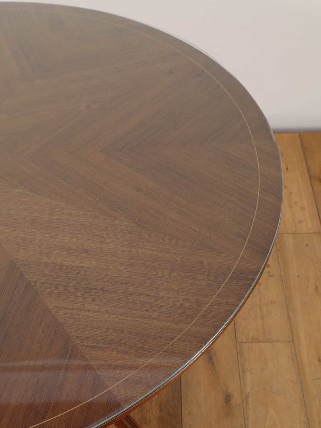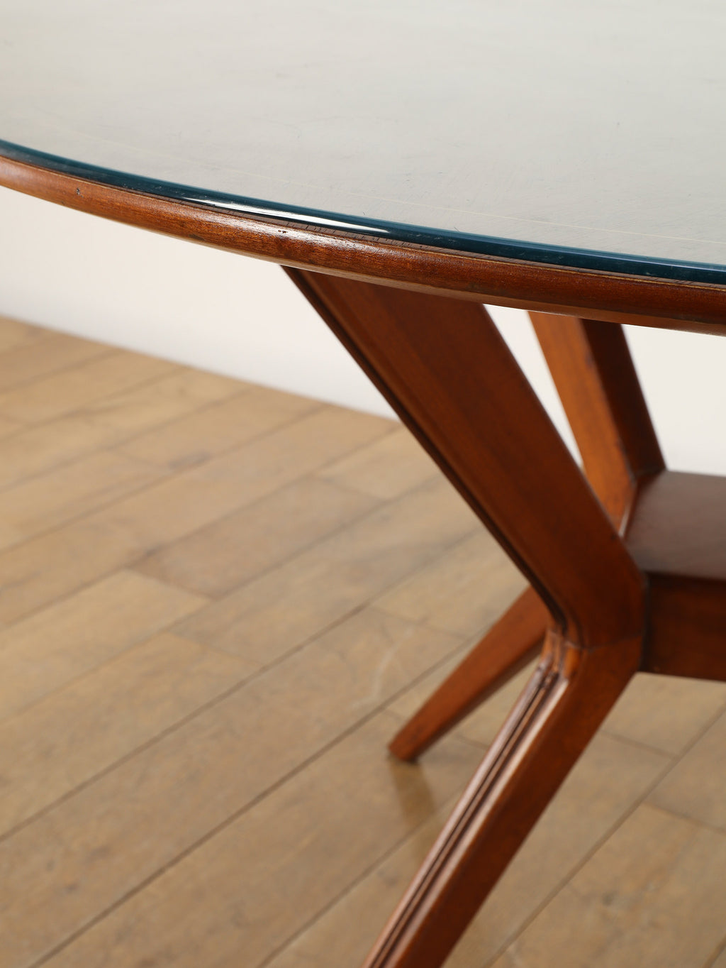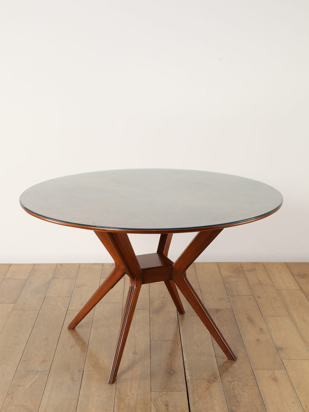 およそ1950年に作られたイタリア製のラウンドテーブルです。マホガニー材とガラスを組み合わせたこの一台は、当時のイタリアンデザインらしい洗練された美しさが際立ちます。特に目を引くのは、中央部分に設けられた棚のような貫の構造と、向かって優雅にくびれた脚部のデザインです。この絶妙なシルエットが、彫刻のような存在感を生み出し、テーブルとしての実用性に加え、アートピースとしての価値をも高めています。抜け感のある構造が空間に軽やかさを与えつつ、素材の重厚さがしっかりと支えています。クラシックでありながらモダンな空気を纏った、イタリアならではの逸品です。