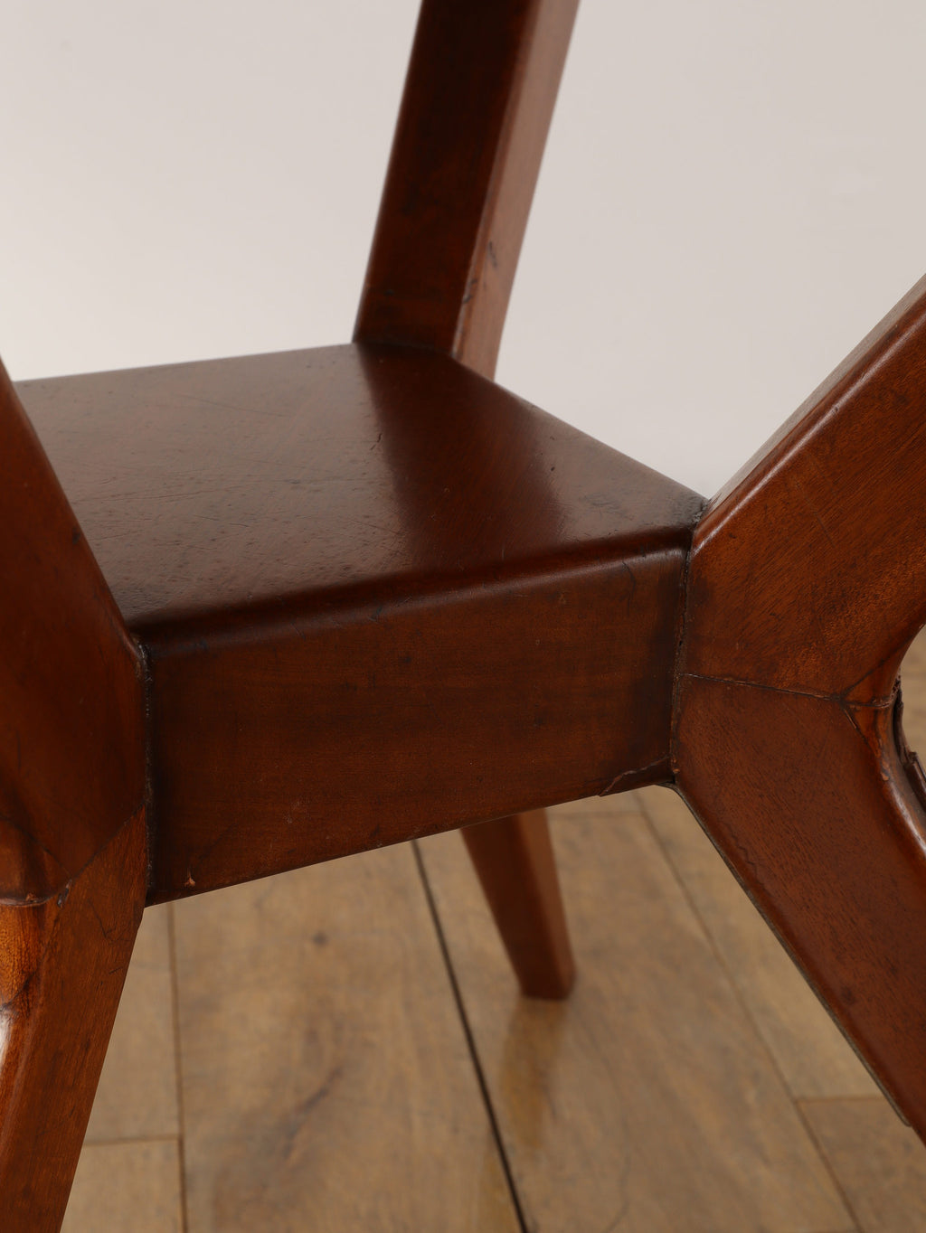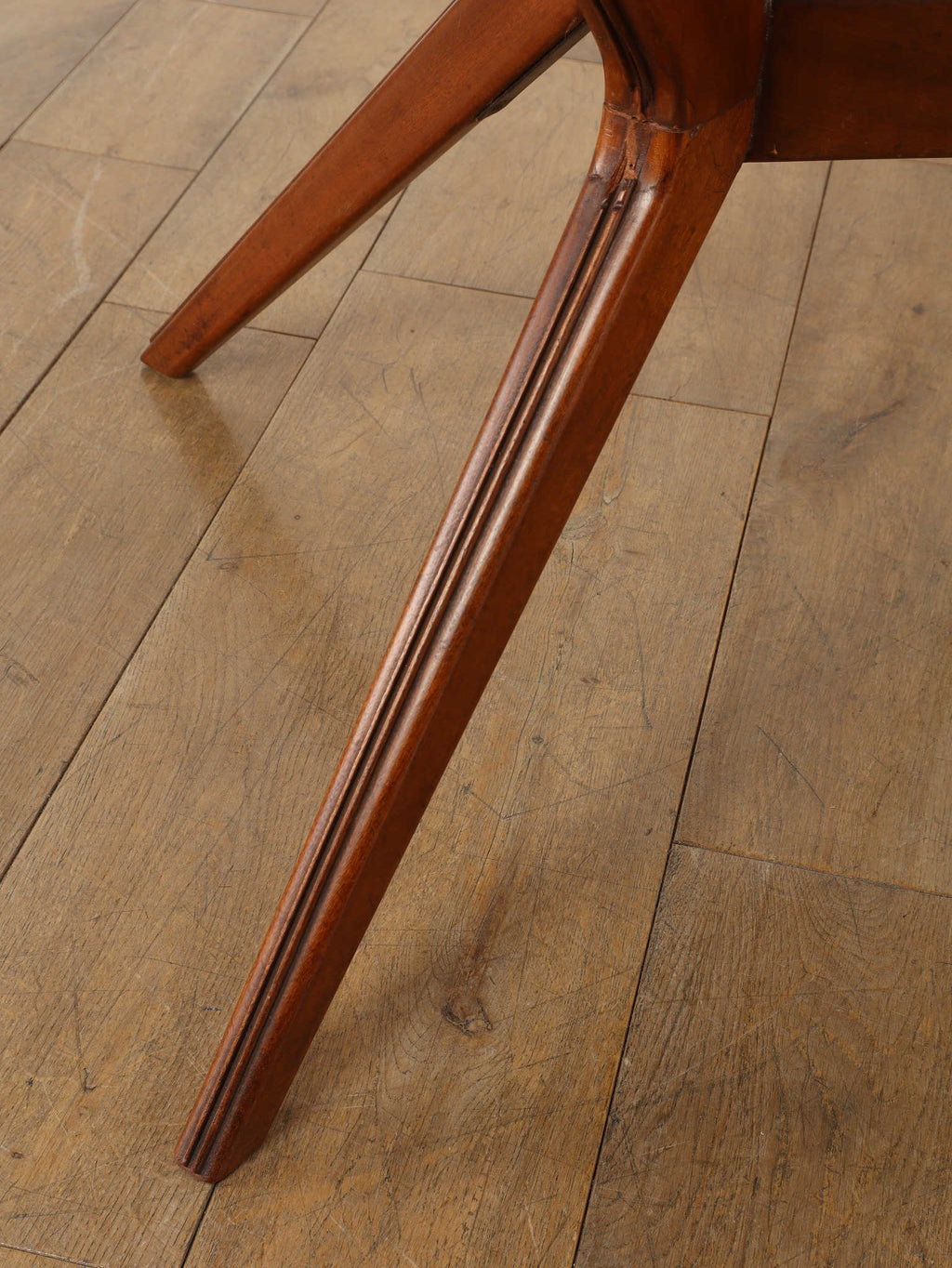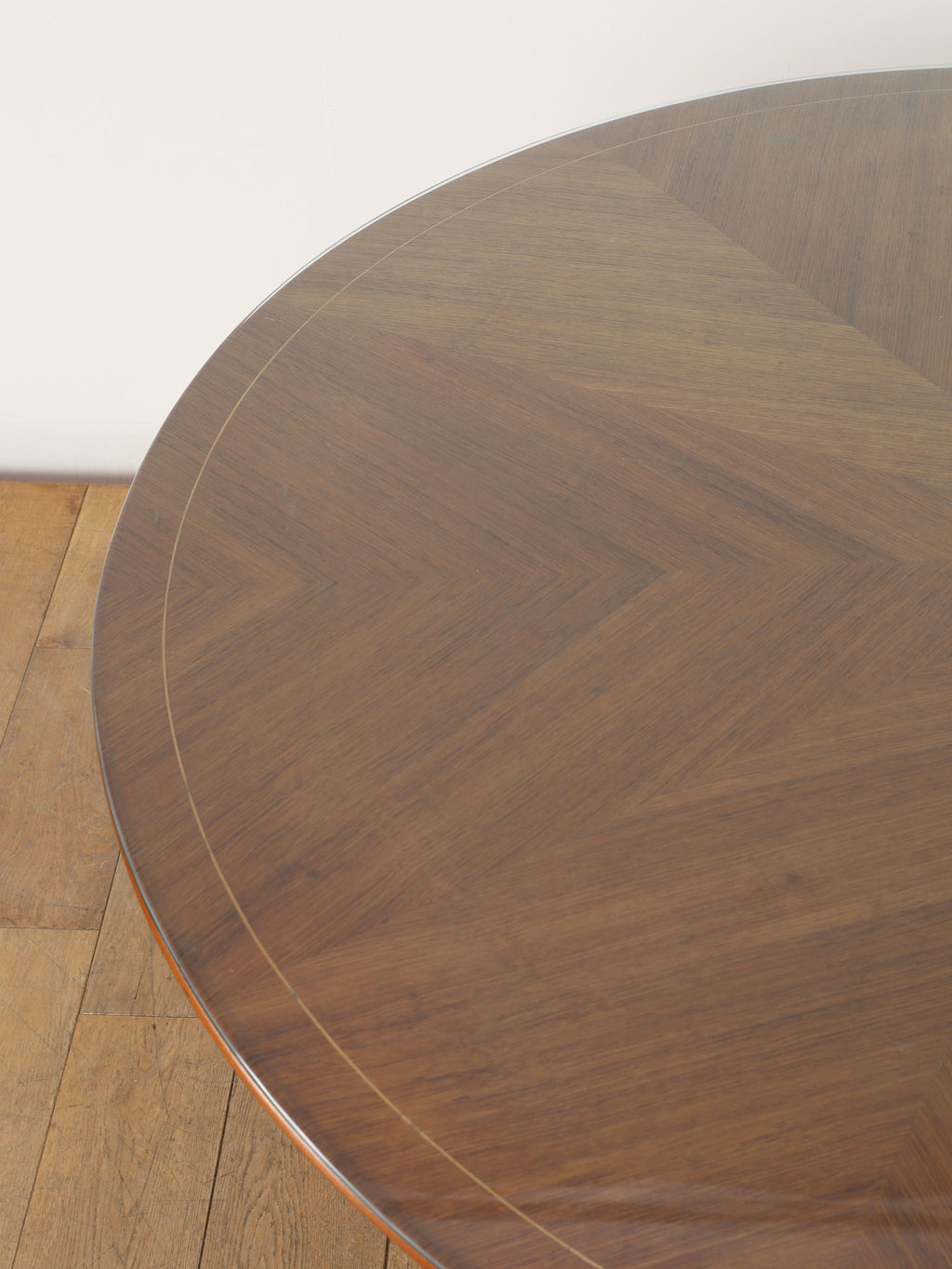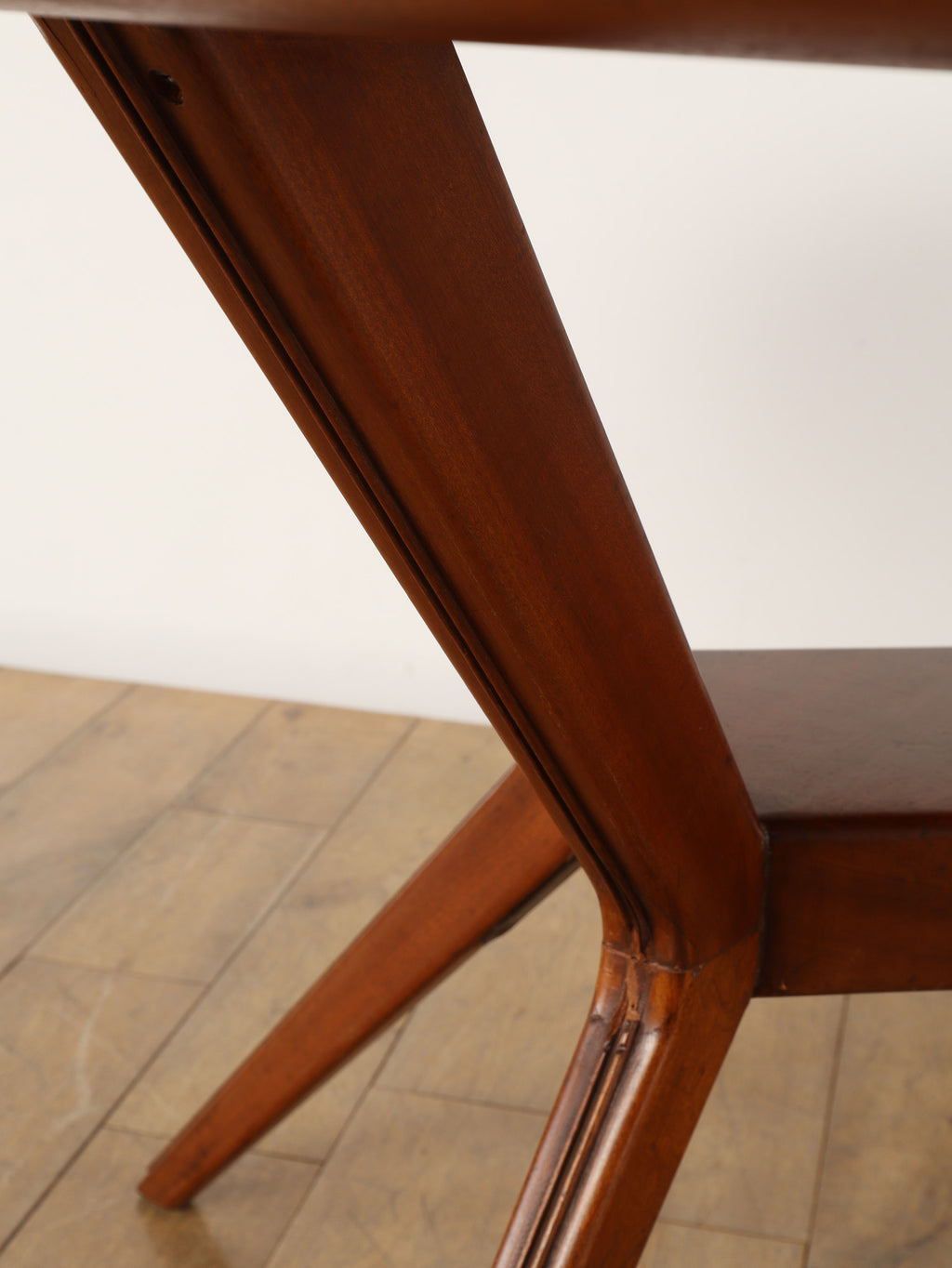 およそ1950年に作られたイタリア製のラウンドテーブルです。マホガニー材とガラスを組み合わせたこの一台は、当時のイタリアンデザインらしい洗練された美しさが際立ちます。特に目を引くのは、中央部分に設けられた棚のような貫の構造と、向かって優雅にくびれた脚部のデザインです。この絶妙なシルエットが、彫刻のような存在感を生み出し、テーブルとしての実用性に加え、アートピースとしての価値をも高めています。抜け感のある構造が空間に軽やかさを与えつつ、素材の重厚さがしっかりと支えています。クラシックでありながらモダンな空気を纏った、イタリアならではの逸品です。