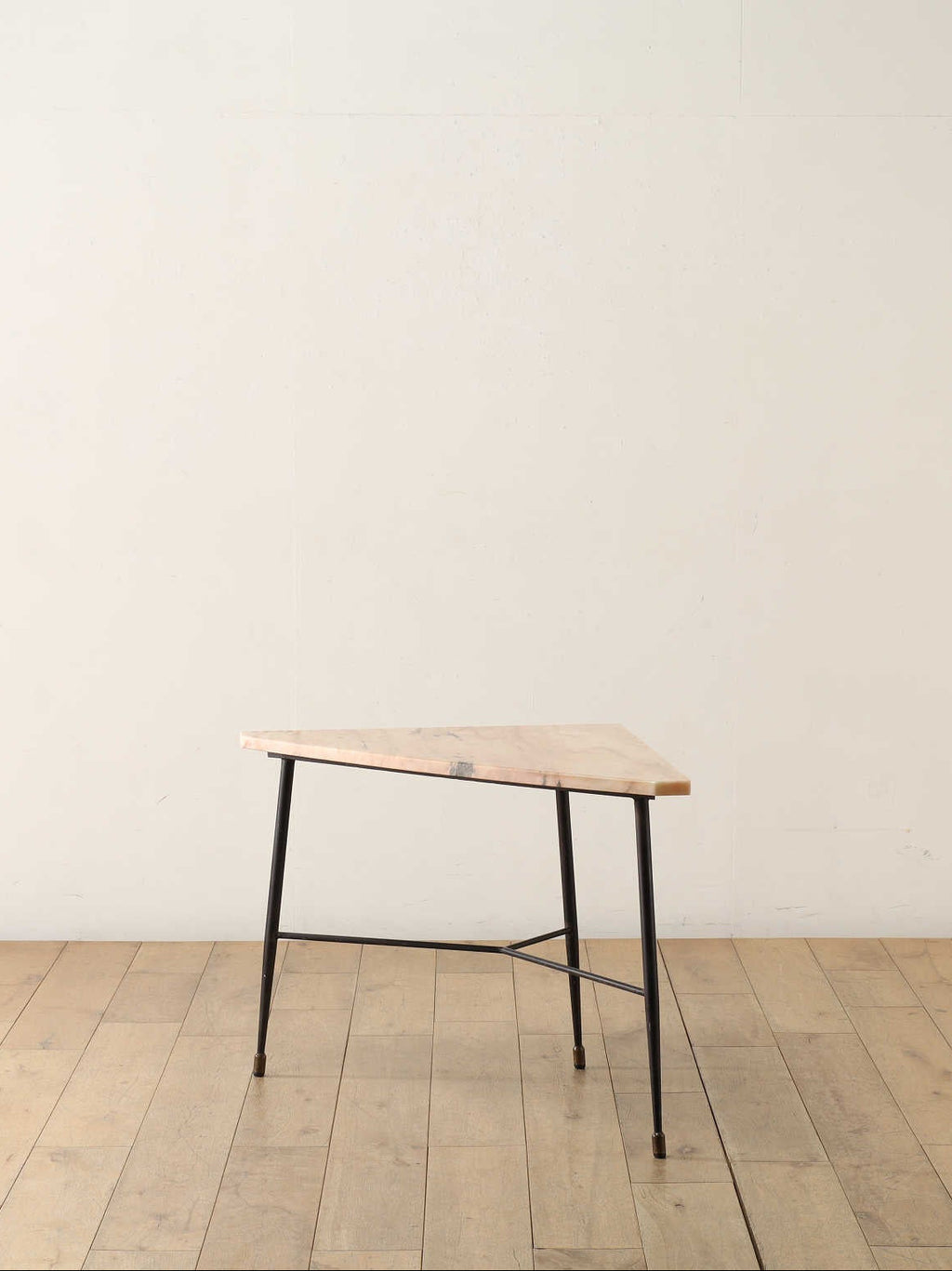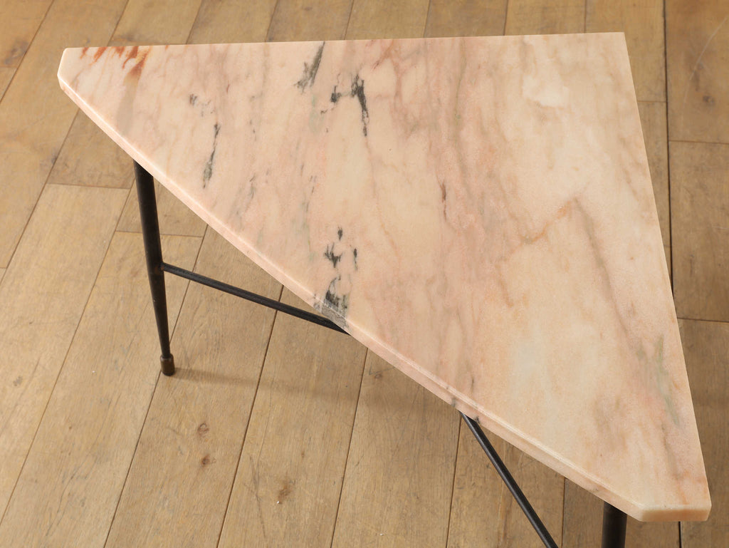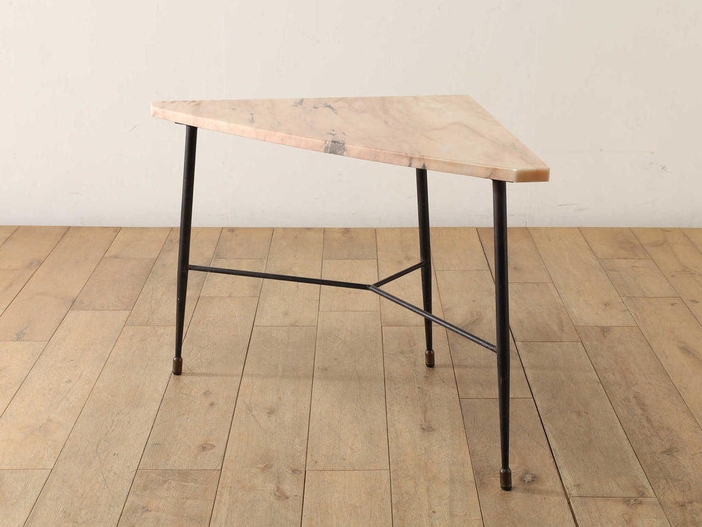 マーブルの淡い色味とメタルの脚のコントラストが美しいコーナーテーブル。イタリアンヴィンテージらしいテーパードレッグでスタイリッシュかつ、マーブルの天板が華やかな印象を演出してくれます。現代の家具との相性も良く、馴染みながらもヴィンテージならではの存在感を放ってくれます。花器やオブジェなどを置いていただくことで、メインを引き立てる飾り棚としても活躍してくれます。
