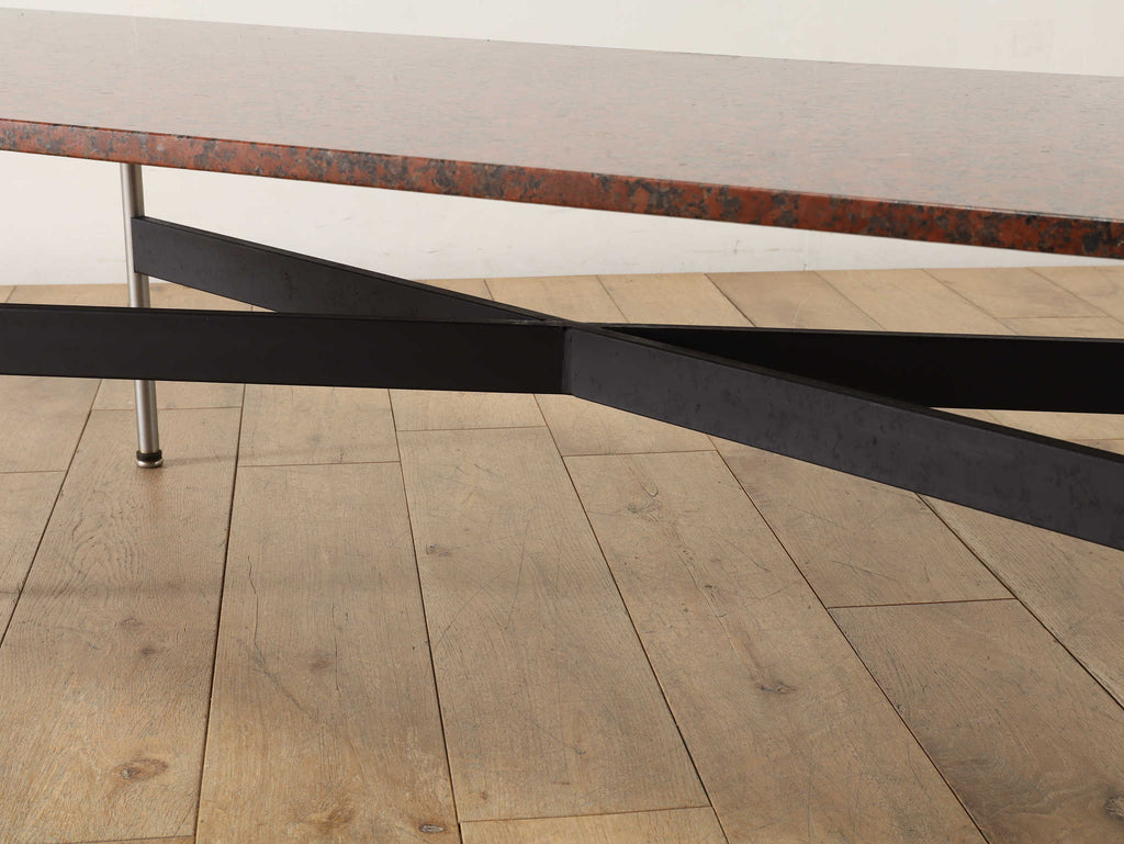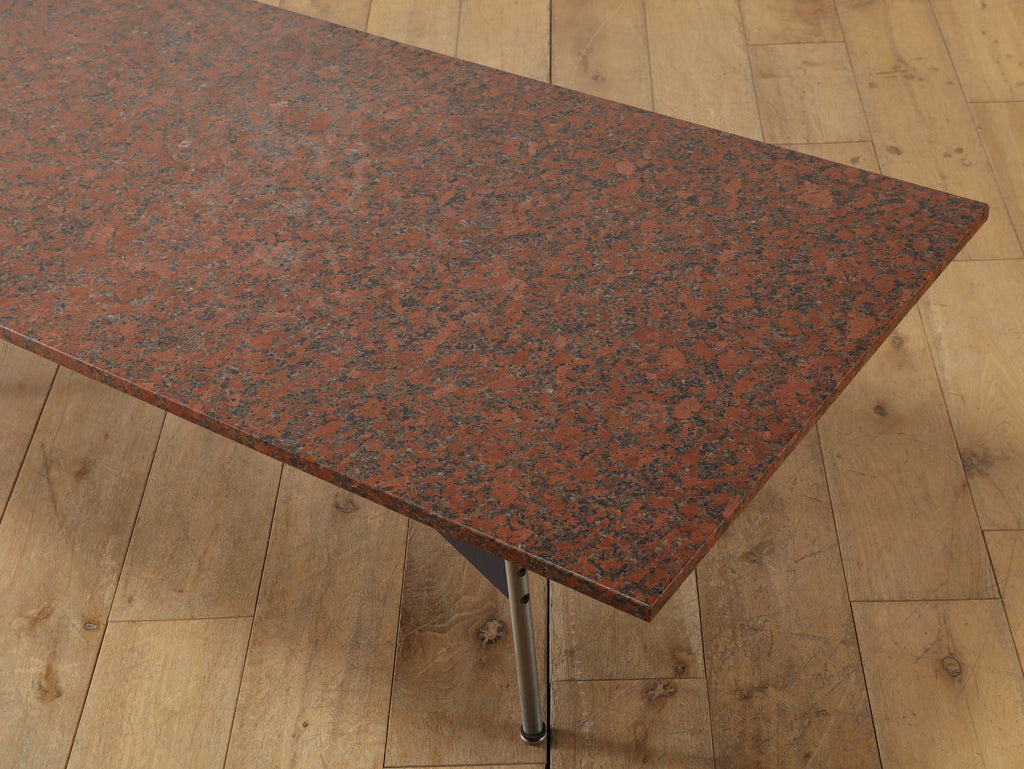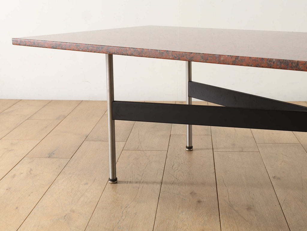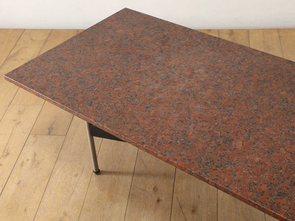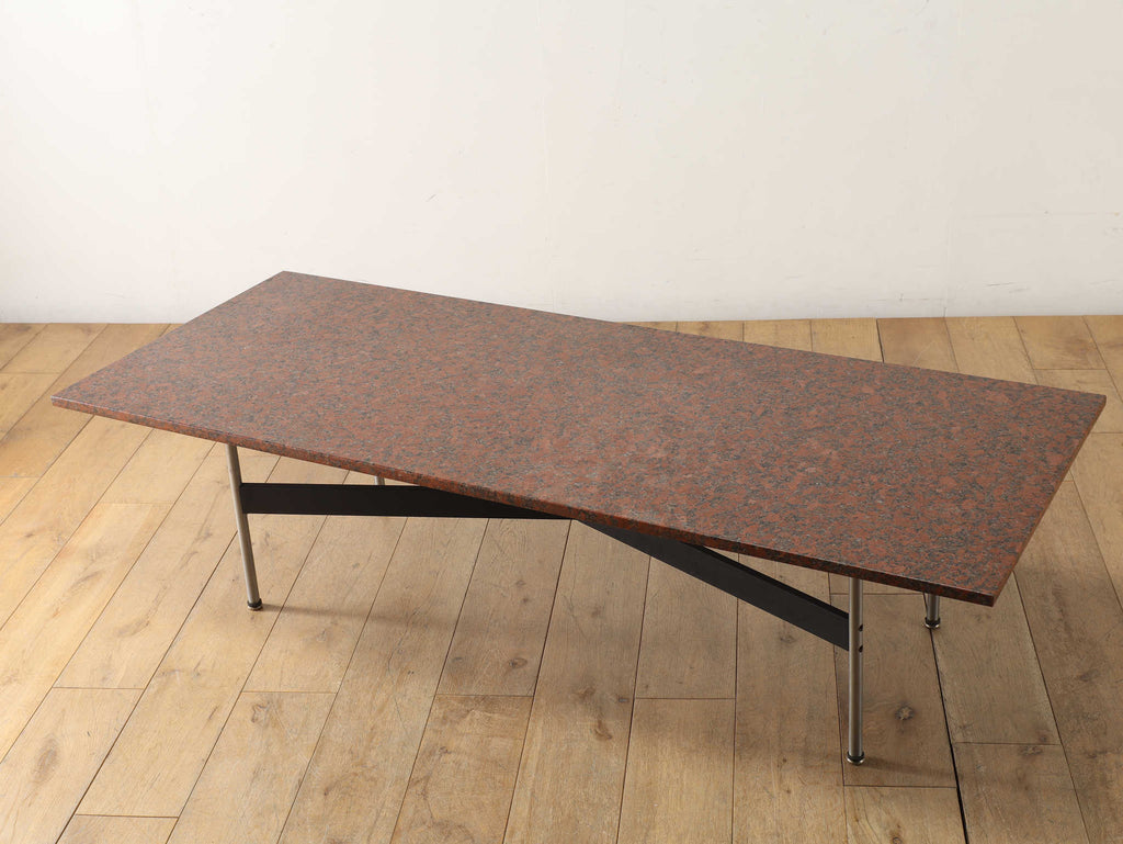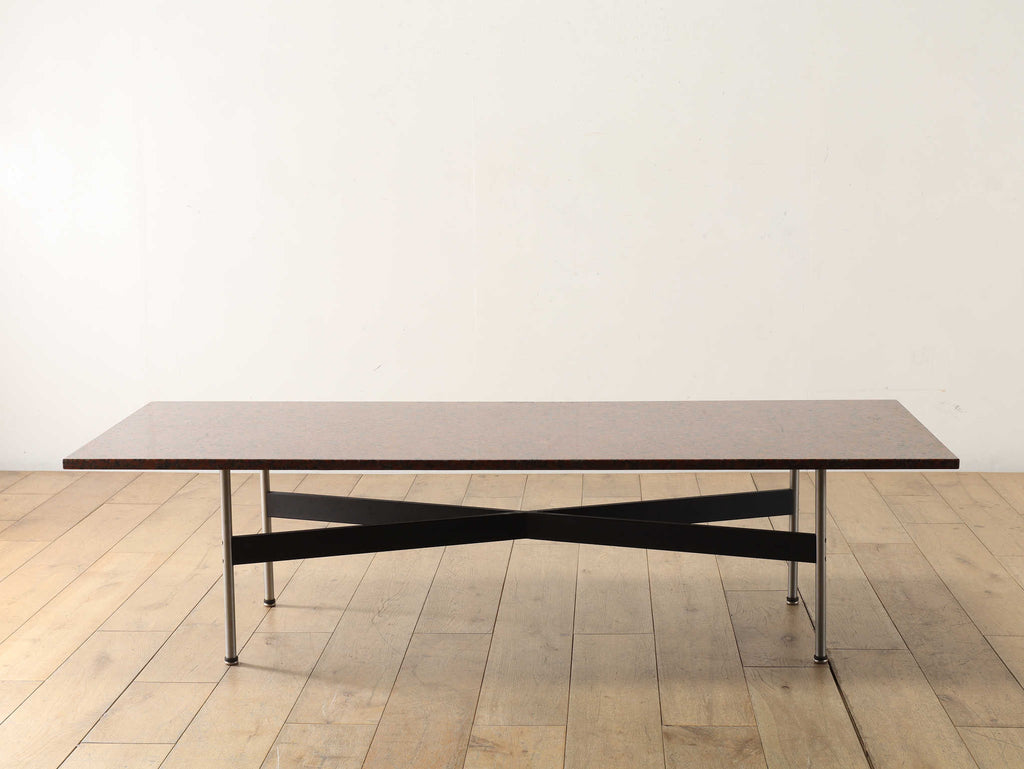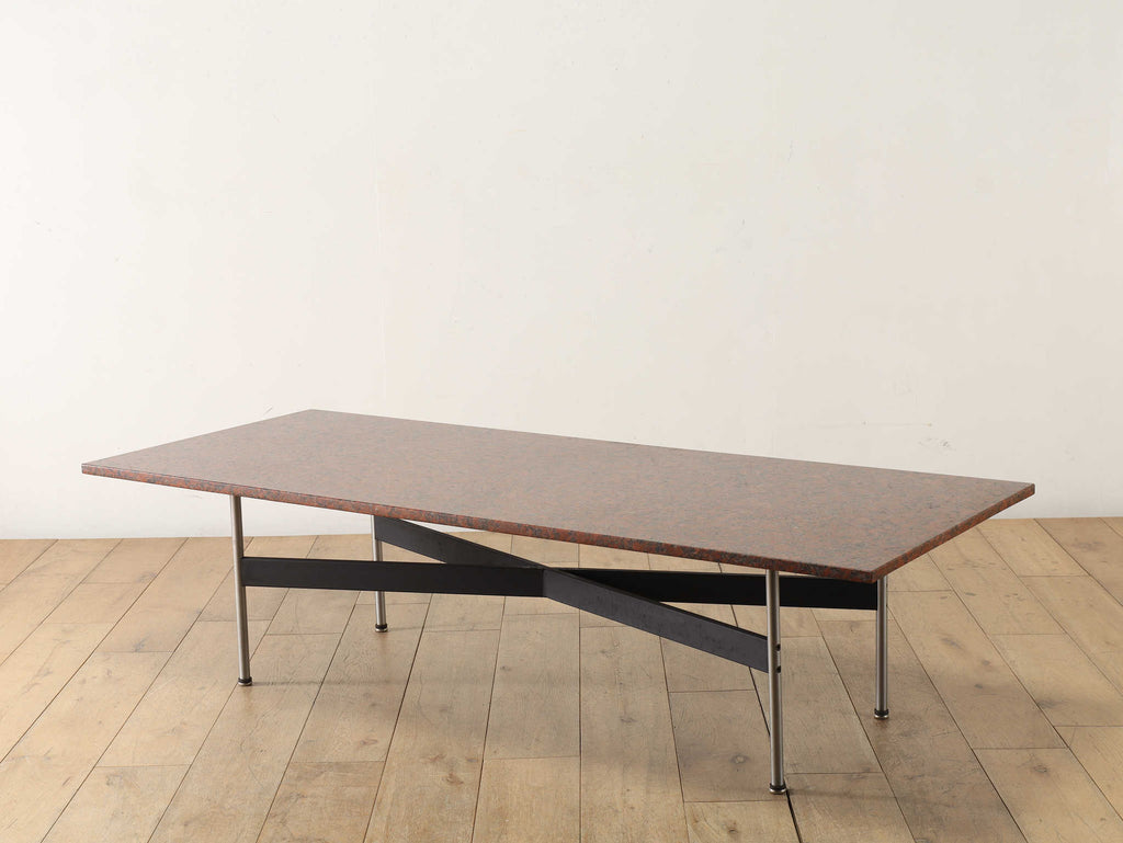 美しい天板が魅力のコーヒーテーブルです。1960年代(推定)のイタリアヴィンテージで、洗練された線の細いスタイリッシュなデザインが特徴的。異素材の組み合わせがバランスよく、コーヒーテーブルとしての美しさだけでなく、他のアイテムとの調和をもたらしてくれそうな印象です。W1500mm / D600mm / 390mmのサイズが3人掛けソファとの相性もよく、広々とお使い頂けます。