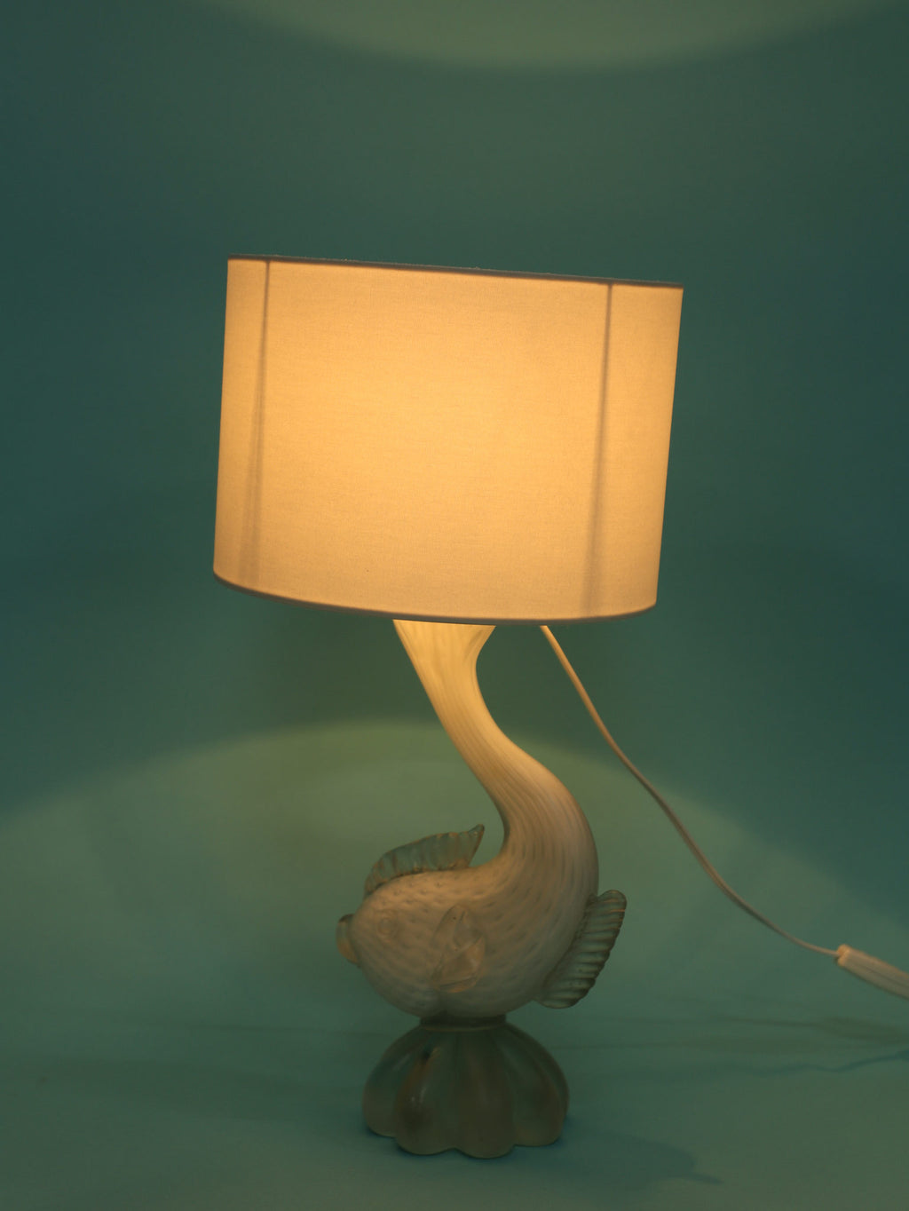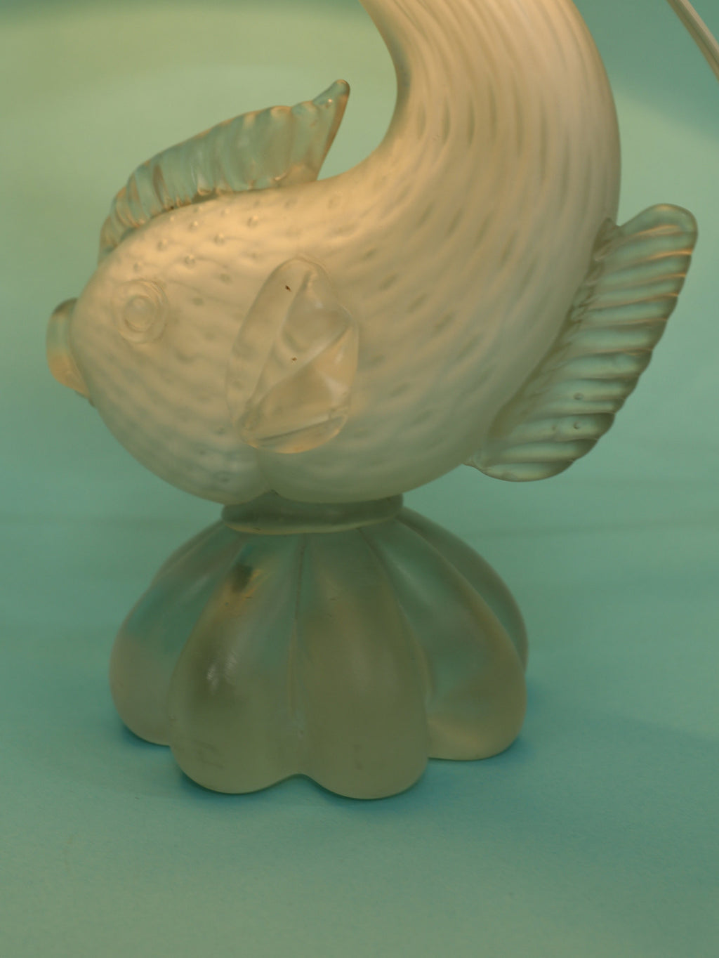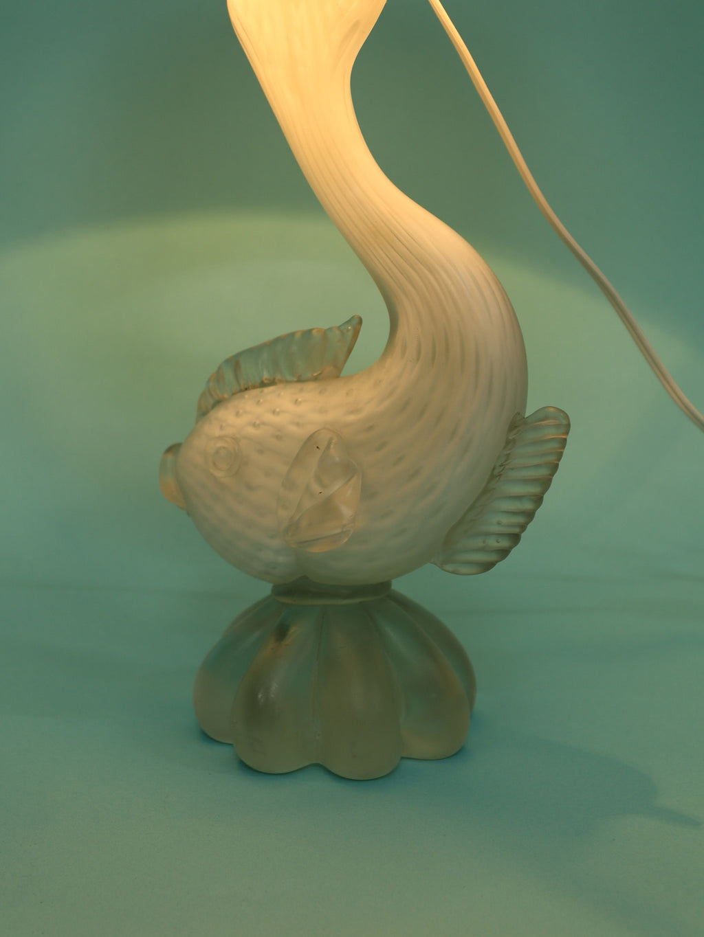 1960年代(推定)にベルギーで作られた、ガラス製の魚の形をした他にはないユニークなテーブルランプです。乳白色のガラスが光を優しく拡散し、幻想的な雰囲気を演出します。遊び心あふれるデザインは、お部屋のアクセントにぴったりです。点灯時だけでなく、アート、オブジェとしても存在感を放ち、空間を個性的に彩ります。