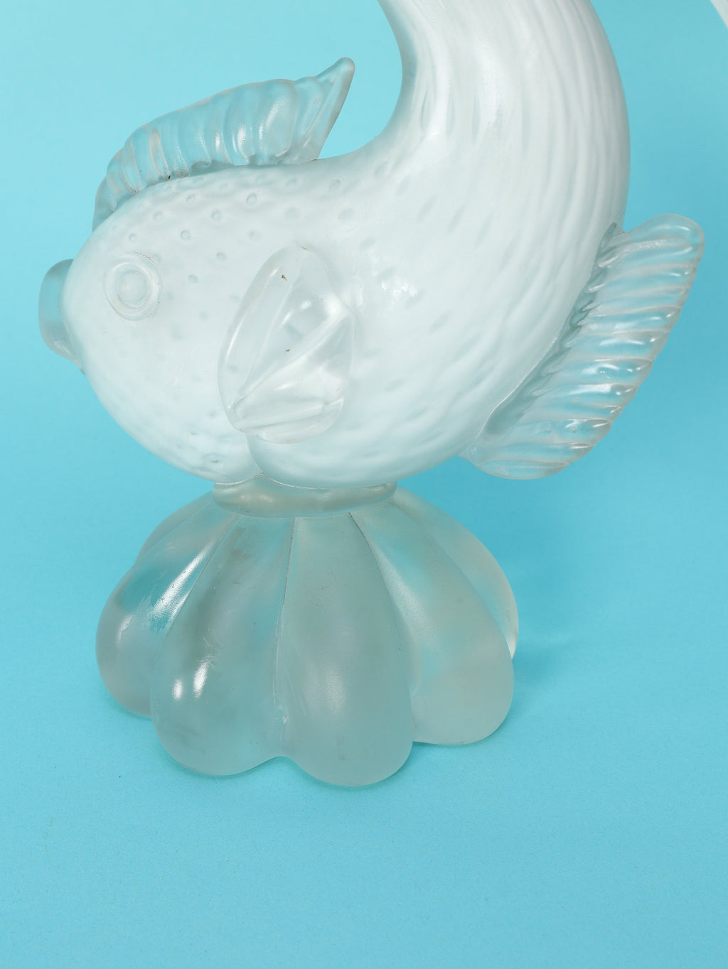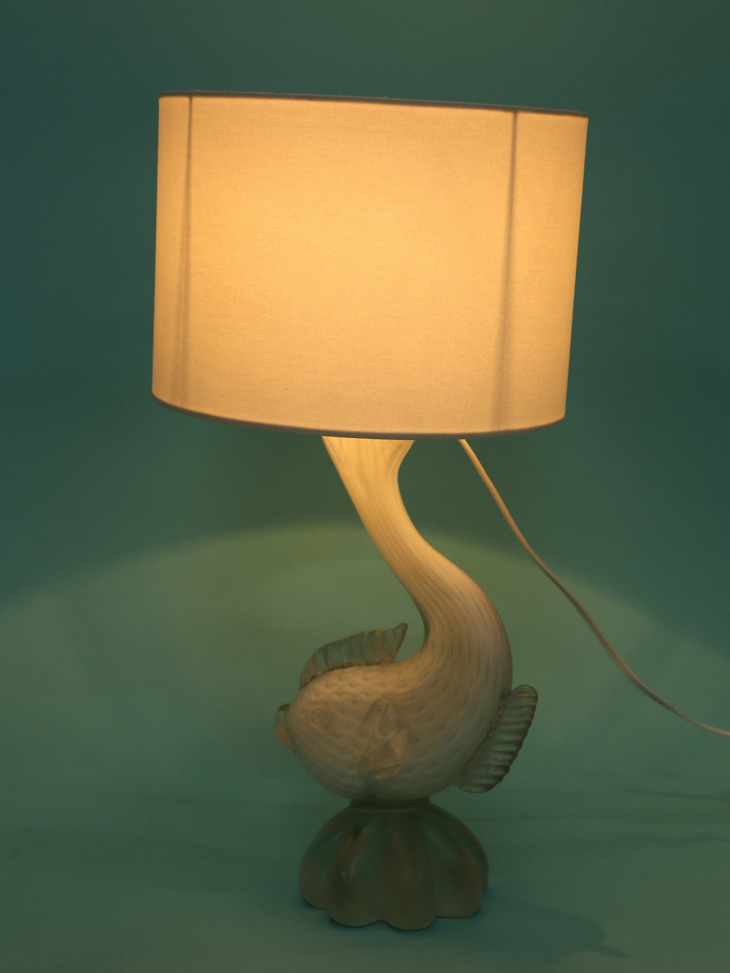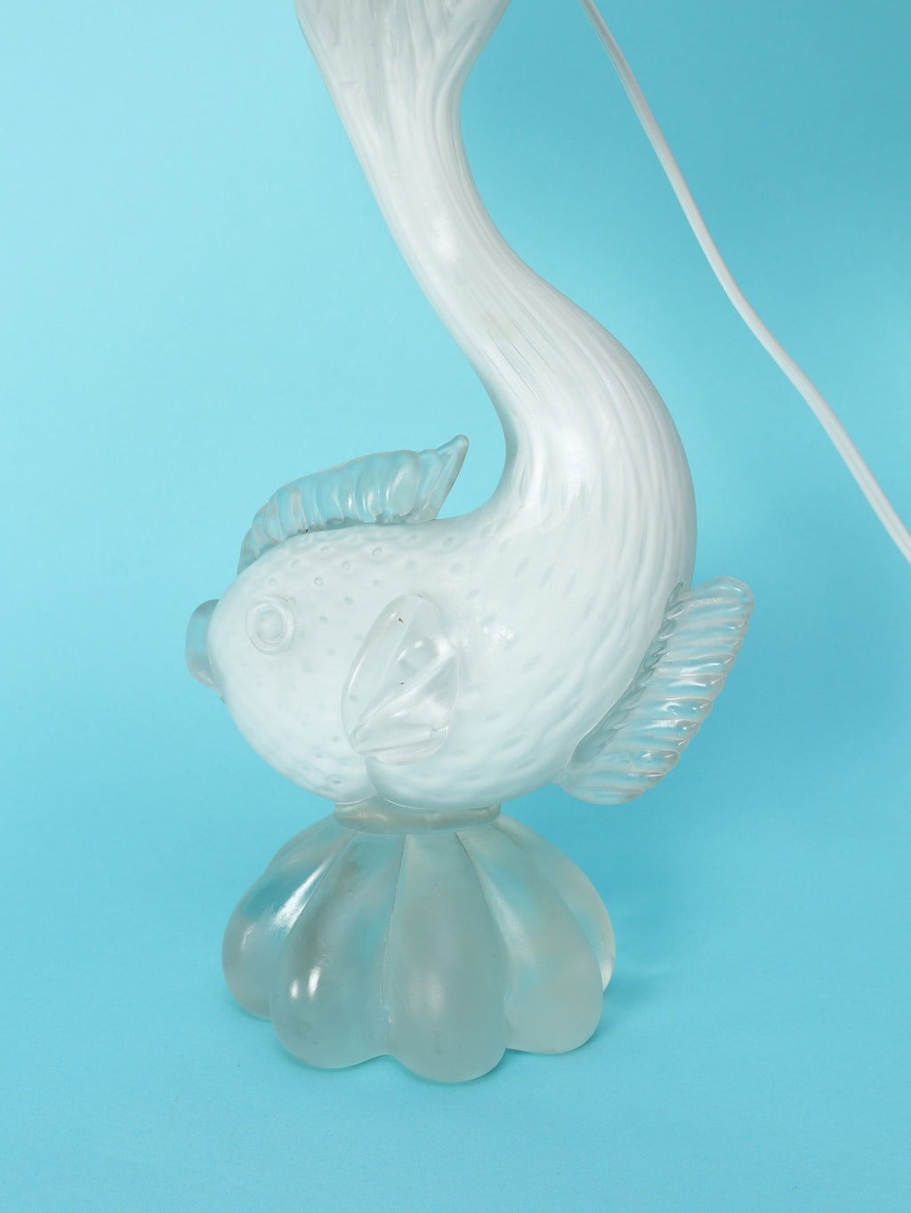 1960年代(推定)にベルギーで作られた、ガラス製の魚の形をした他にはないユニークなテーブルランプです。乳白色のガラスが光を優しく拡散し、幻想的な雰囲気を演出します。遊び心あふれるデザインは、お部屋のアクセントにぴったりです。点灯時だけでなく、アート、オブジェとしても存在感を放ち、空間を個性的に彩ります。