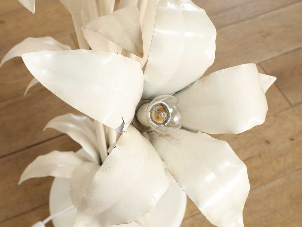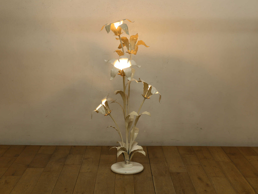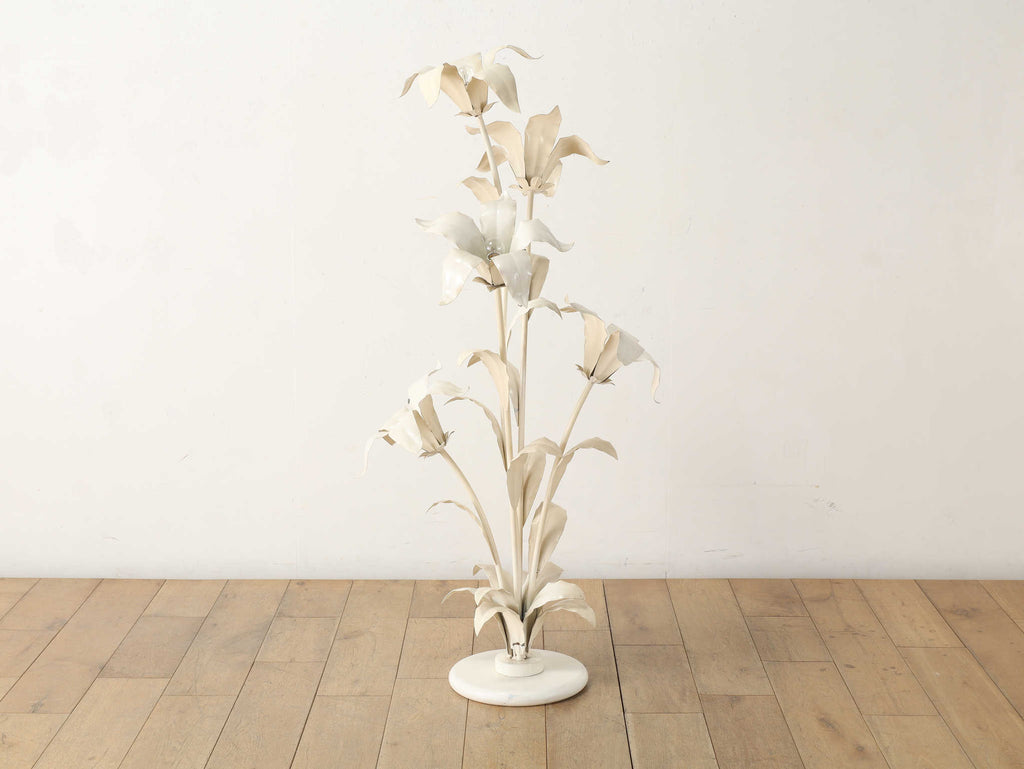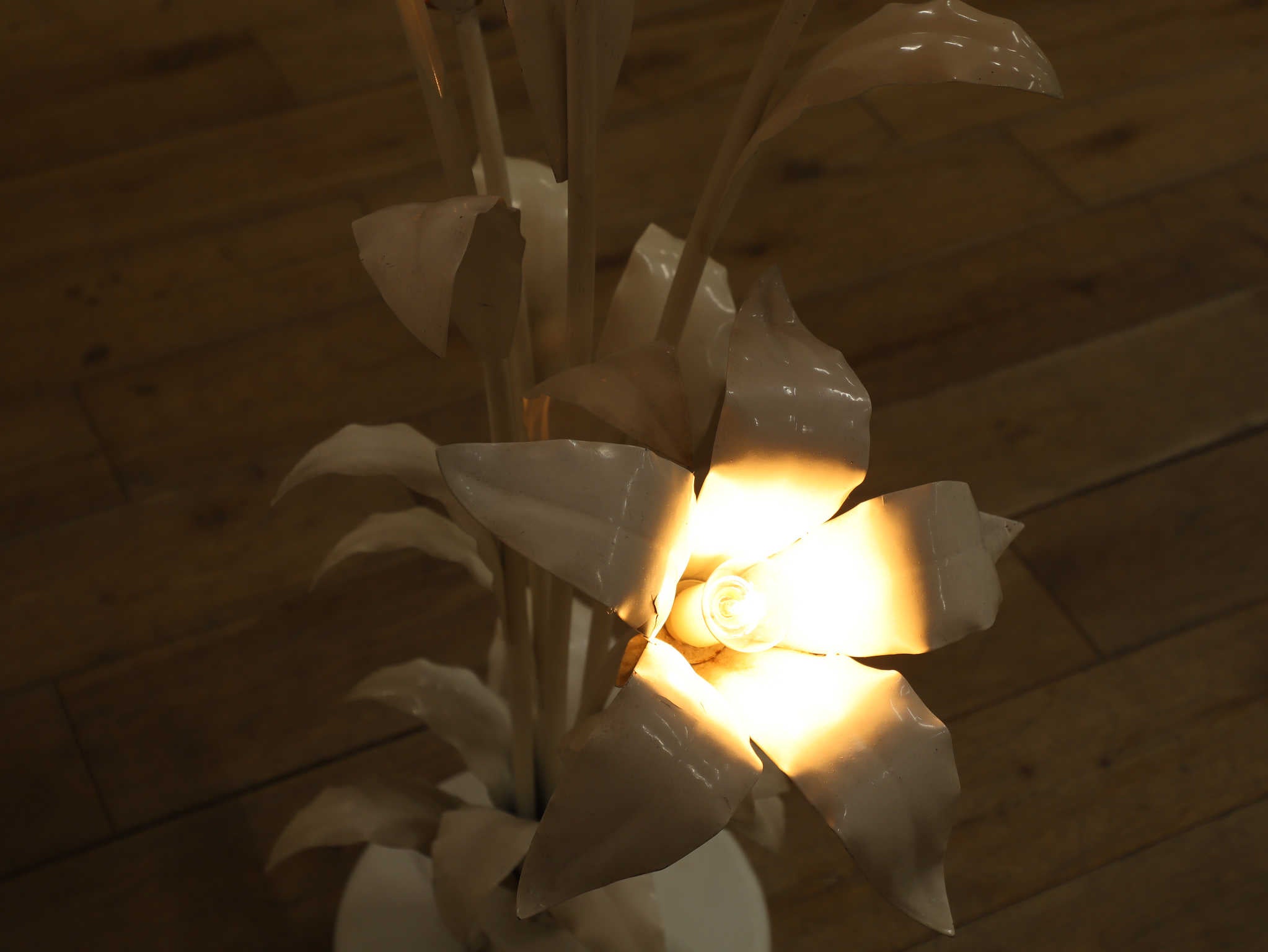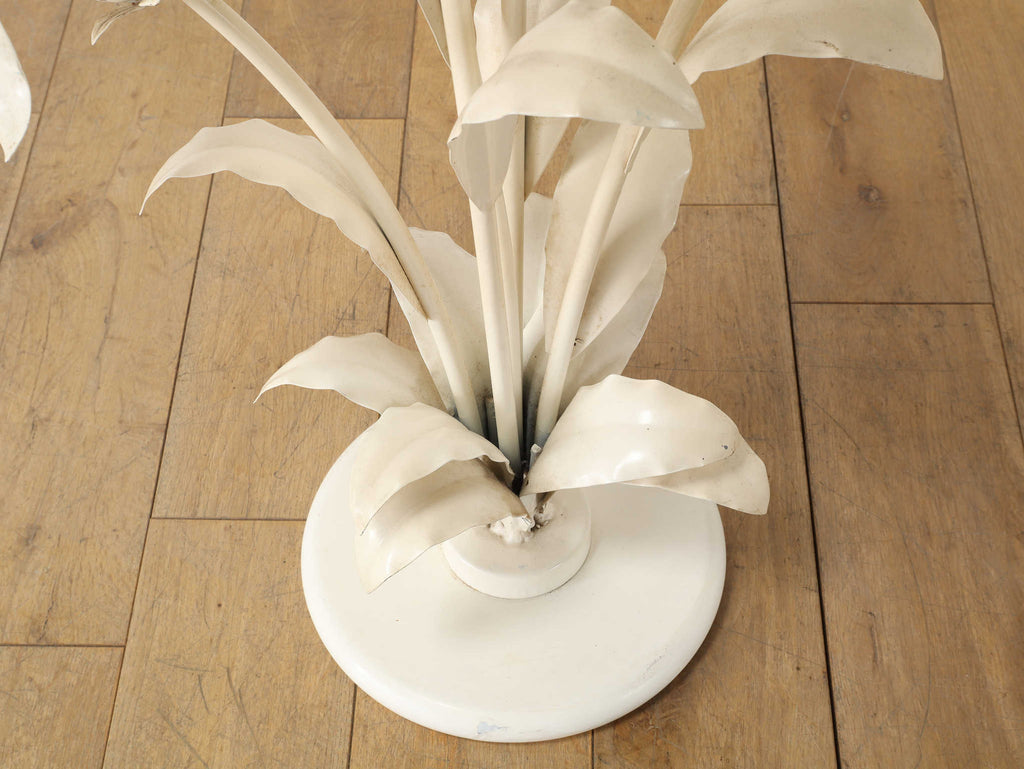 1960年代(推定)にベルギーで製作された、メタル製のフラワーフロアランプです。ミッドセンチュリーデザインの中でも、特にアヴァンギャルドで華やかな、生命力あふれる造形が魅力的な逸品です。白いペイントが施されたメタル製の百合(リリー)のような花々が、大胆かつ優雅に立ち上がり、その花弁から柔らかな光を溢れさせます。この普遍的なデザイン性は、当時のヨーロッパのモダンアートの影響を色濃く受けており、半世紀以上が経過した現代においても、空間に強烈な個性を与える存在感を放ちます。このランプの真価は、点灯時だけでなく、日中のオブジェとしての美しさにもあります。無機質なメタル素材を使いながらも、自然のモチーフを表現する高い芸術性は、見る者の想像力を掻き立てるでしょう。