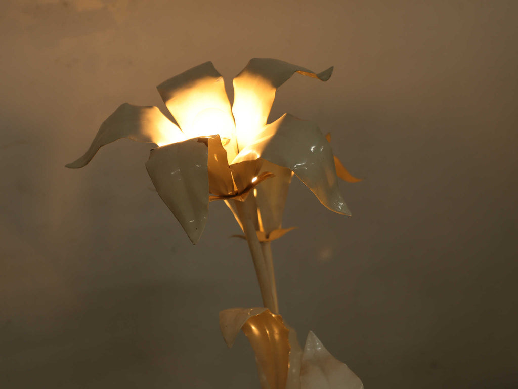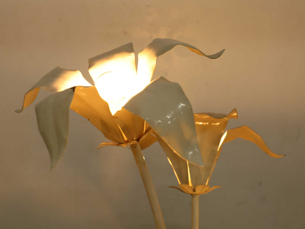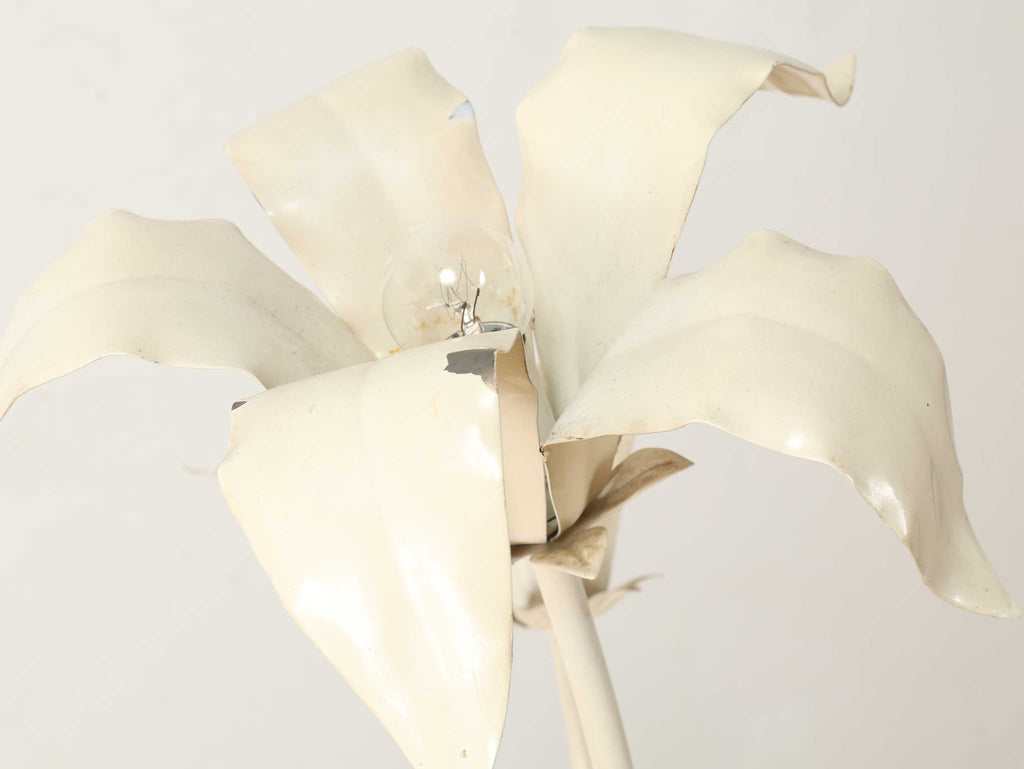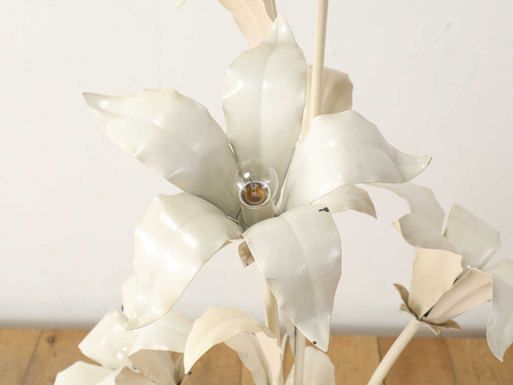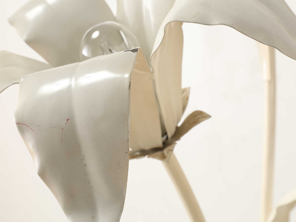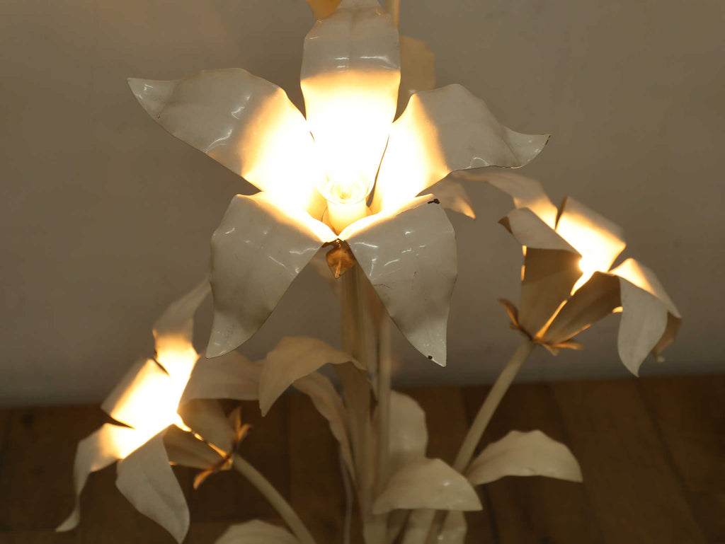 1960年代(推定)にベルギーで製作された、メタル製のフラワーフロアランプです。ミッドセンチュリーデザインの中でも、特にアヴァンギャルドで華やかな、生命力あふれる造形が魅力的な逸品です。白いペイントが施されたメタル製の百合(リリー)のような花々が、大胆かつ優雅に立ち上がり、その花弁から柔らかな光を溢れさせます。この普遍的なデザイン性は、当時のヨーロッパのモダンアートの影響を色濃く受けており、半世紀以上が経過した現代においても、空間に強烈な個性を与える存在感を放ちます。このランプの真価は、点灯時だけでなく、日中のオブジェとしての美しさにもあります。無機質なメタル素材を使いながらも、自然のモチーフを表現する高い芸術性は、見る者の想像力を掻き立てるでしょう。