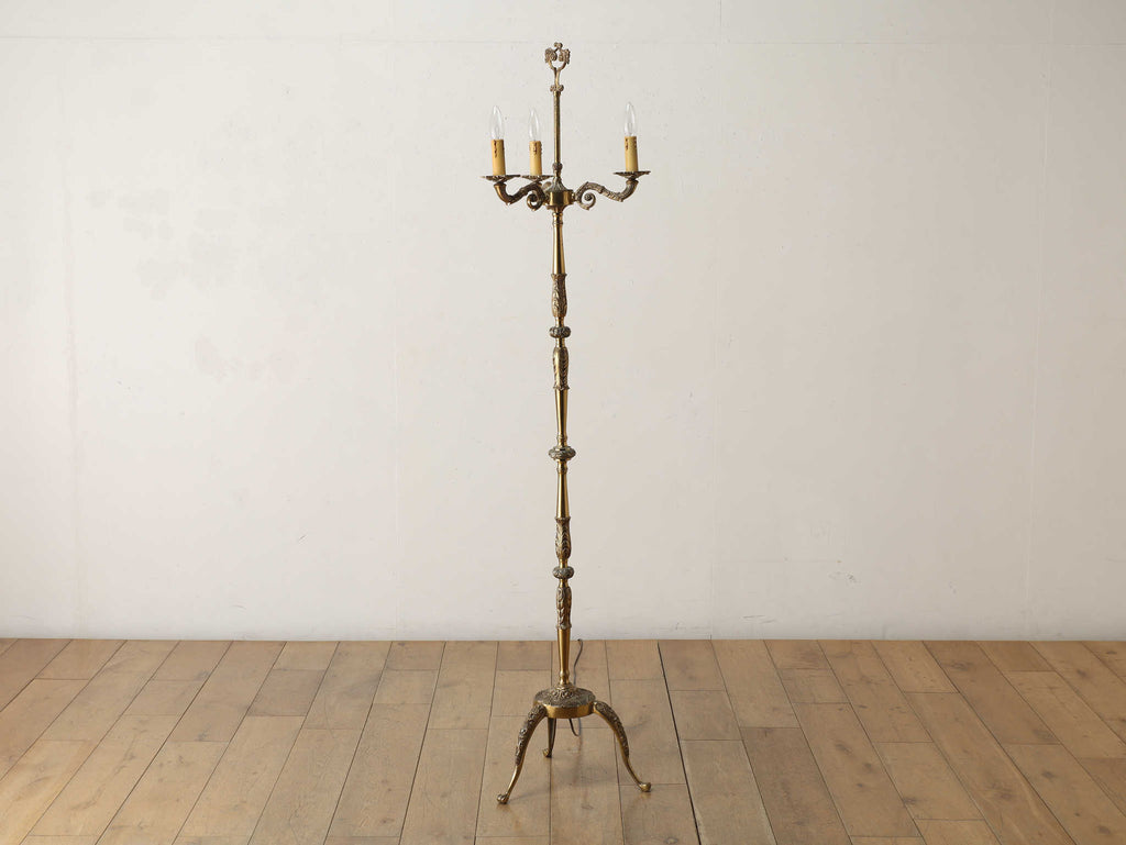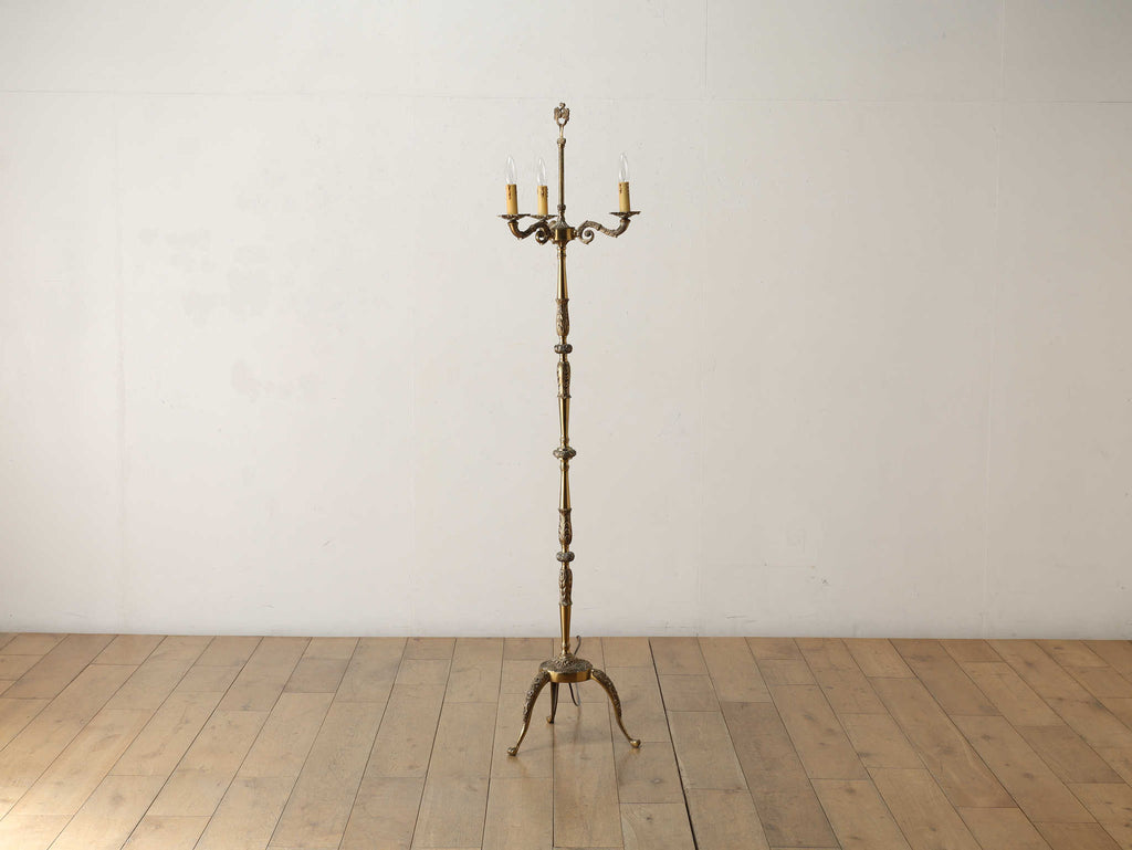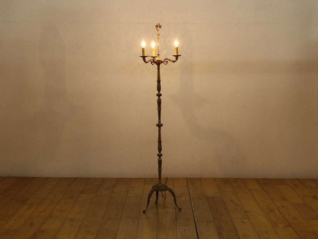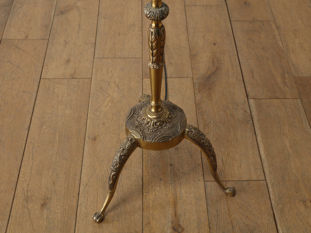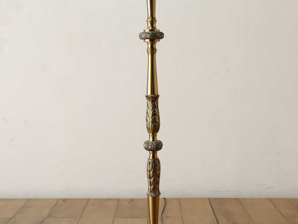 1960年代(推定)にフランスで製作された、フロアランプです。クラシカルな要素と、モダンデザインが交差するミッドセンチュリー期のフランスで育まれた、普遍的なデザイン性を持つ逸品です。支柱は優美な装飾で構成されており、経年による深い味わいがその歴史を物語っています。重厚な素材感でありながら、流麗な曲線を描くフォルムは空間に重々しさを与えすぎず、エレガントな存在感を放ちます。これは、当時の職人の卓越した技術と、装飾美へのこだわりを示すものです。また、このランプの真髄はその空間の主役となる存在感にあります。リビングや書斎はもちろん、モダンな店舗什器として配置すれば、瞬時にその場の雰囲気を格上げします。