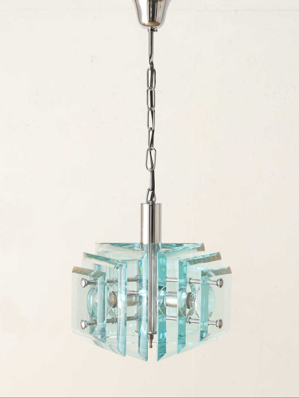 こちらはおよそ1970年代(推定)のイタリア製シーリングランプです。クリアとなガラスを組み合わせた、透明感あふれるデザインが特徴。重厚感がありながらも光を美しく透過させ、空間に洗練された輝きと広がりをもたらします。モダンなインテリアはもちろん、レトロフューチャーな雰囲気にも馴染み、天井を印象的に演出する希少なアイテムです。