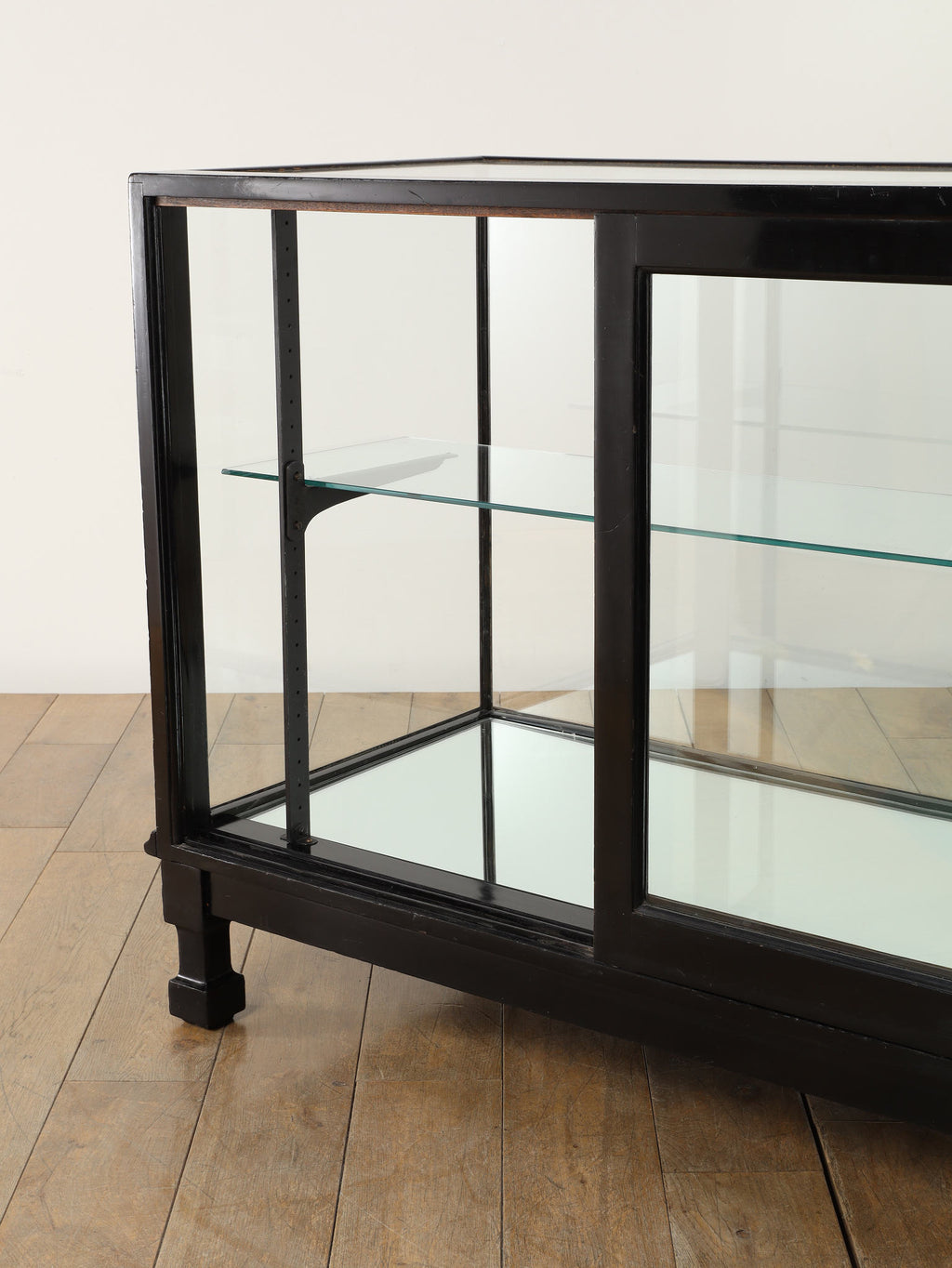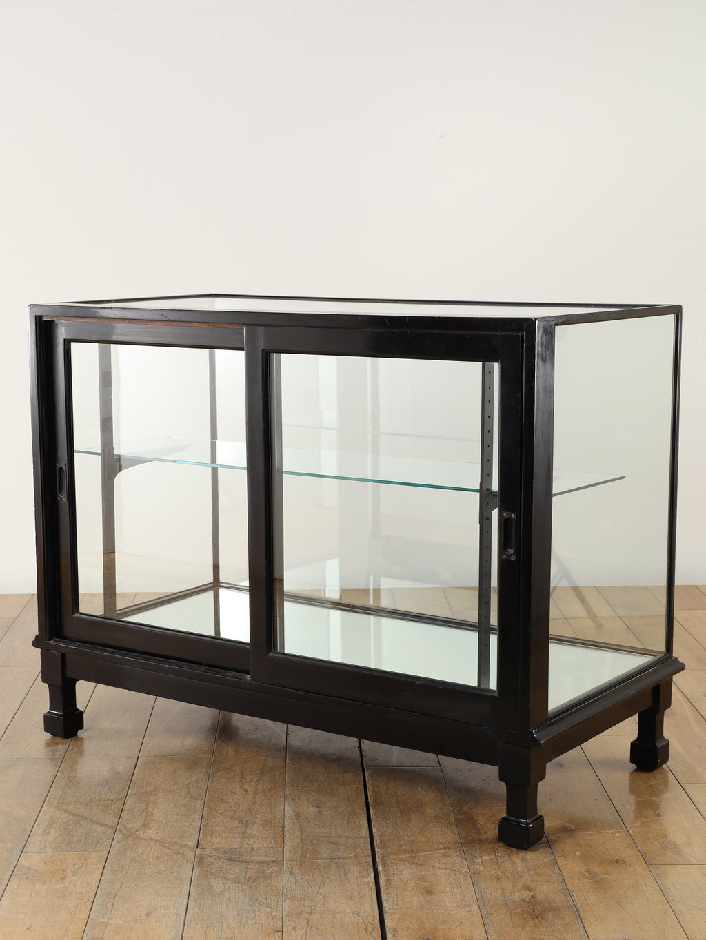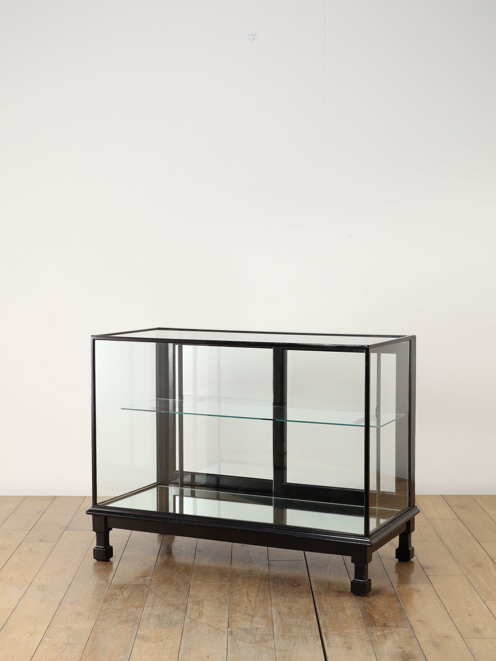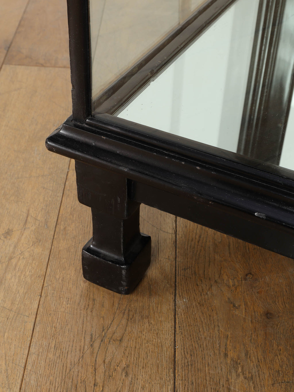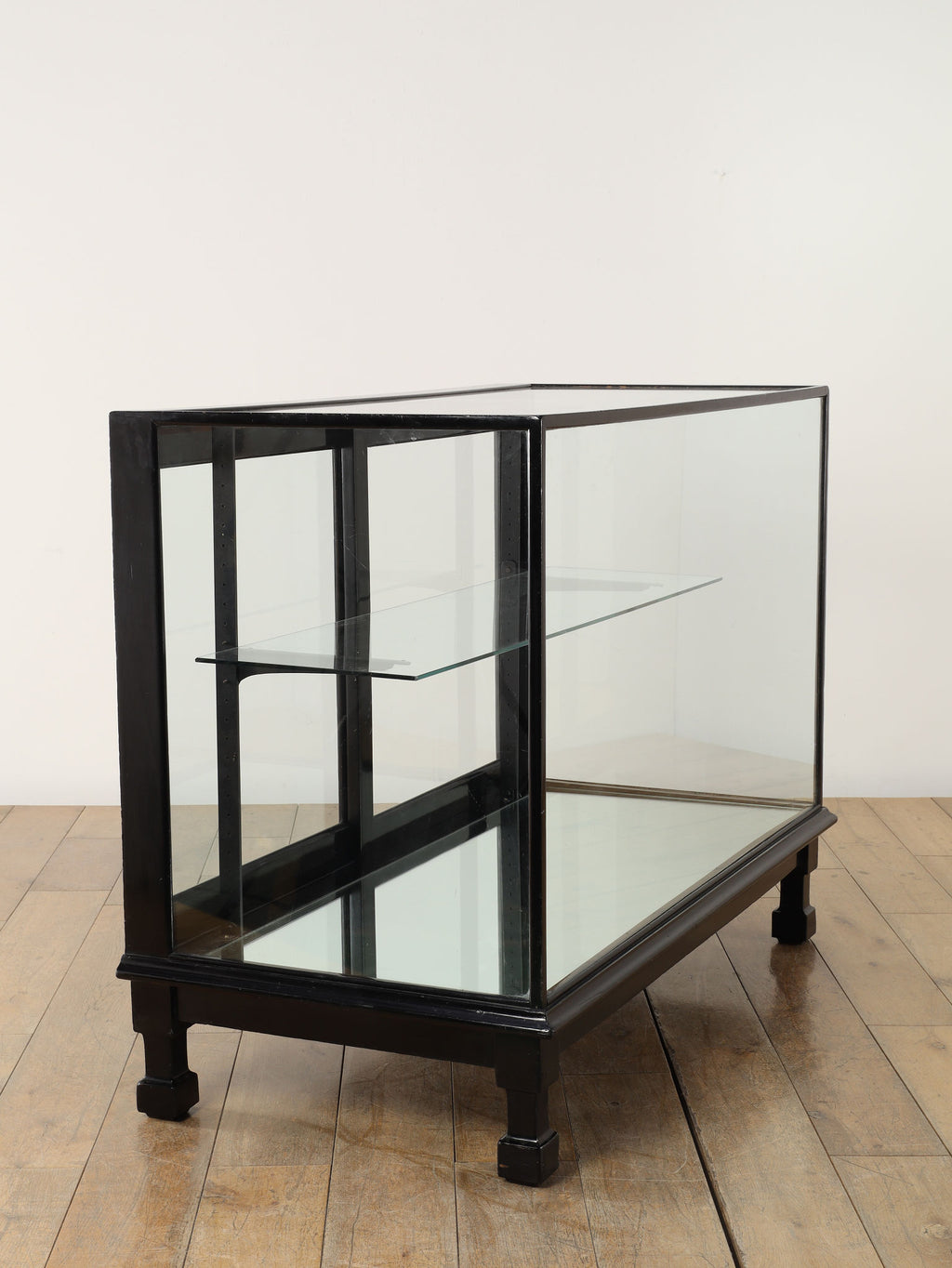 1920年代(推定)にイギリスで製作された、重厚なマホガニー製ショップカウンターです。アール・デコ様式が流行し始めた時代の空気感をまとい、当時の賑わいある店先を彷彿とさせる、非常に貴重な英国アンティークです。全体をブラックで塗装された木製フレームと、全体を囲む大きなガラス面が特徴です。艶やかな黒は、約100年の時を経てもなお、普遍的なデザイン性と深い味わいを保っています。ガラス越しに見せるディスプレイは、何を飾っても空間の主役となる存在感を発揮します。ご自宅のリビングや書斎でコレクションケースとして使用するのはもちろん、その格式高い佇まいは、ブティックやカフェなどの店舗什器としても理想的です。単なる家具ではなく、英国の商業史の一端を担ってきたこのカウンターは、歴史と風格をまとっています。