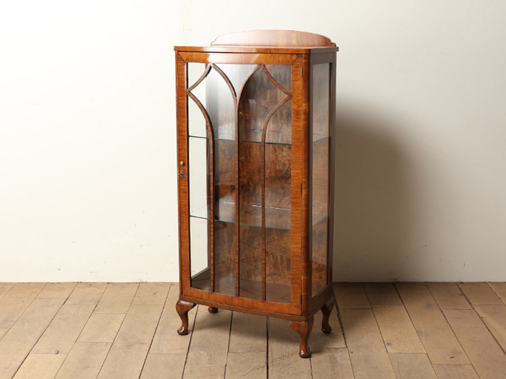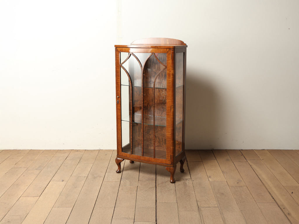 1930年代(推定)ウォルナット材 チャイナキャビネット。長きにわたる時を経てきたウォルナット材の深い味わいが、この英国アンティークの持つストーリーを伺わせます。特に目を惹くのは、木材の表面に現れる表情豊かな杢目。まるで芸術品のような美しい模様が、キャビネット全体に華やかさと深みを与えています。W580mm、D350mm、H1240mmと非常にコンパクトなサイズ感も魅力です。日本のお部屋にも取り入れやすく、設置する場所を選びません。大切な食器やコレクションを飾るディスプレイキャビネットとして、また、書籍や小物を見せる収納として、お部屋を格調高く彩ります。扉には、当時のオリジナルのガラスが、時代を超えて大切にされてきた証です。繊細な曲線を描くフレームデザインが、飾る物をより一層引き立てます。