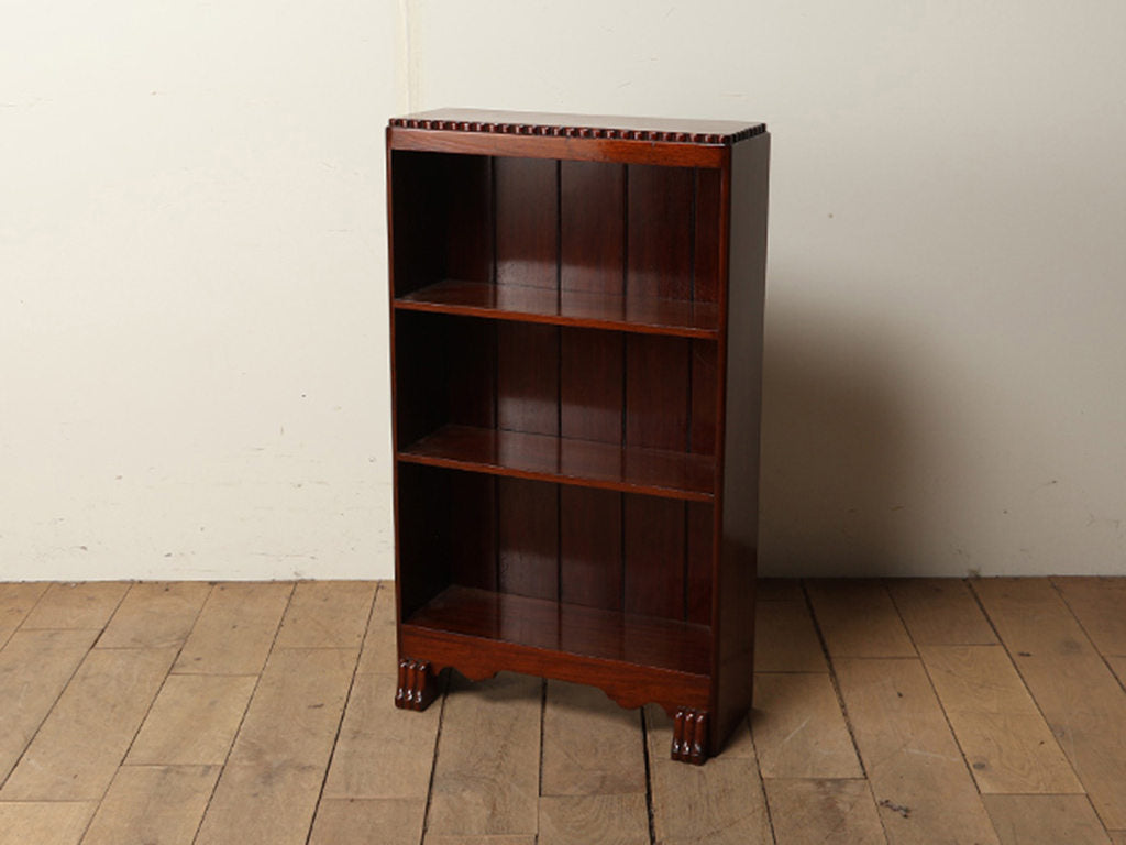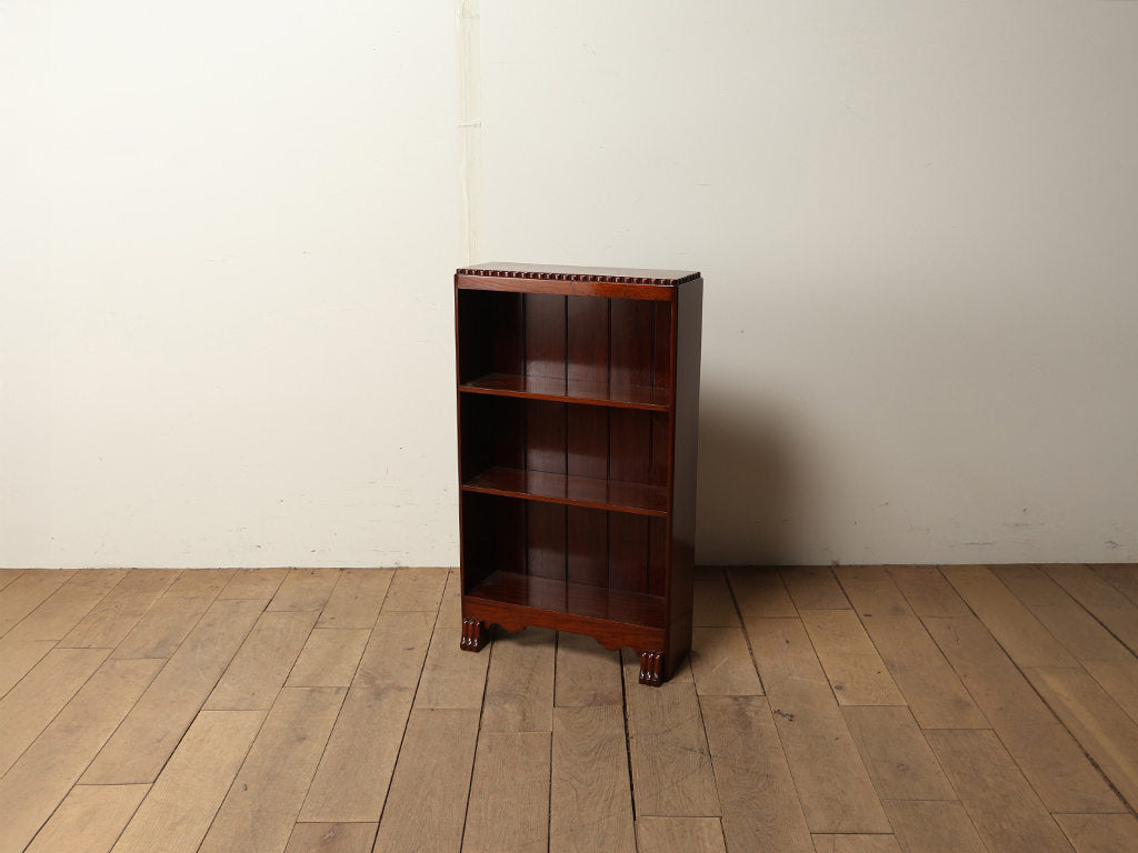 1910年代(推定)の英国で作られた、マホガニー材のブックシェルフ。シンプルで実用性の高いデザインながら、上部の繊細な縁取りや足元のデザインが程よいアクセントとなり、さりげない個性を感じさせます。深みのある赤褐色と美しい杢目は、マホガニーならではの魅力。書籍はもちろん、小物や雑貨のディスプレイにも活躍し、リビングや書斎に上質な雰囲気を添えてくれる一台です。クラシックスタイルや現代の家具にも合わせやすいアンティークとなっています。