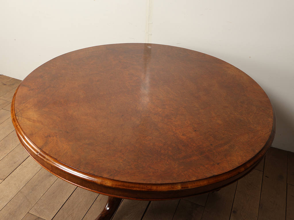 1880年代(推定)イギリス製。W1450mm、D1050mm。この堂々たるサイズのテーブルは、ヴィクトリア朝後期の贅沢な邸宅で使われたブレックファストテーブルです。天板は、息をのむほど美しいバールウォルナット(瘤材)の化粧単板。百数十年の時を経て、深みを増した飴色の艶(パティナ)が光を反射し、まるで水面のような複雑な木目を浮かび上がらせます。