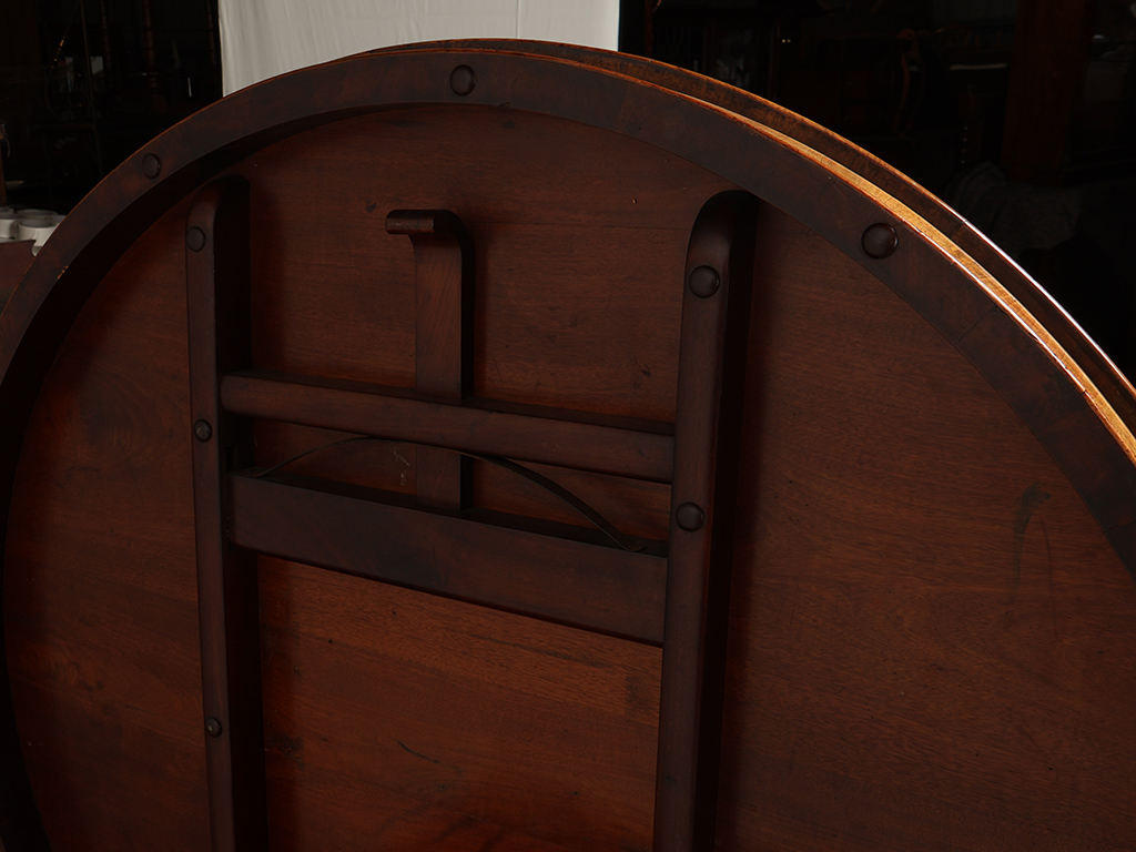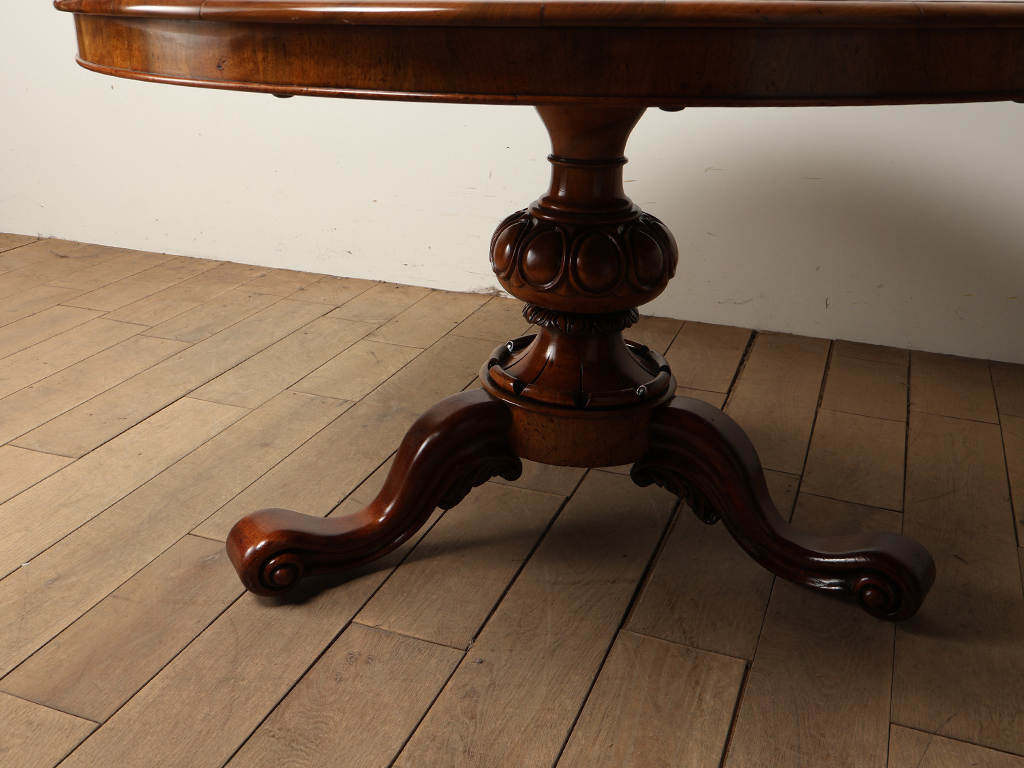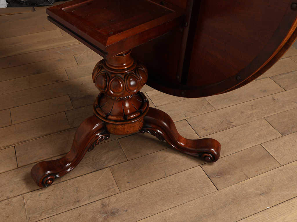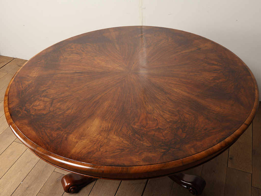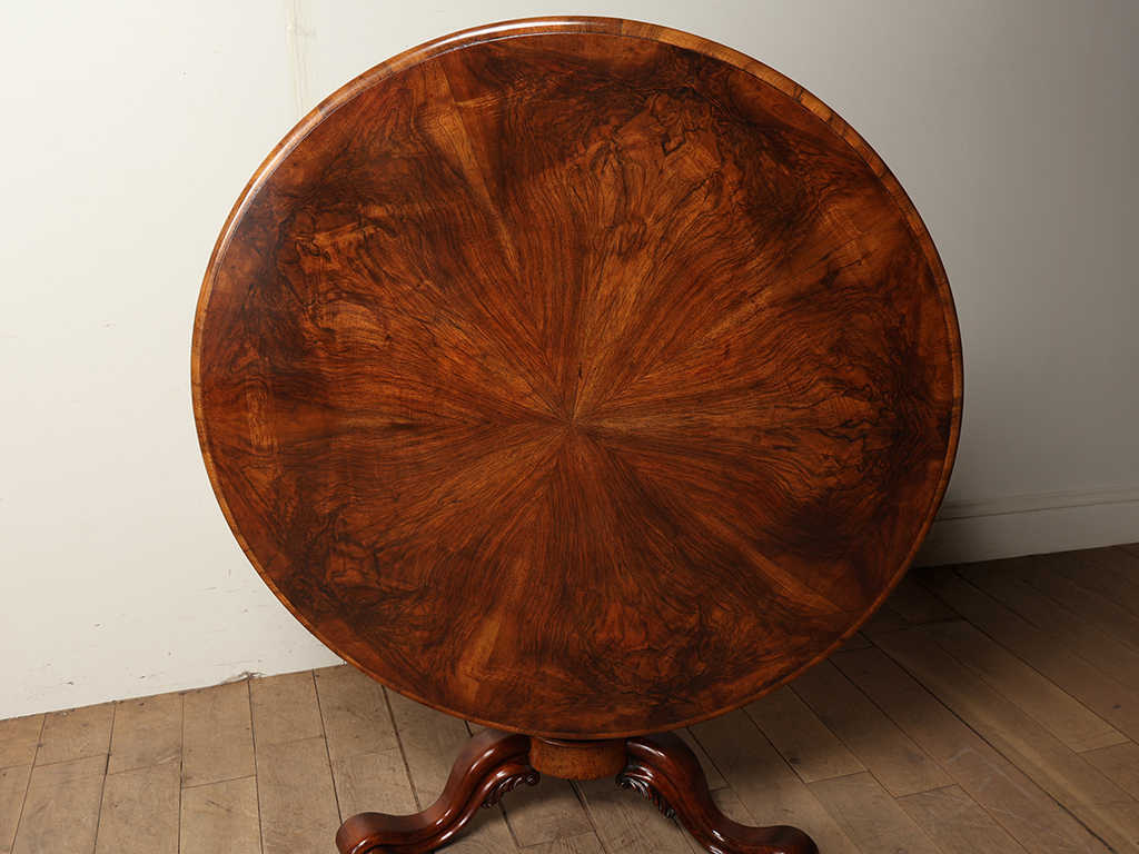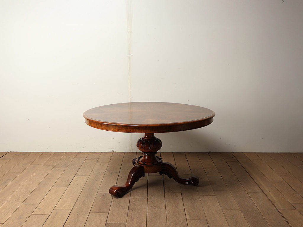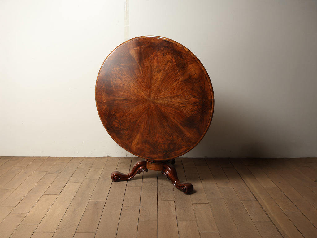 1860年代(推定)ヴィクトリア朝中期、最高の贅を尽くしたイギリス製のテーブルです。サイズは、W1220mm D1220mm H735mmです。天板には稀少なバールウォルナット材が放射状に貼り合わされ、光を放つような美しいサンバーストの杢目を持ちます。中央のペデスタルには豪華な彫刻、脚部には優雅なカブリオールレッグが施され、重厚さと華やかさを兼ね備えています。使用しない際は天板を立てて収納できるティルトップ式で、実用性と美術性を両立させた「宮廷家具」クラスの至高の一品です。