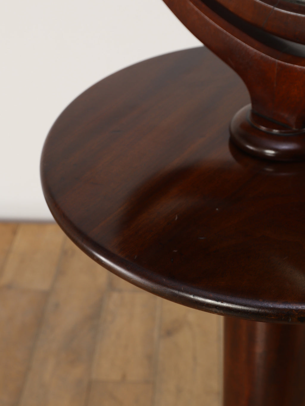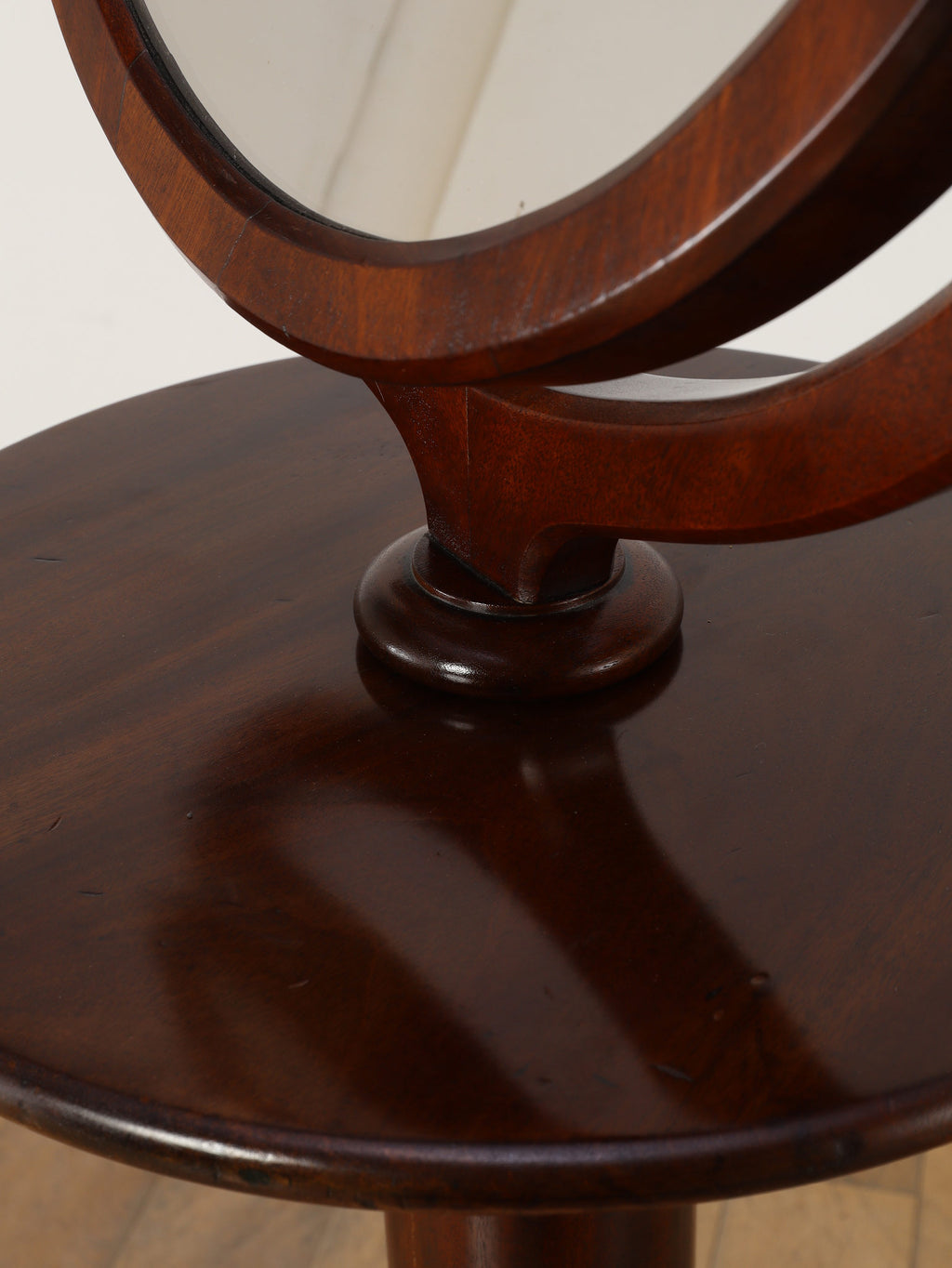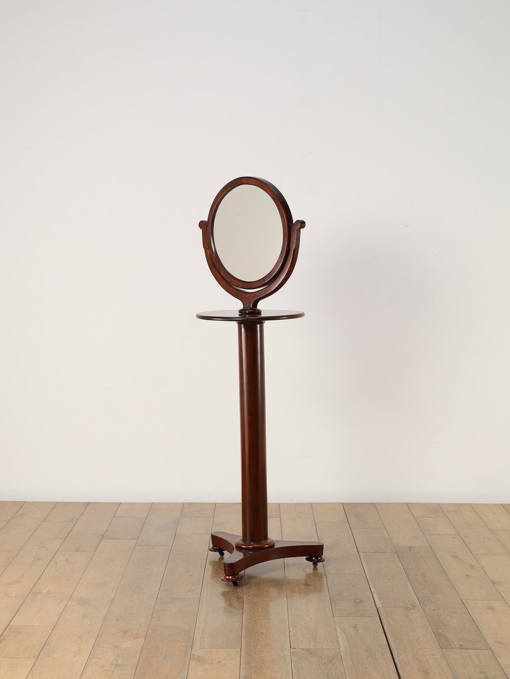 1880年代(推定)のイギリスで作られた丸みのある柔らかいディテールで、様々な空間で扱いやすいシェービングスタンドです。その名の通り「ひげ剃り」を連想されますが、簡易的なドレッサーとしてや、身だしなみを整えるものとして扱われておりました。機能性もありつつ、マホガニーの艶やかな杢目が美しいため、そこにあるだけで日常が豊かになるようなアンティークの存在感を実感できる逸品です。
