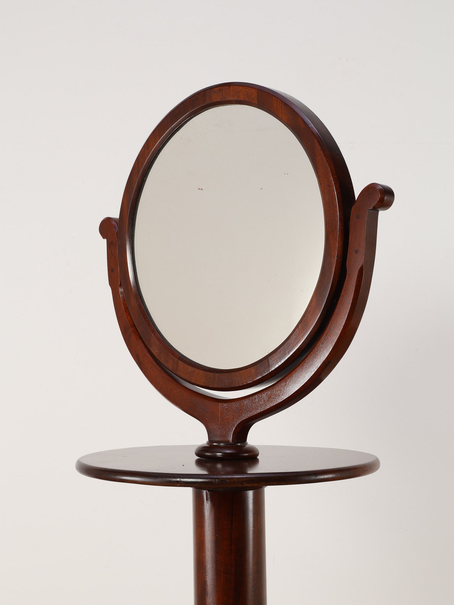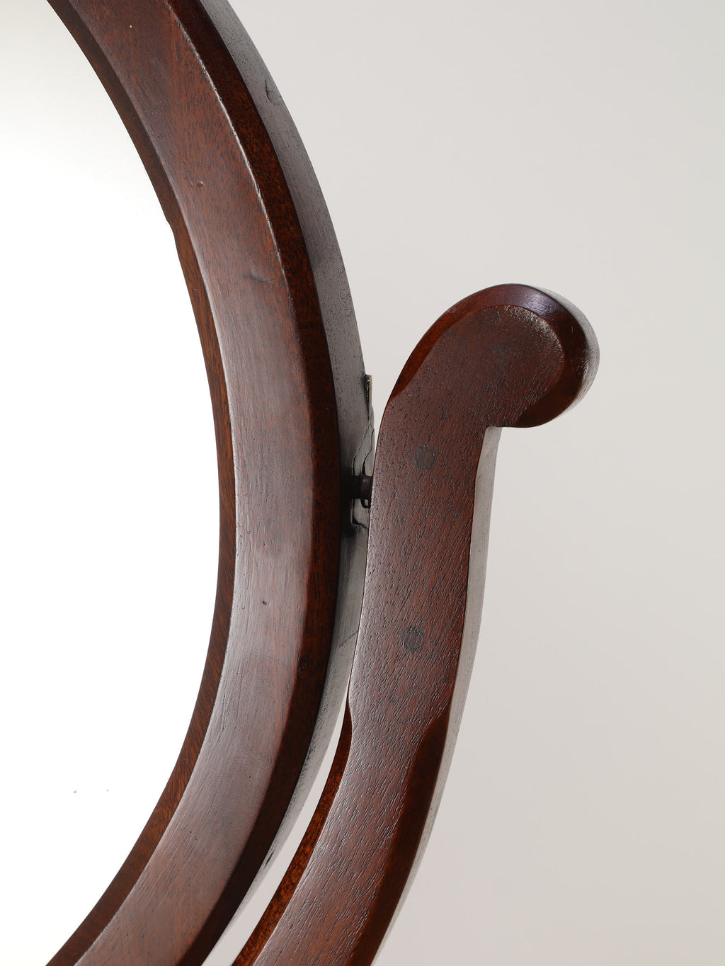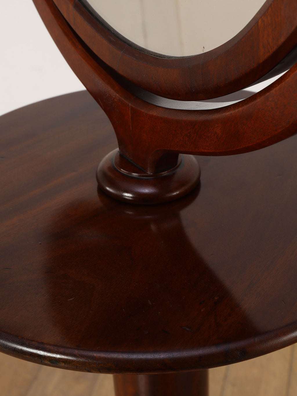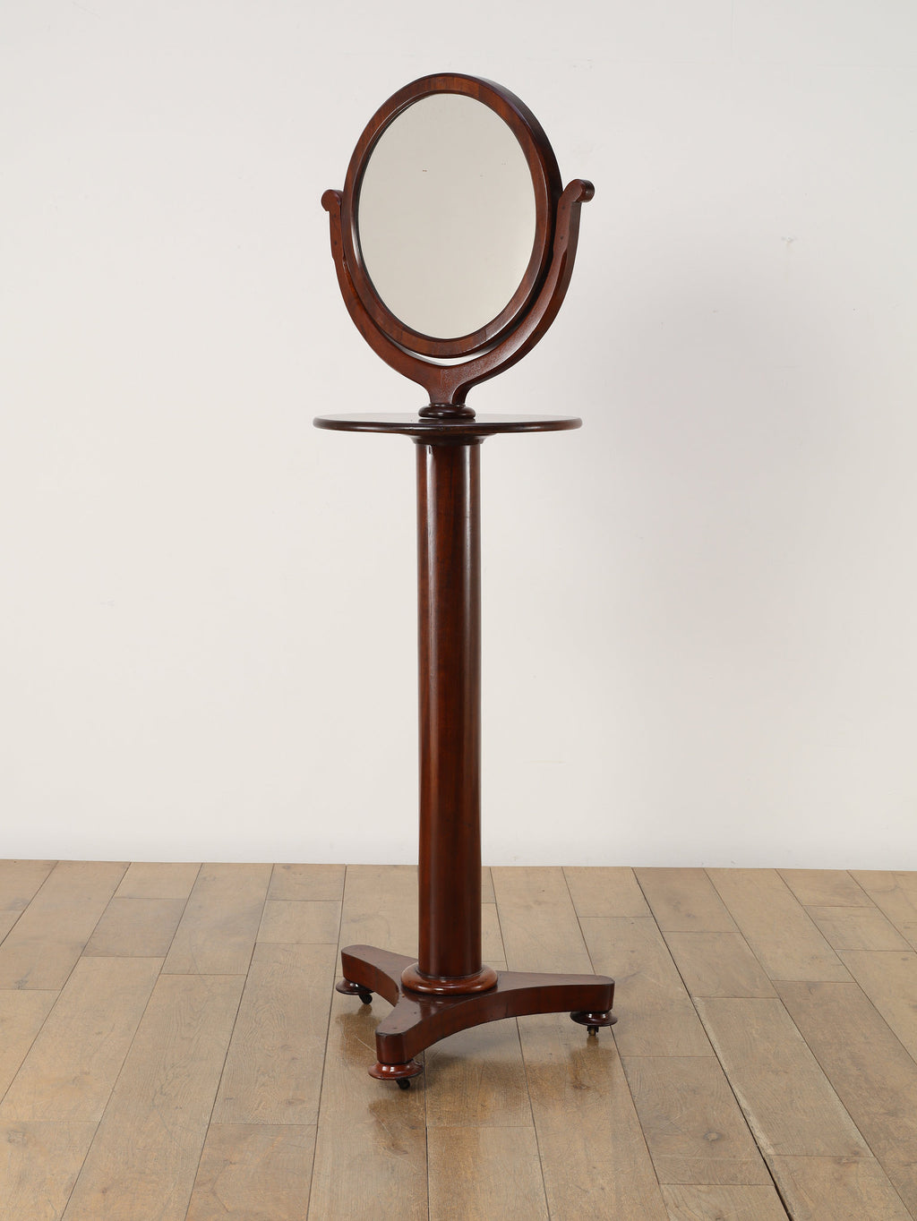 1880年代(推定)のイギリスで作られた丸みのある柔らかいディテールで、様々な空間で扱いやすいシェービングスタンドです。その名の通り「ひげ剃り」を連想されますが、簡易的なドレッサーとしてや、身だしなみを整えるものとして扱われておりました。機能性もありつつ、マホガニーの艶やかな杢目が美しいため、そこにあるだけで日常が豊かになるようなアンティークの存在感を実感できる逸品です。