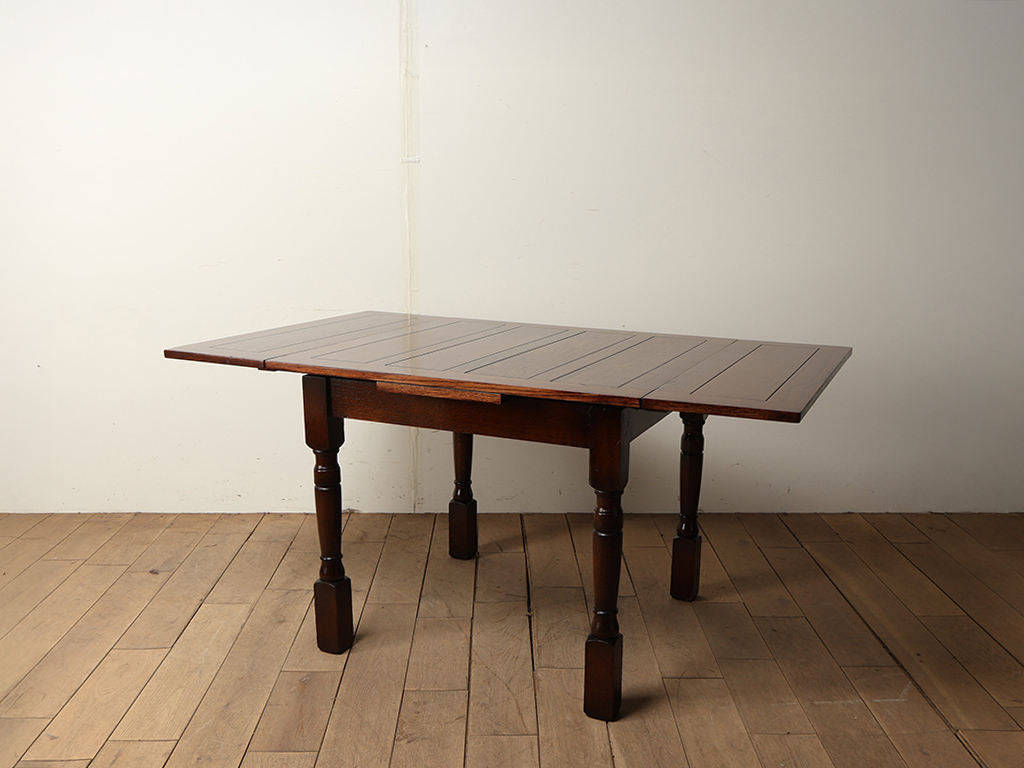 英国アンティークを代表する家具であるドローリーフテーブル。メインの天板の下に収納されたサブの天板を引き出すことで、サイズが変わる機能を備えた伸長式のテーブルです。左右それぞれに拡張する天板が備わっておりますが、片方だけ伸ばしても天板のレベルがフラットになり、3段階のサイズ調整が可能です。16世紀頃にこの構造を備えた大きなサイズのテーブルが流行しましたが、一度ダウントレンドを辿ります。その後、19世紀頃に都市部の人口増に伴い、生活空間が狭くなった環境の変化から再度この構造が見直されたことにより、小さいサイズのものがリバイバルされ、多くのテーブルが生産されました。900mmの正方形がスタンダードなサイズであり、その適度なサイズと取り回しのしやすさが現代の住環境にマッチし、アンティークの定番として現在に至ります。素材は堅牢なオーク材が用いられる事が一般的であり、デイリーでお使い頂くことでより味わいが増していく点においても、アンティークを使用する楽しみを感じて頂けることでしょう。脚部は大きく4本脚のタイプと「H型」の2本脚タイプに分類され、チェアの合わせ方や空間のレイアウトに合わせてそれぞれのメリットをセレクトする事が可能です。こちらの4本脚タイプは堅牢な構造であり、ラウンドテーブルのような4方向からテーブルを囲むレイアウトがお勧めです。脚部にはそれぞれのキャラクター性を表現する様々なデザインが存在し、好みのスタイルを探す楽しみが詰まった一台です。