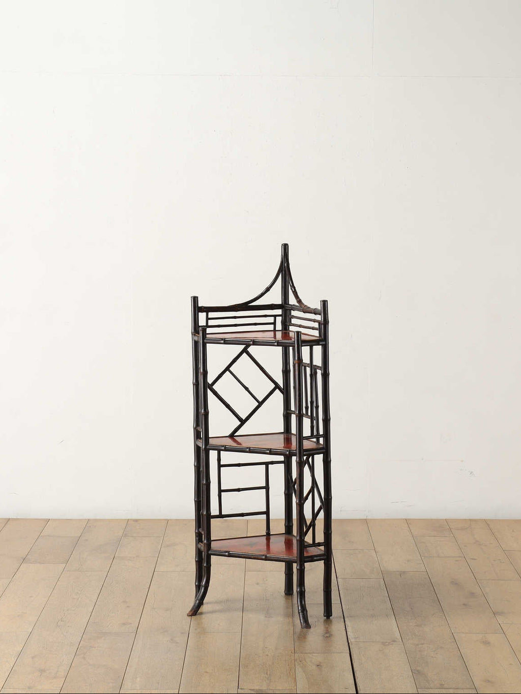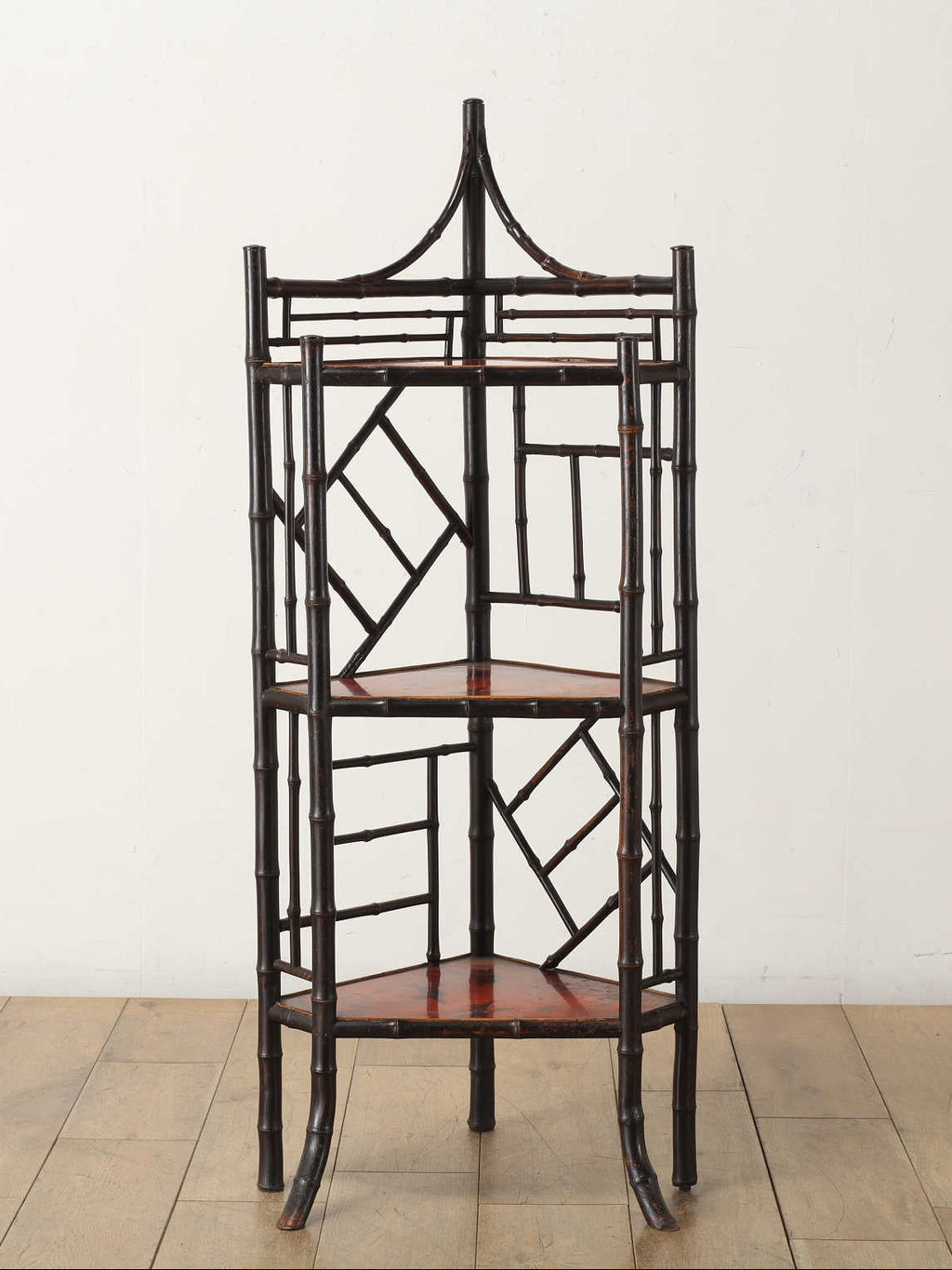 フランス語で「中国趣味」を意味するシノワズリ。ヨーロッパと東洋のデザインが融合した様式は、唯一無二の雰囲気を感じさせます。こちらは、シノワズリデイスとのコーナーシェルフで、赤い天板とそこに施された絵もポイントになっています。アンティークのある空間はもちろんの事、現代の居住空間においてもそのキャラクター性を存分にお楽しみ頂ける事でしょう。