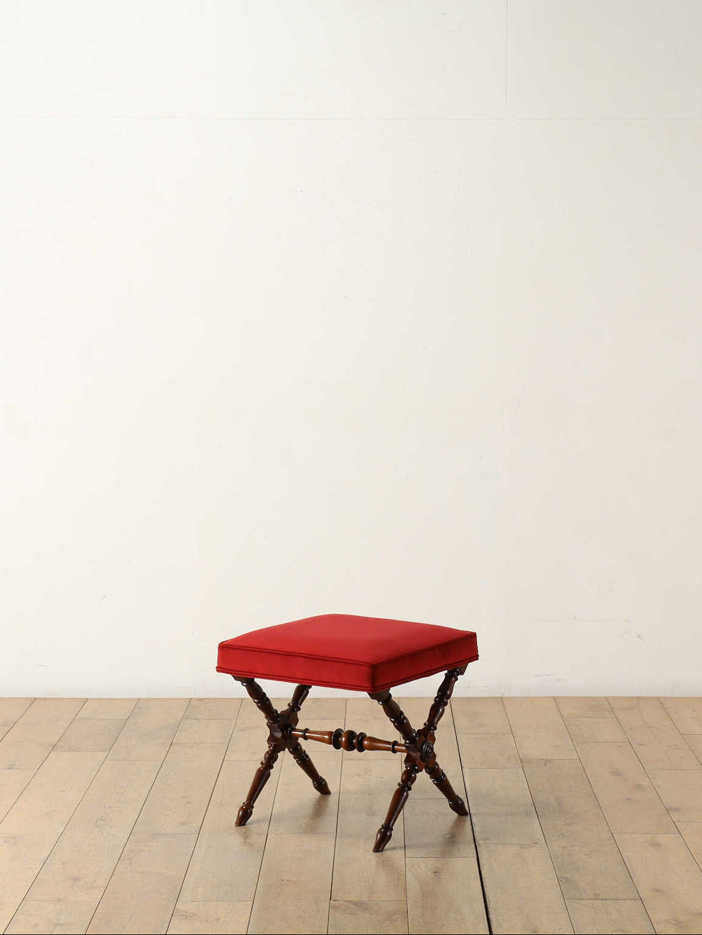 アンティークアイテムでは少しめずらしいX字型の脚からなるスツール。見事な脚の装飾は木材を回転させて形をつくる、挽き物細工によるもので、脚部の強度を上げる「貫」と呼ばれる部分にもこの挽き物細工による装飾が施され、細部にまでこだわりを感じることができます。場所を取らず、様々なシーンでお使いいただけるサイズで、リビングやベッドルーム、玄関先など、お好きな場所に取り入れていただけるアイテムです。【ファブリック】