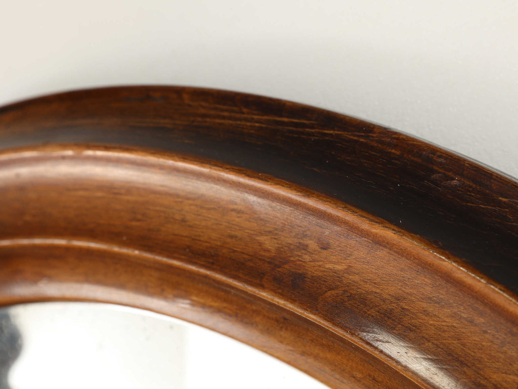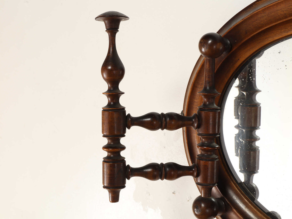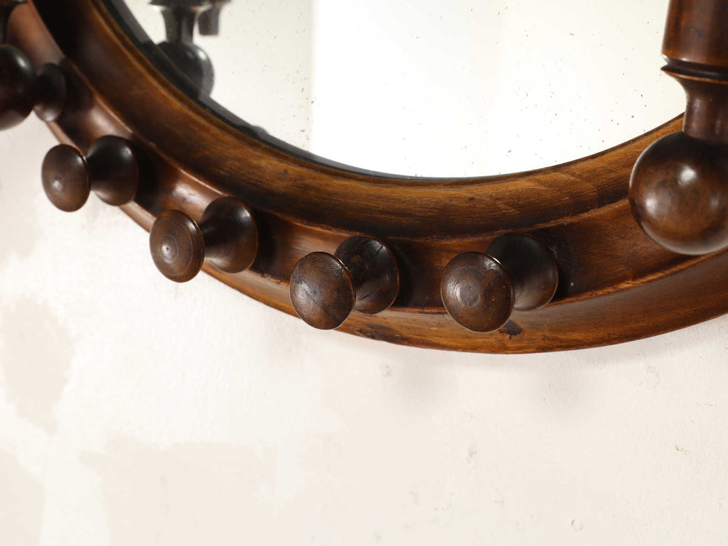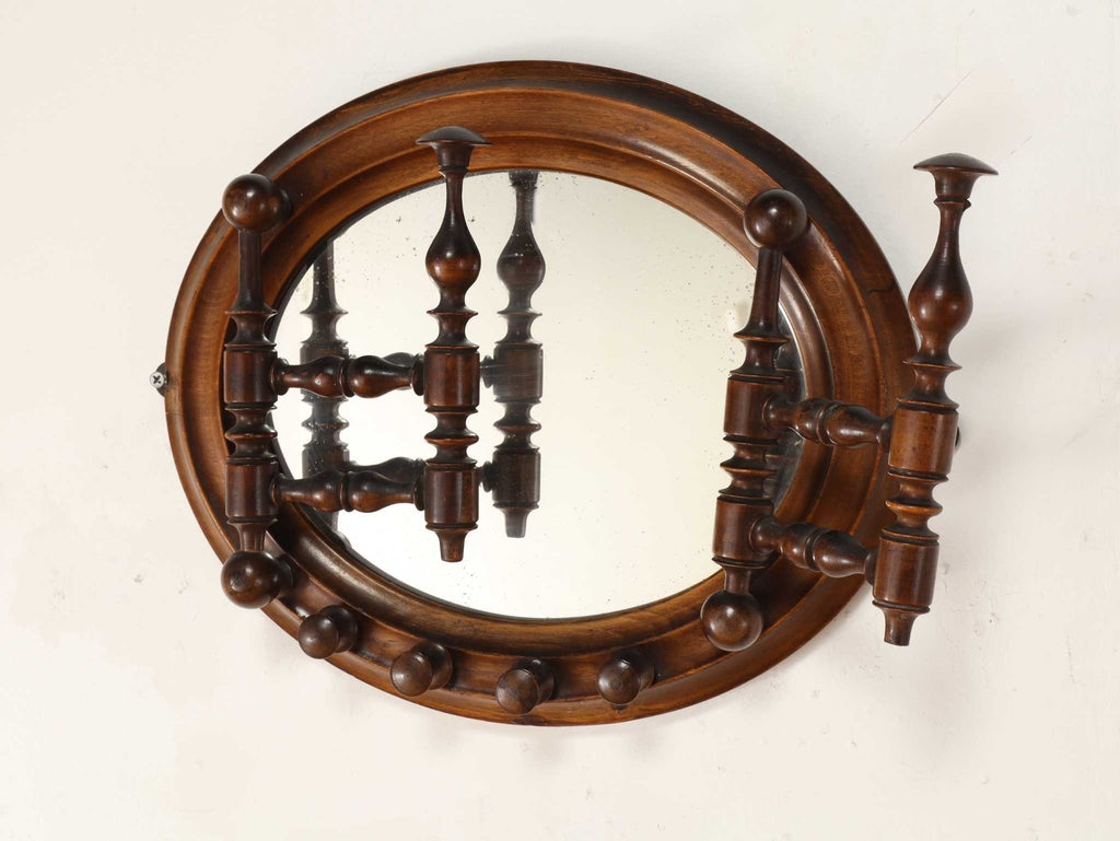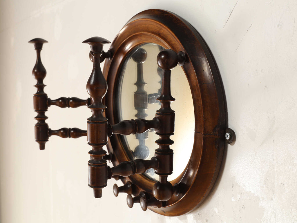 イギリスで1910年代(推定)に製作された、クラシカルで重厚感あるフック付きのミラー。美しい木製のフレームは丁寧に削り出された挽き物細工で装飾されており、時代を感じさせる優雅な佇まいが魅力です。中央にはオーバル型のミラーを配置し、空間に奥行きを与える視覚効果も。左右にはコートや帽子を掛けられる実用的なフックが付いています。玄関や廊下、ベッドルームのアクセントに最適で、使い勝手の良さと装飾性を兼ね備えています。英国らしいクラフトマンシップが詰まった、実用的かつインテリア性の高いアイテムです。年代物ならではの特別感と存在感を、ぜひ日常の空間に取り入れてみてください。