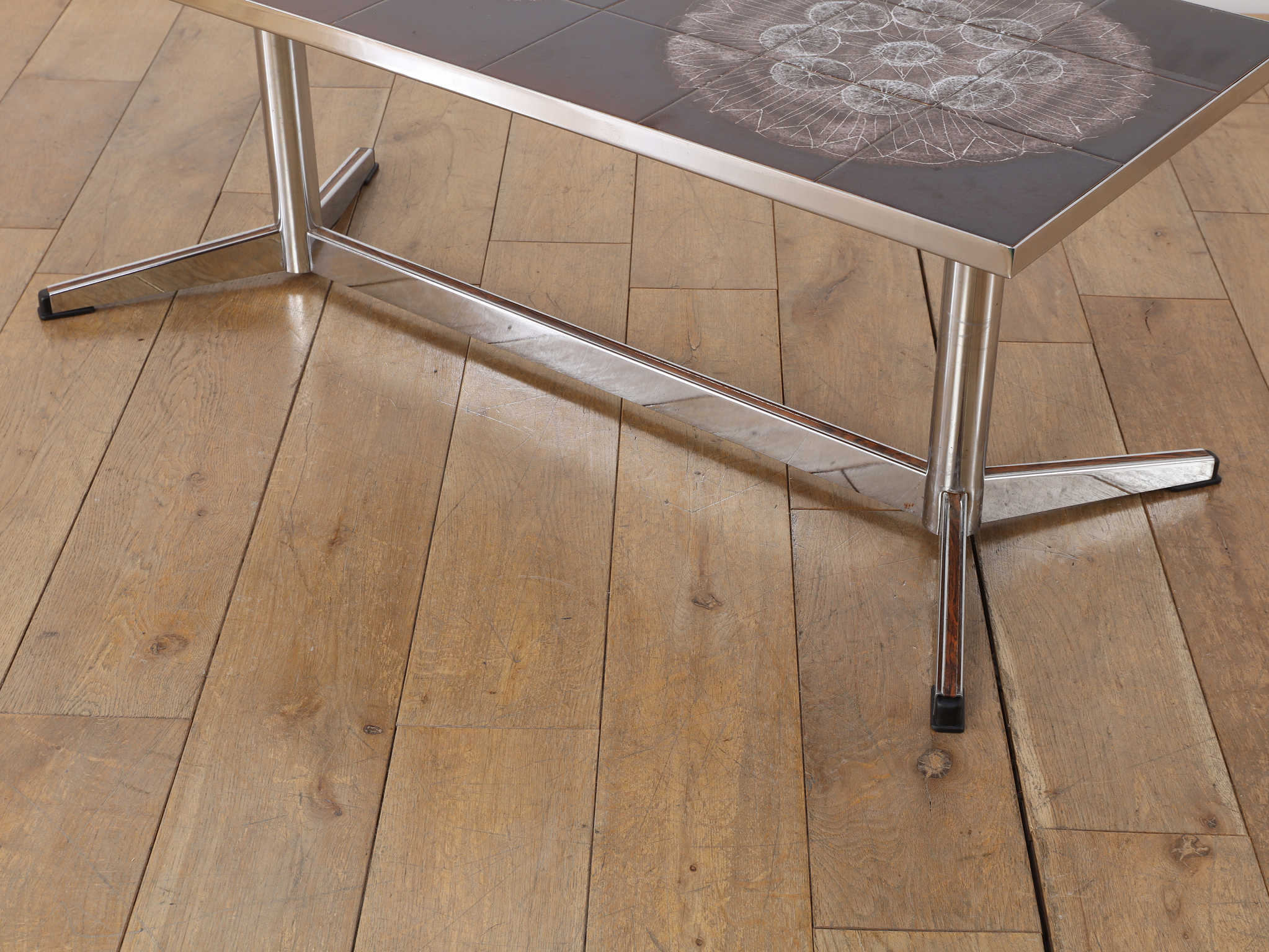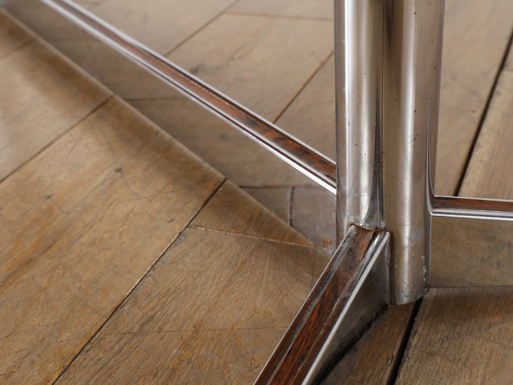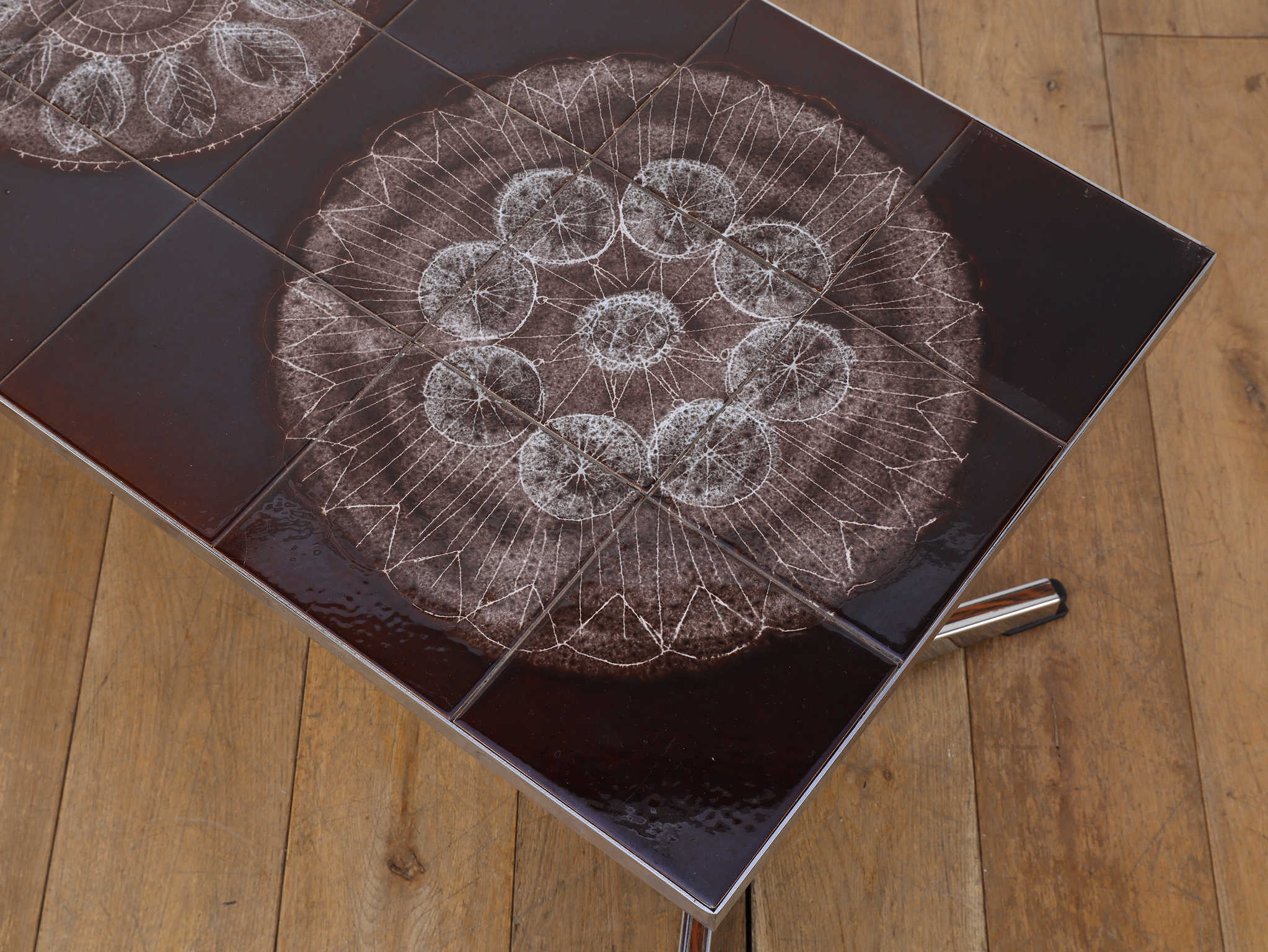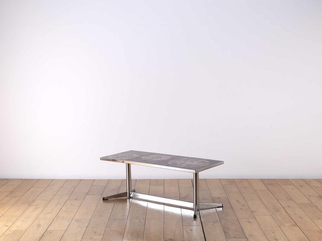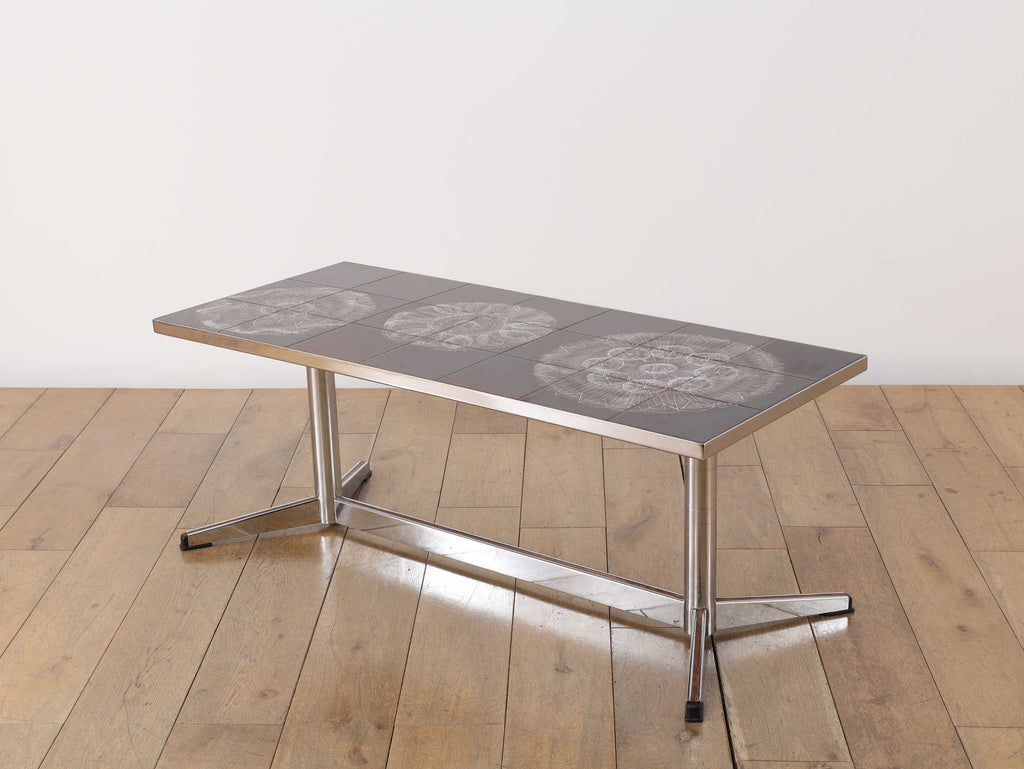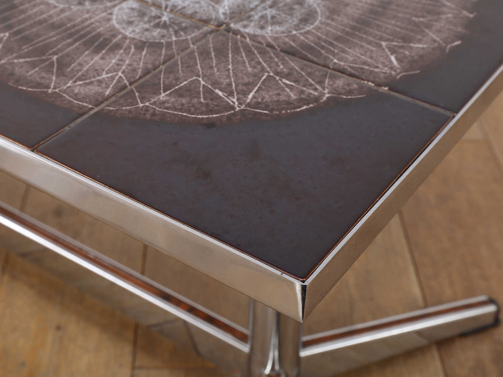 クロム素材のエッジの効いたコーヒーテーブル。植物モチーフと落ち着いた色合いの天板は、お部屋のアクセントとして活躍します。クロムフレームは洗練された印象を与え、木材の家具が多い中で、敢えて異素材のアイテムを選ぶことで部屋全体に締まりがでます。インテリアに個性を演出し、唯一無二の空間をお愉しみください。
