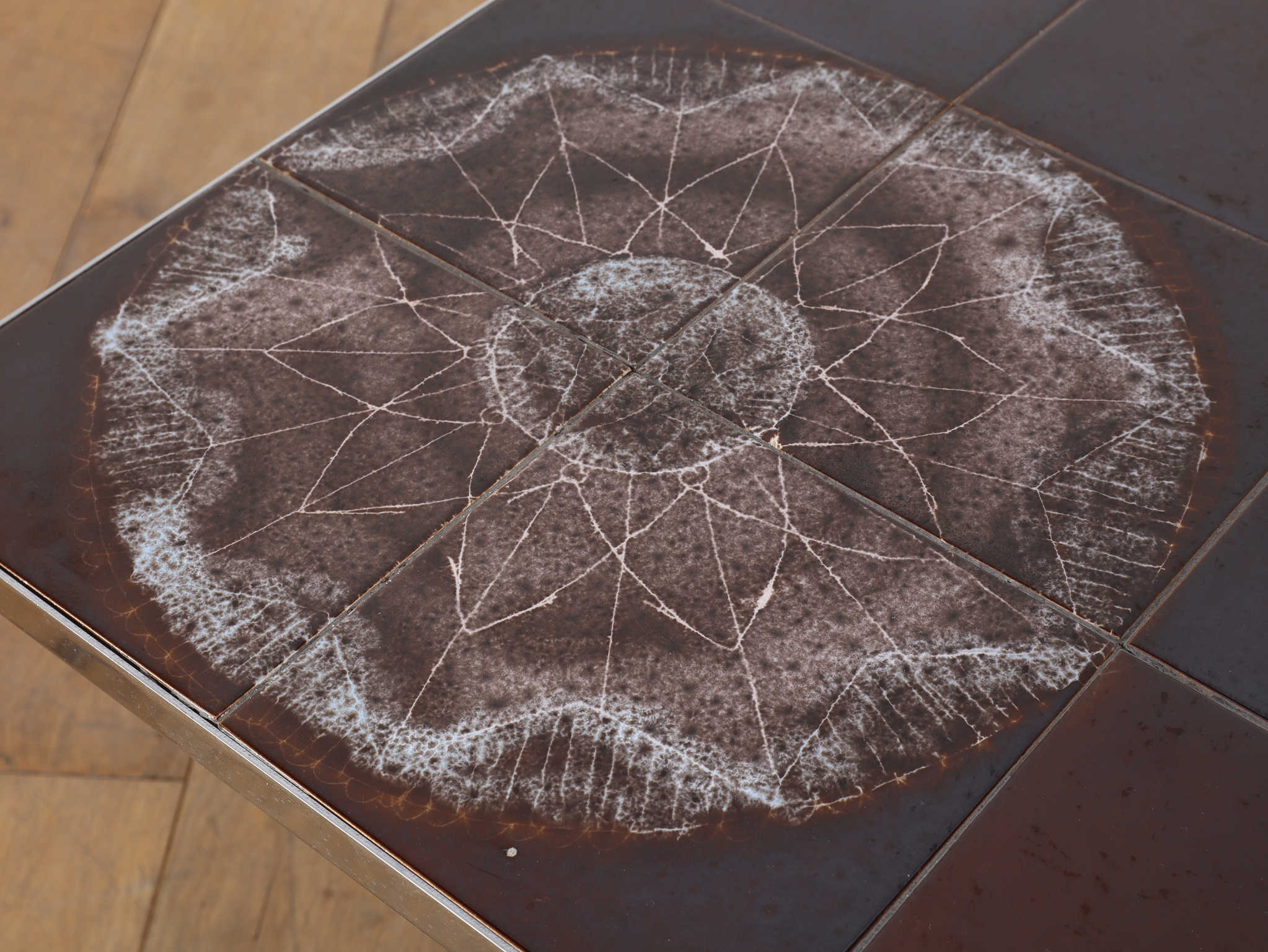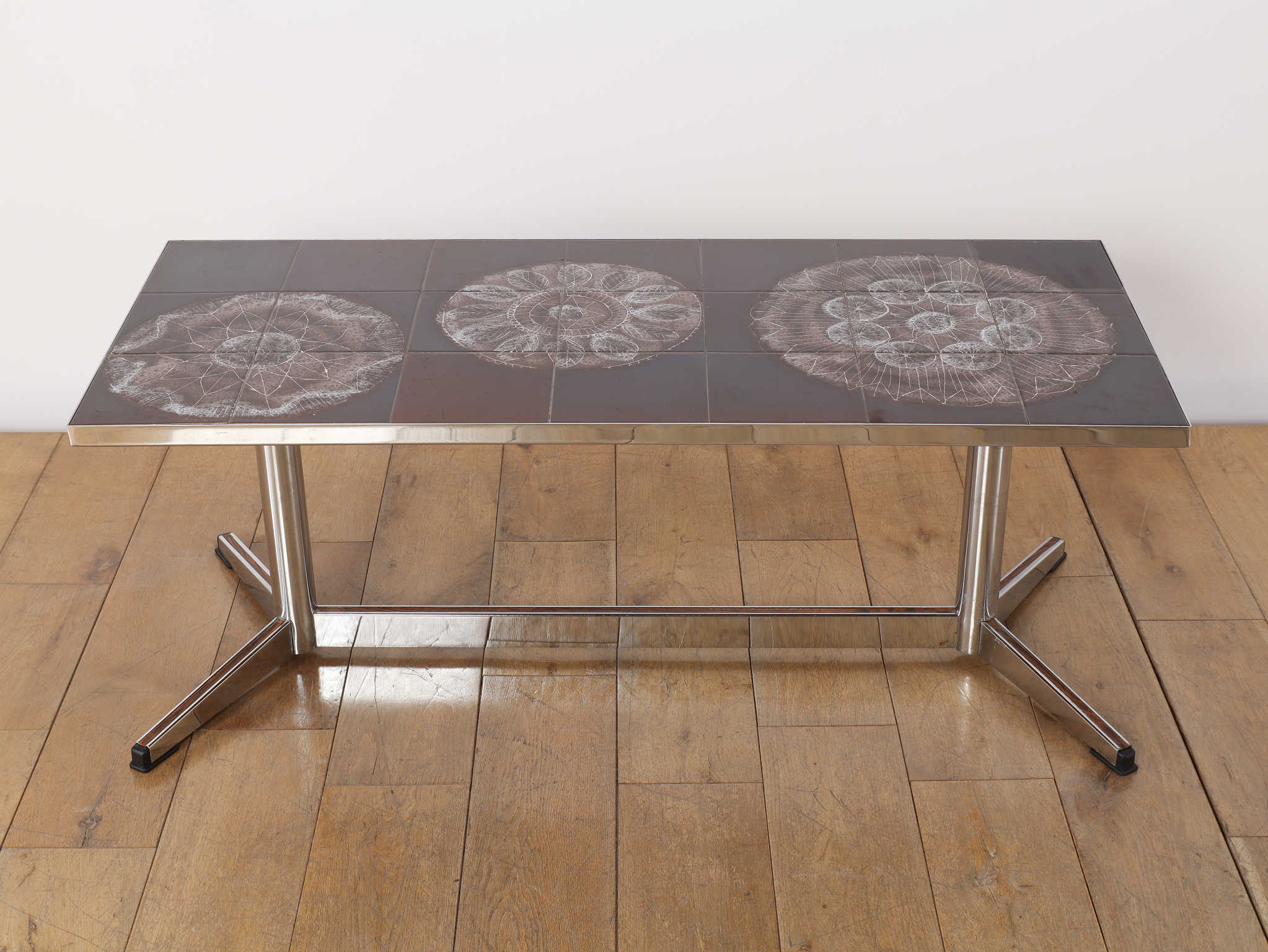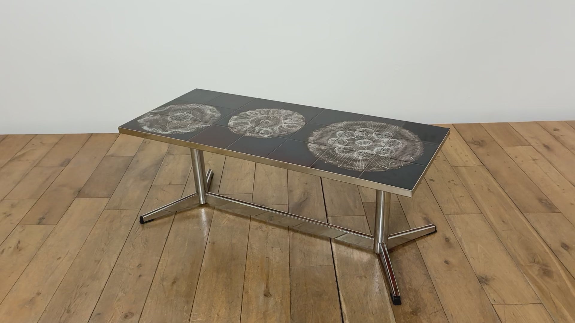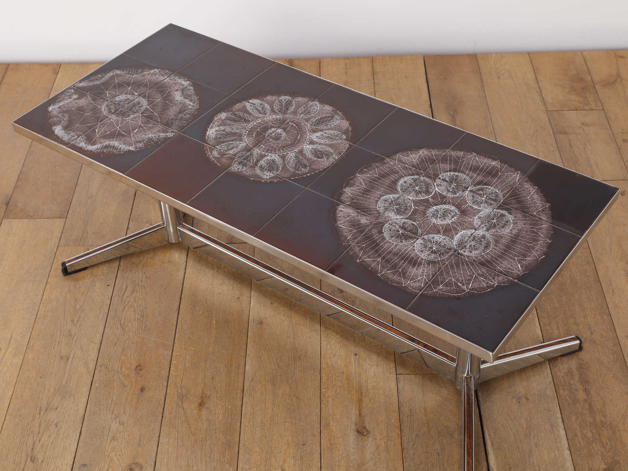 クロム素材のエッジの効いたコーヒーテーブル。植物モチーフと落ち着いた色合いの天板は、お部屋のアクセントとして活躍します。クロムフレームは洗練された印象を与え、木材の家具が多い中で、敢えて異素材のアイテムを選ぶことで部屋全体に締まりがでます。インテリアに個性を演出し、唯一無二の空間をお愉しみください。