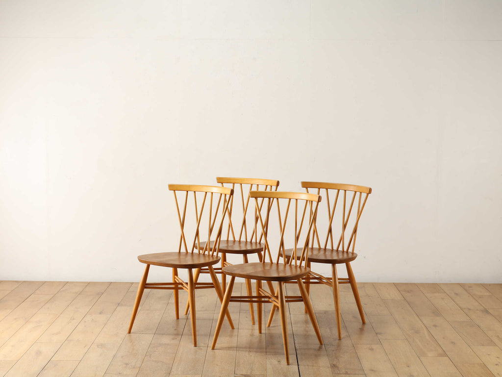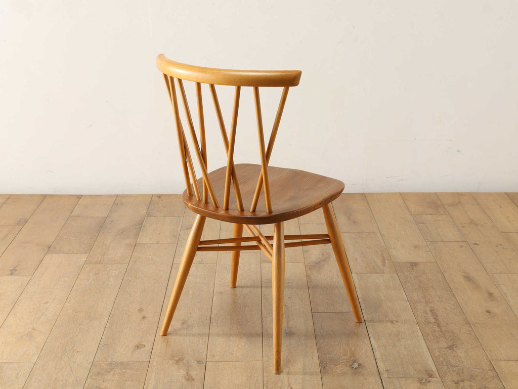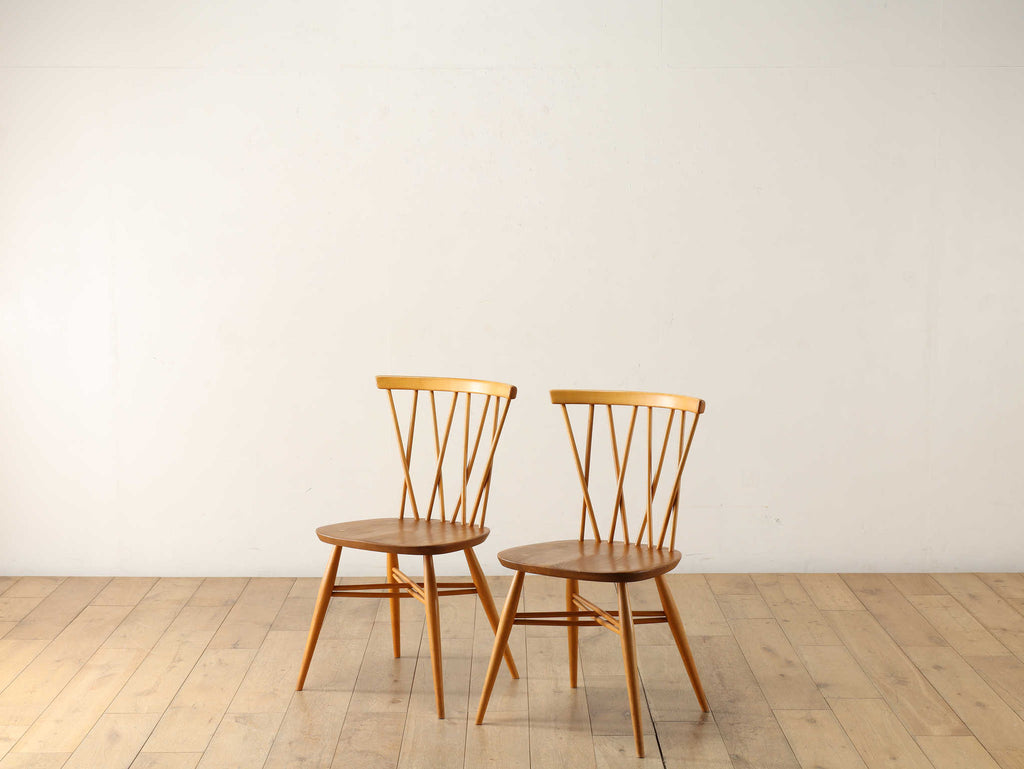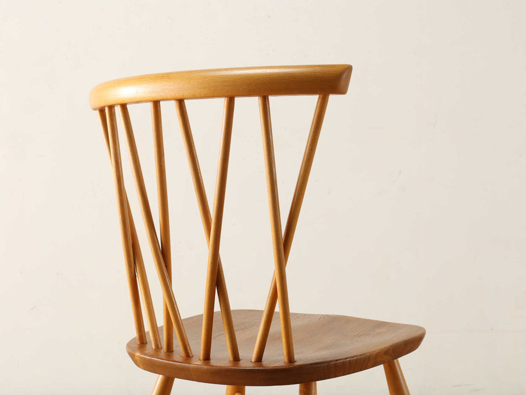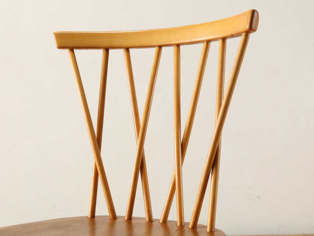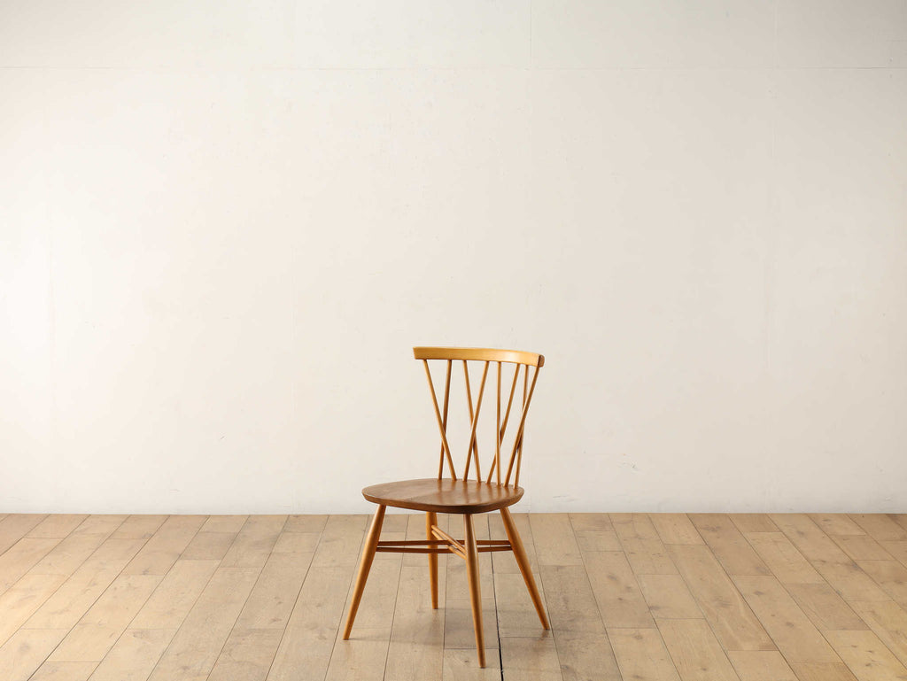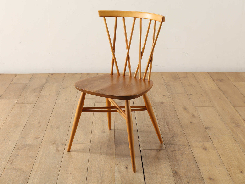 英国ミッドセンチュリーを代表とするERCOL社が誇るタイムレスな美しさを放つクロスバックチェアです。背面に交差したスピンドルのデザインは、シンプルでありながら印象的でどの角度から見ても美しく、空間に軽やかなアクセントを加えてくれます。滑らかな曲線、手に馴染む柔らかな質感、安定感のある座り心地の良さは、アーコール社が培ってきた木工技術の高さを物語っています。現代インテリアとの相性もよく、アンティーク/ヴィンテージを始める最初の家具としてもお薦めです。ただ置いてあるだけで絵になるチェアでお部屋を彩ってみてはいかがでしょうか。