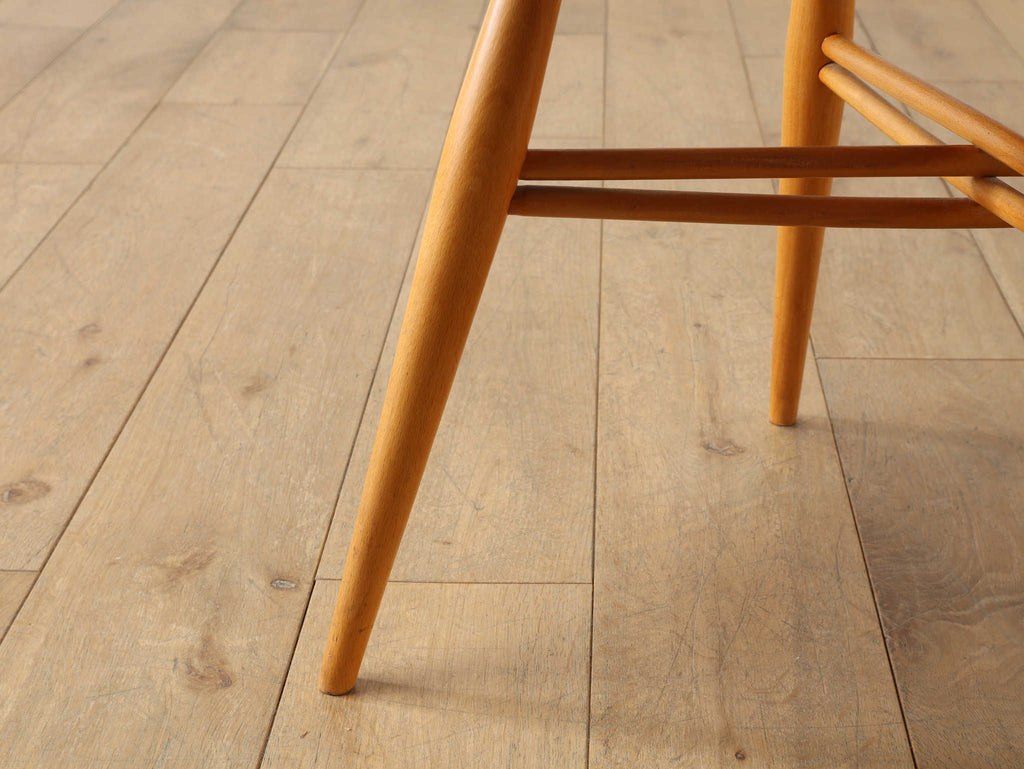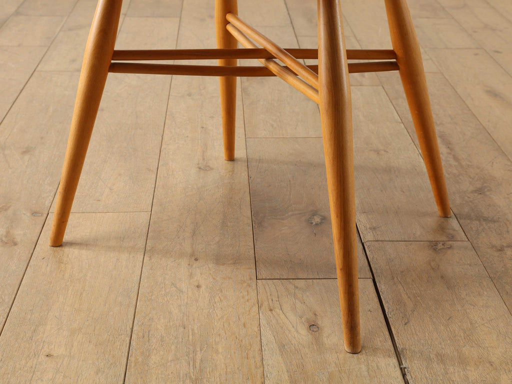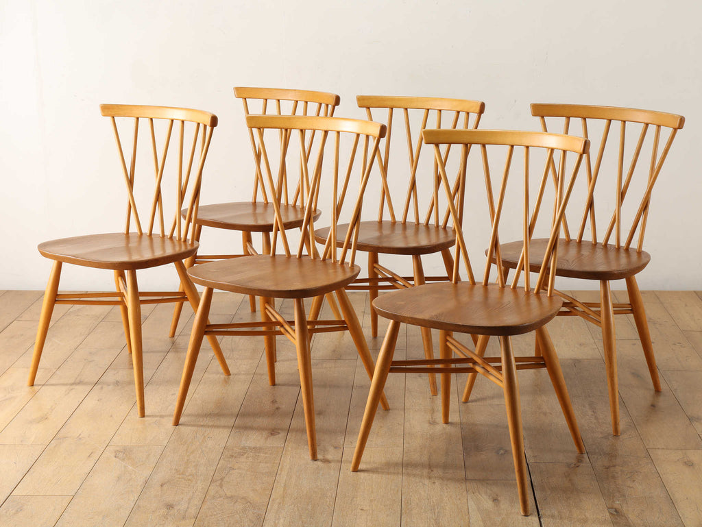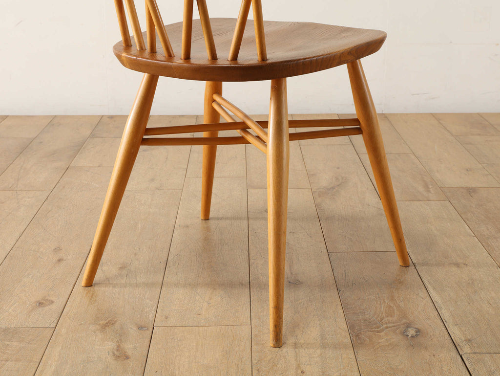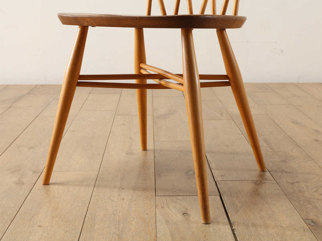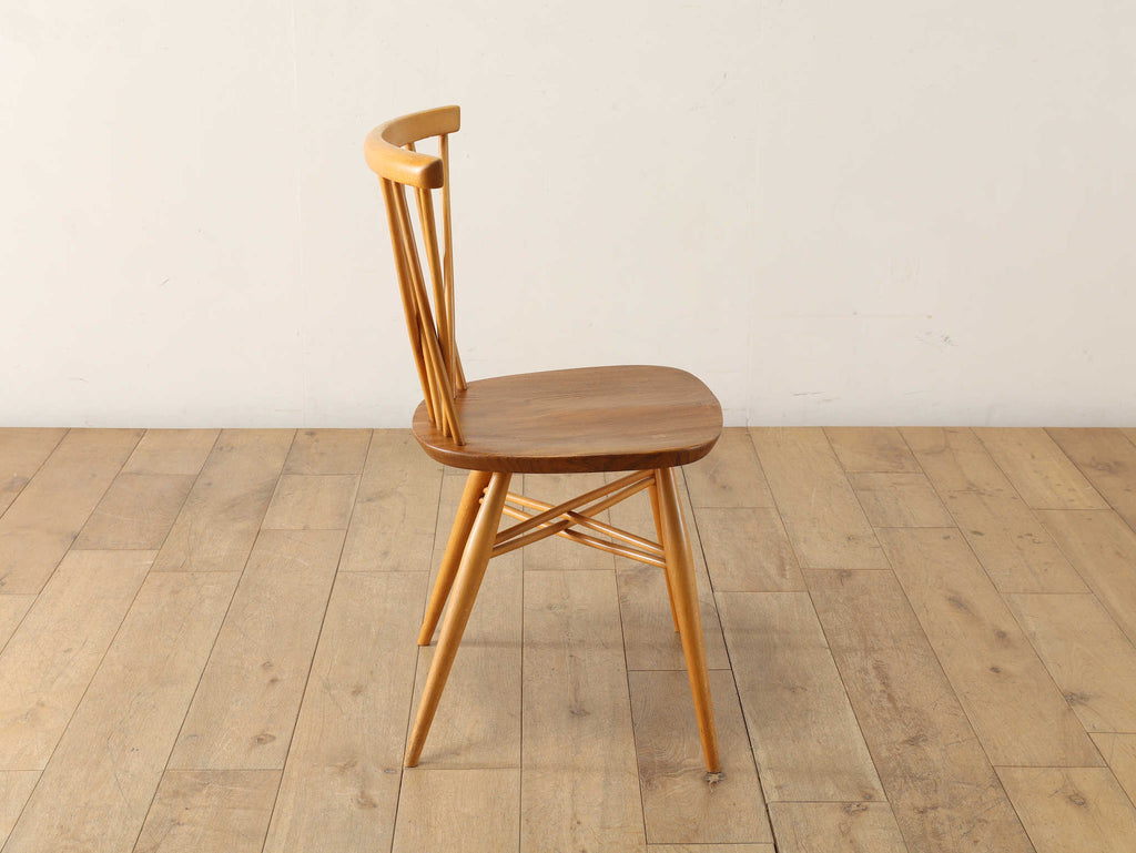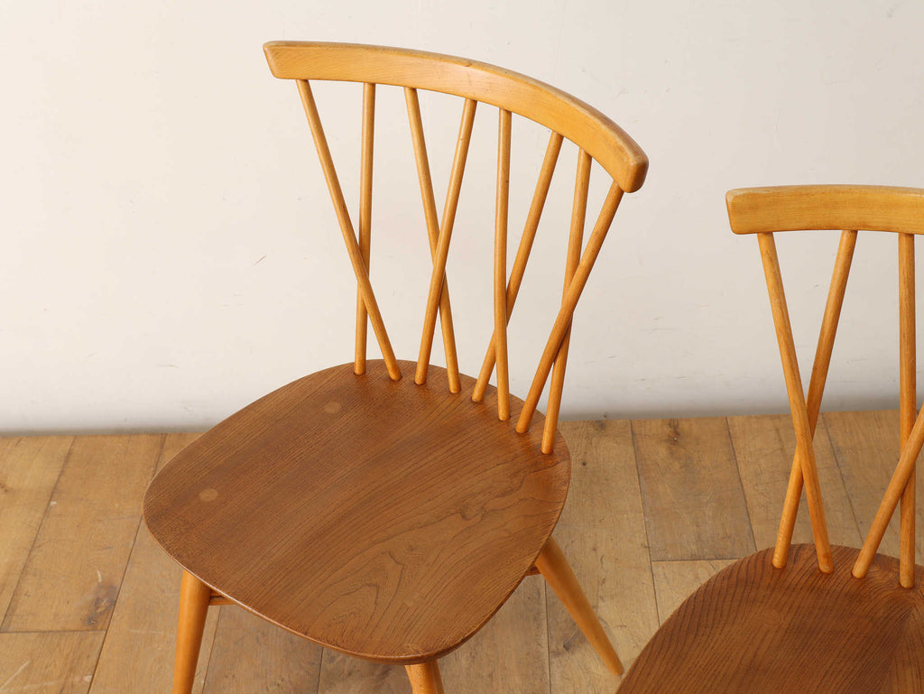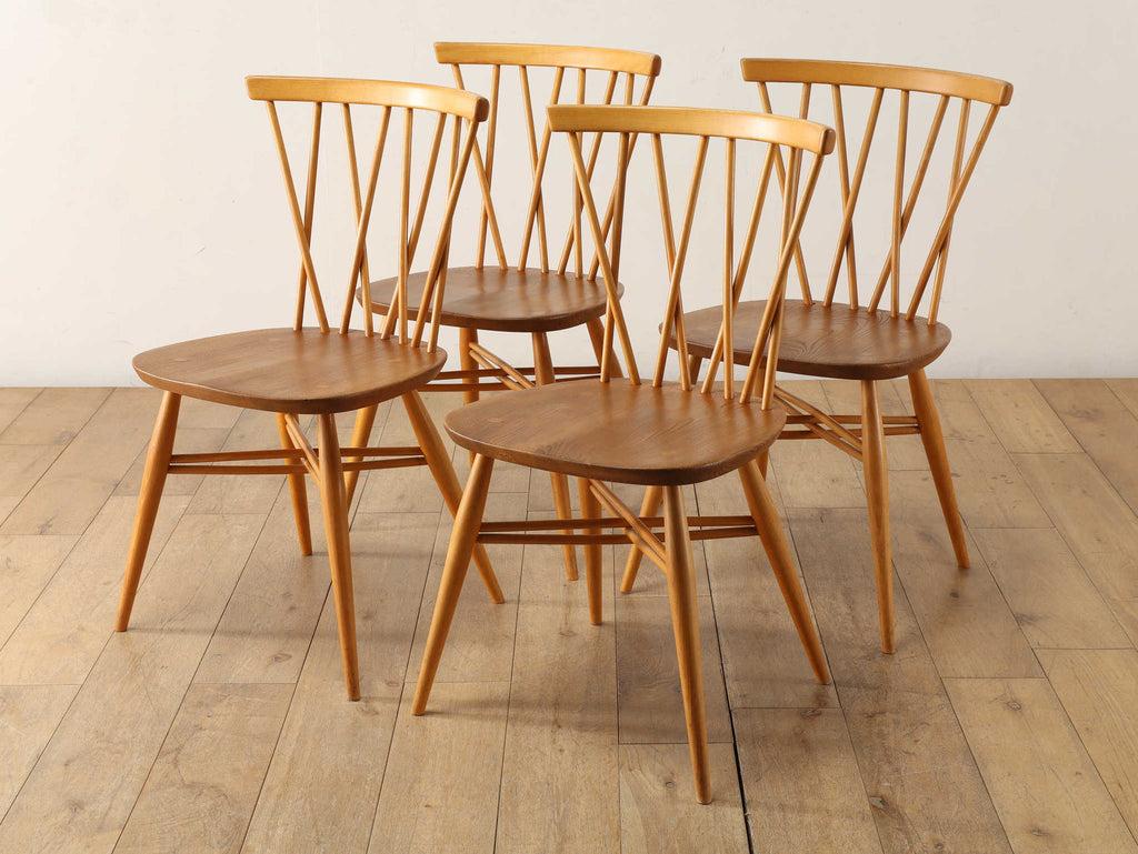 英国ミッドセンチュリーを代表とするERCOL社が誇るタイムレスな美しさを放つクロスバックチェアです。背面に交差したスピンドルのデザインは、シンプルでありながら印象的でどの角度から見ても美しく、空間に軽やかなアクセントを加えてくれます。滑らかな曲線、手に馴染む柔らかな質感、安定感のある座り心地の良さは、アーコール社が培ってきた木工技術の高さを物語っています。現代インテリアとの相性もよく、アンティーク/ヴィンテージを始める最初の家具としてもお薦めです。ただ置いてあるだけで絵になるチェアでお部屋を彩ってみてはいかがでしょうか。