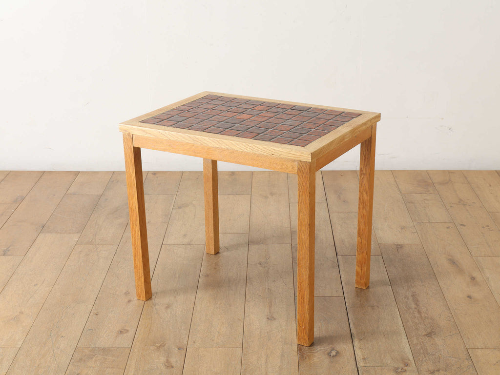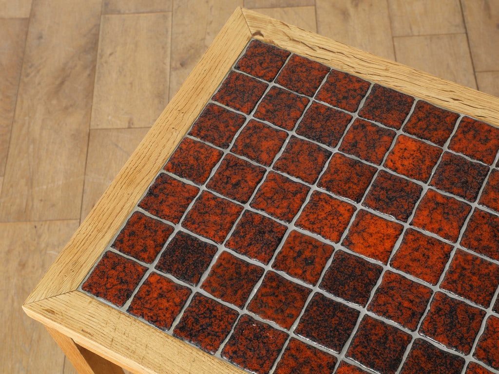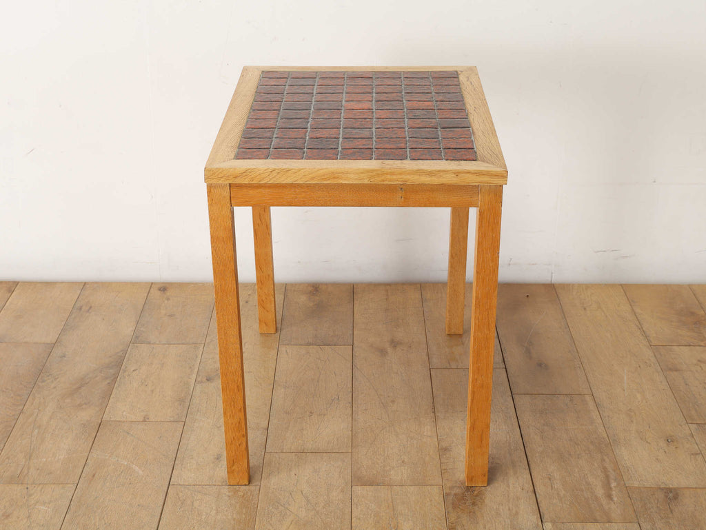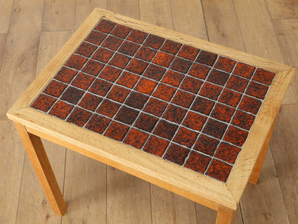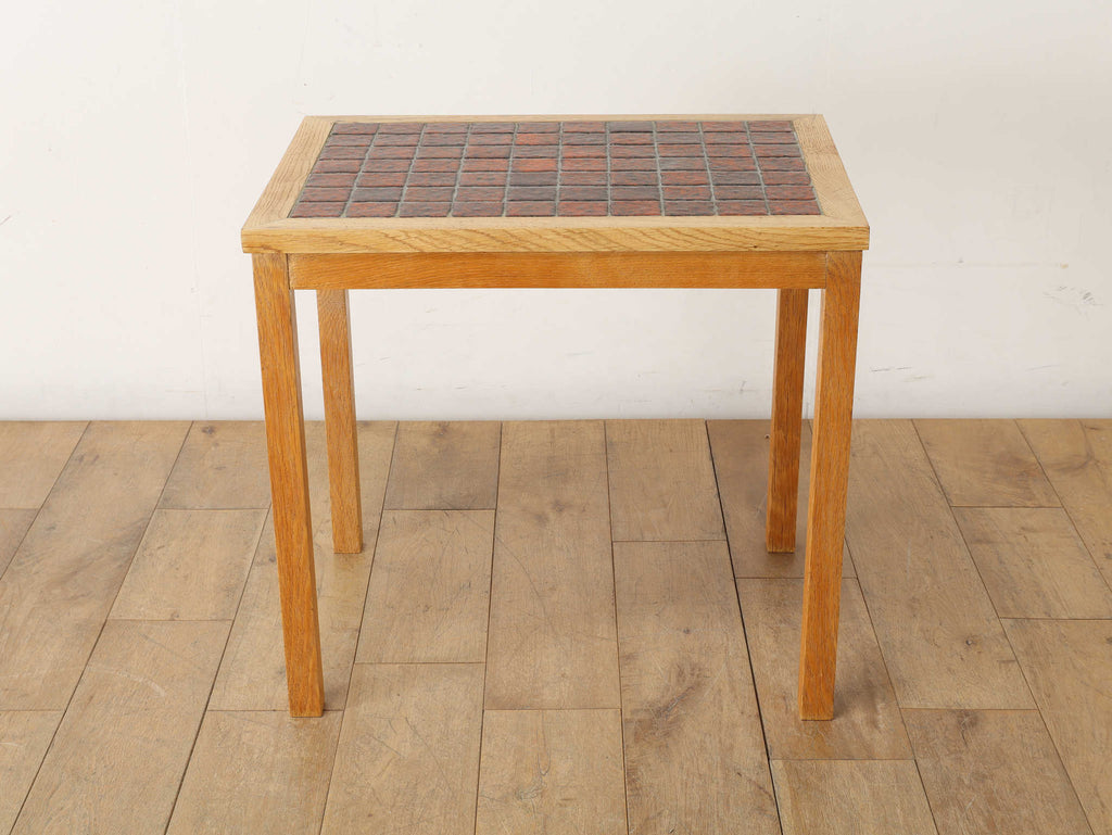 1950年代(推定)デンマーク製、タイルトップサイドテーブル。当時のモダンデザインを象徴する家具のひとつで有り、ライトオークのフレームがタイルを魅力を一層引き立ててくれます。視覚的に鮮やかで豊かな表情を持つタイル天板とのコントラストが魅力的です。特にタイルは個性的で鮮やかな色が使われた模様が施されていますので、テーブル全体がまるでアート作品のような印象を与え、空間に独自のアクセントを放ってくれます。