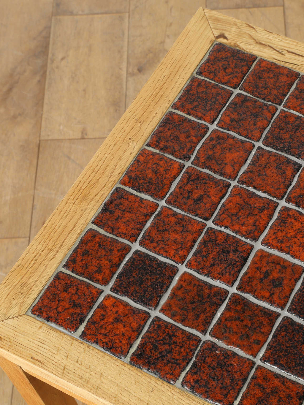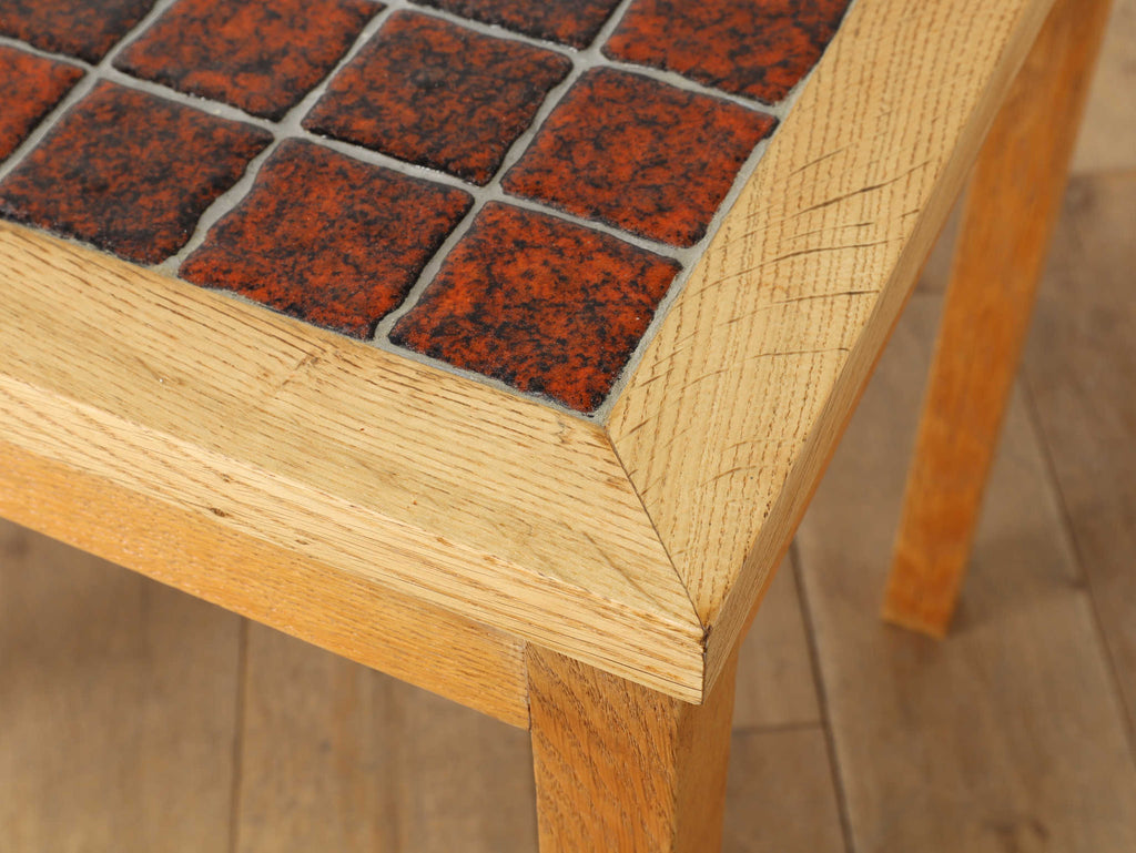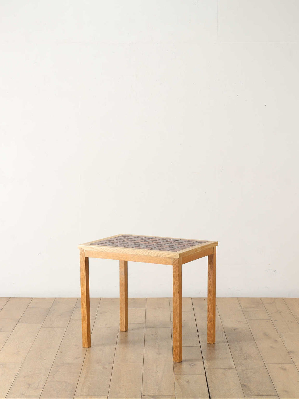 1950年代(推定)デンマーク製、タイルトップサイドテーブル。当時のモダンデザインを象徴する家具のひとつで有り、ライトオークのフレームがタイルを魅力を一層引き立ててくれます。視覚的に鮮やかで豊かな表情を持つタイル天板とのコントラストが魅力的です。特にタイルは個性的で鮮やかな色が使われた模様が施されていますので、テーブル全体がまるでアート作品のような印象を与え、空間に独自のアクセントを放ってくれます。