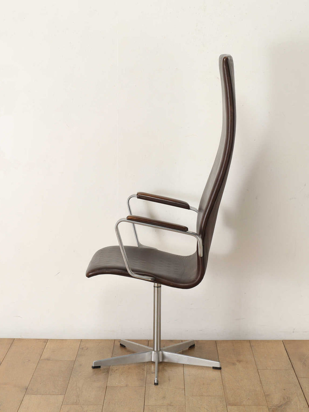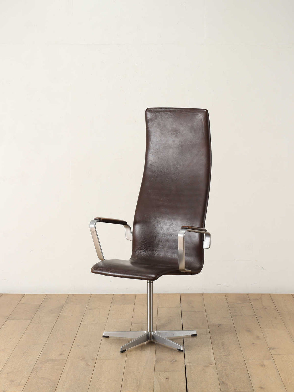 デンマークデザインの巨匠、アルネ・ヤコブセンが、1965年にイギリス・オックスフォードのセント・キャサリンズ・カレッジの教授用チェアとしてデザインをした「オックスフォード・チェア」です。特徴的なハイバックスタイルは、他のチェアには無い、キャラクター性を発揮しております。メタルフレームと、ヴィンテージならではの経年変化に富んだレザーの質感とのコントラストが素晴らしく、さらにこのチェアを魅力的なものにしております。空間のアイコン的な存在になる逸品です。