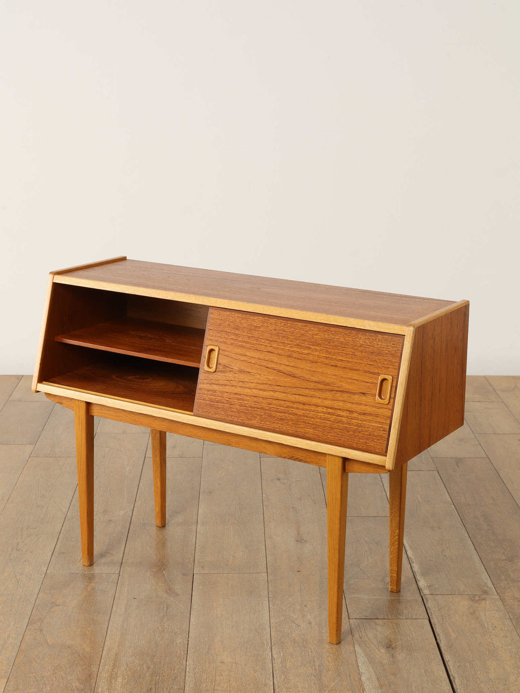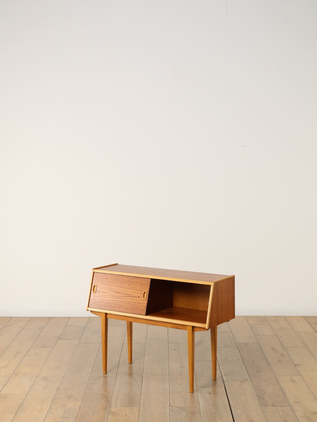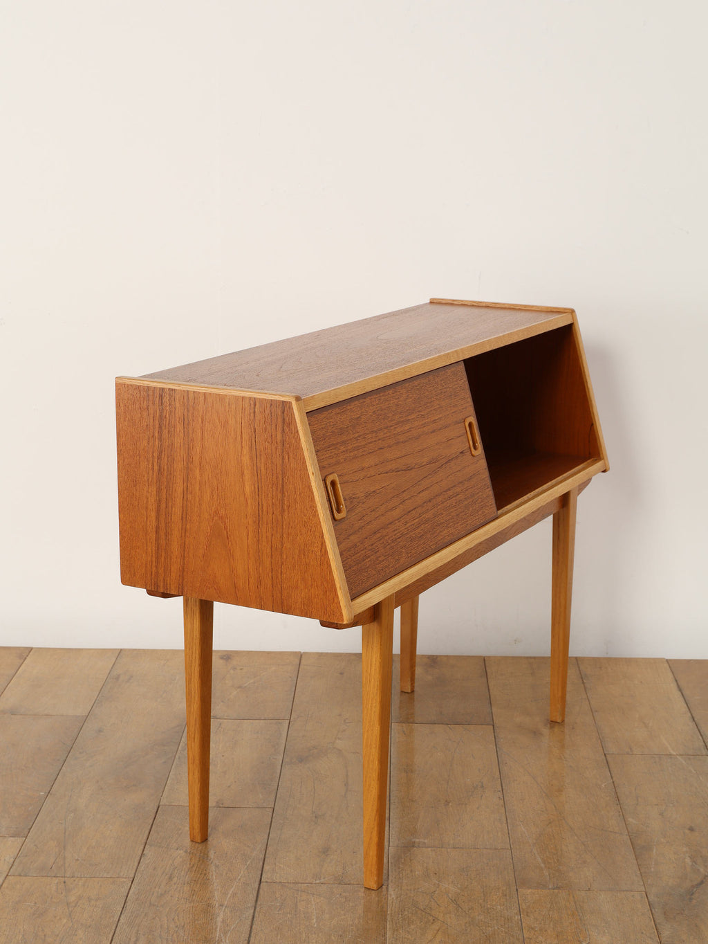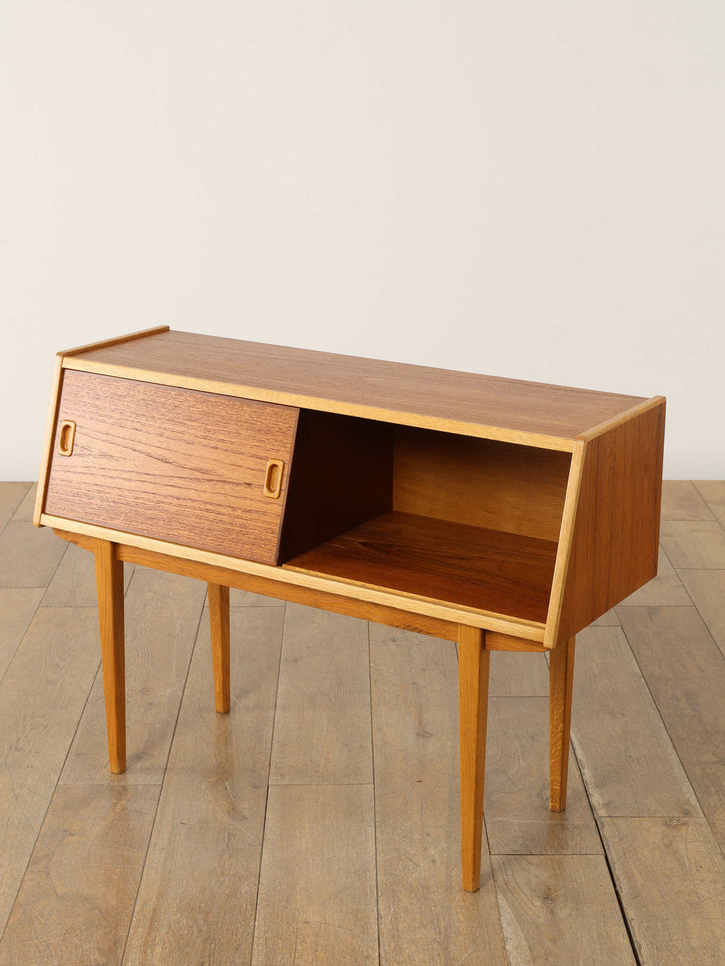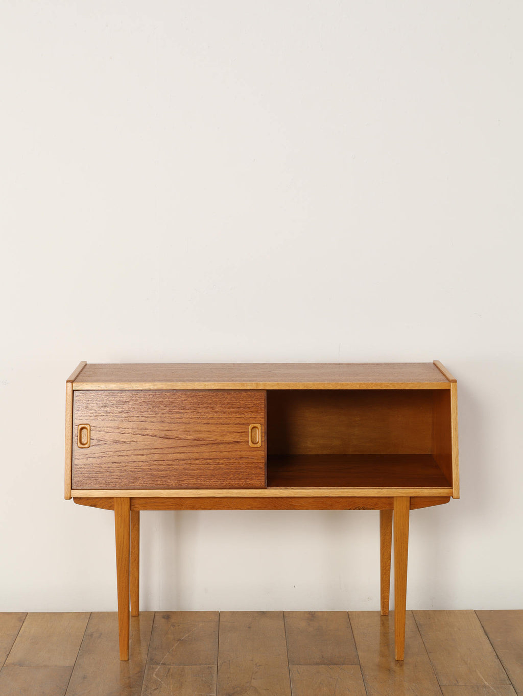 1960年代(推定)、スウェーデン、チーク材を使用したコンパクトなキャビネット。スリムな脚と軽やかな構造が北欧デザインらしい洗練を感じさせ、限られた空間でも圧迫感なく置けるのが魅力です。スライド式の扉と棚板により、実用性と美観を両立。リビングではサイドボードとして、寝室ではナイトテーブルとしても活躍します。経年によるチークの深みある風合いが、空間に落ち着きと上質感を添えてくれる、ヴィンテージならではの一台です。