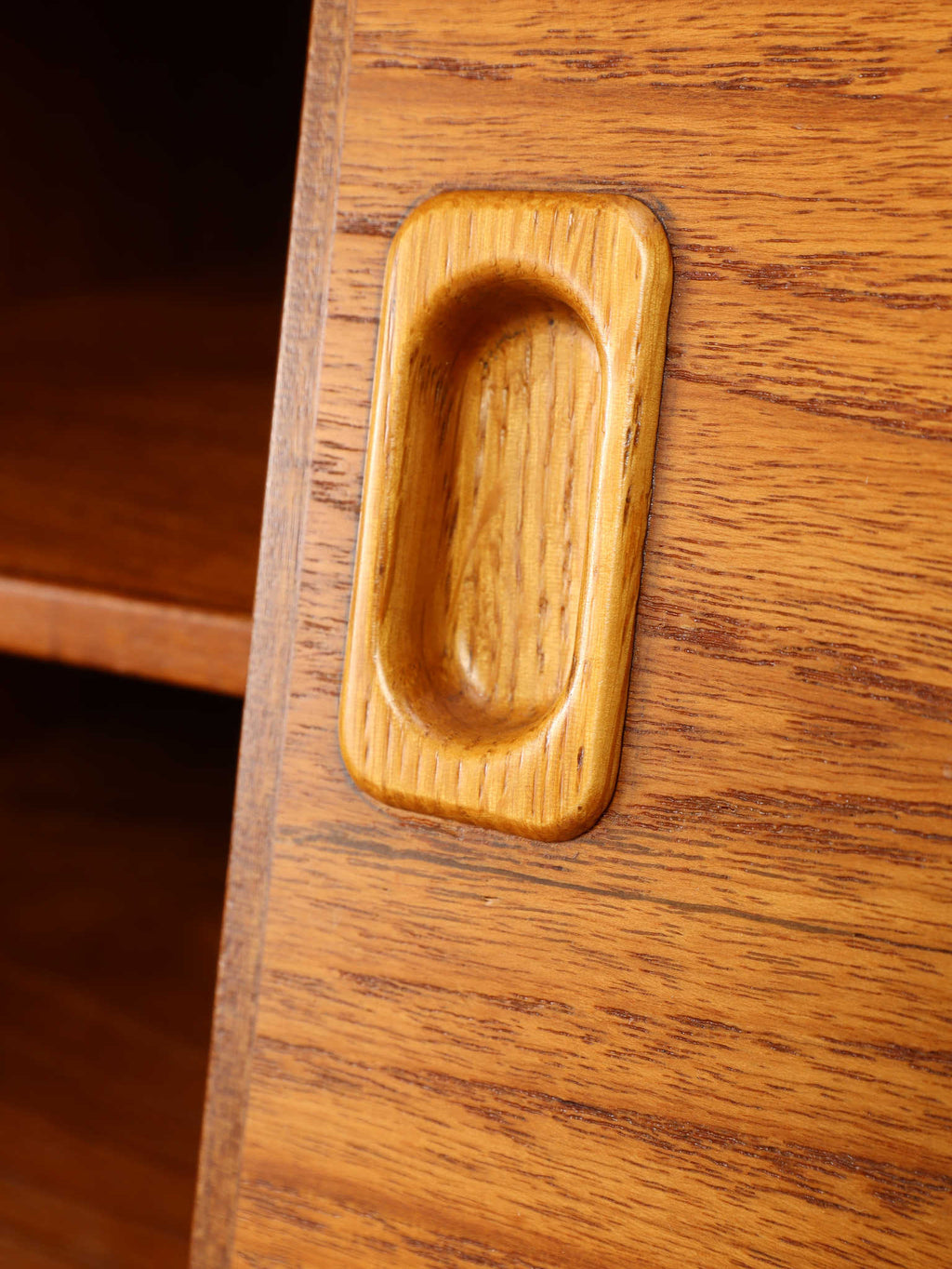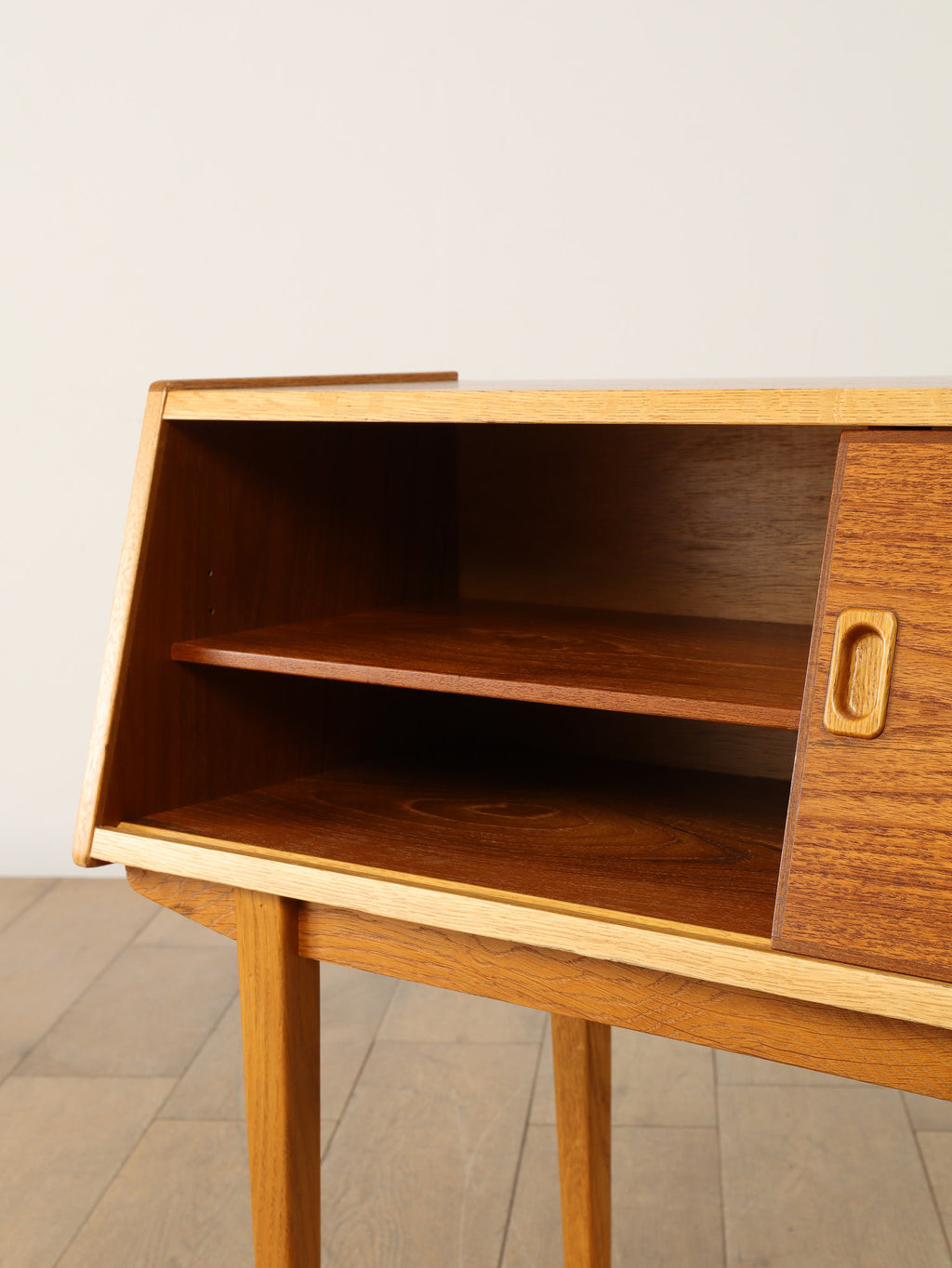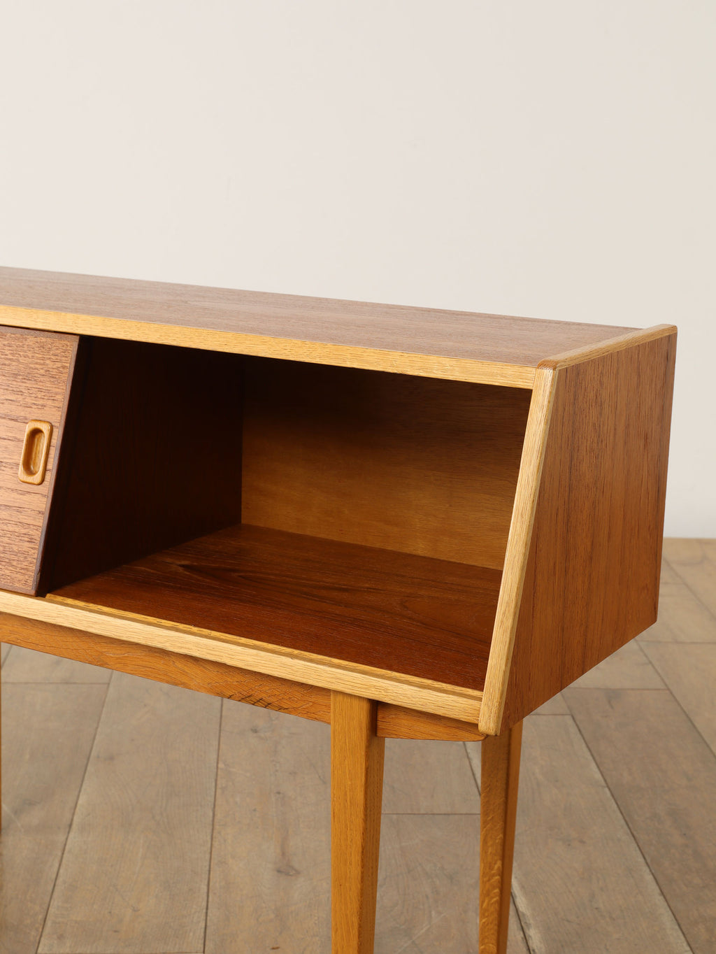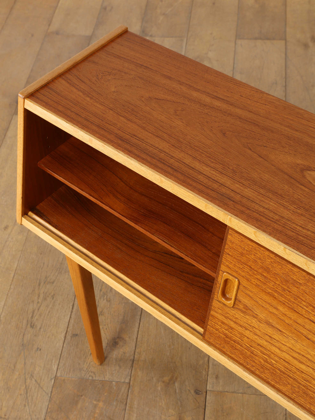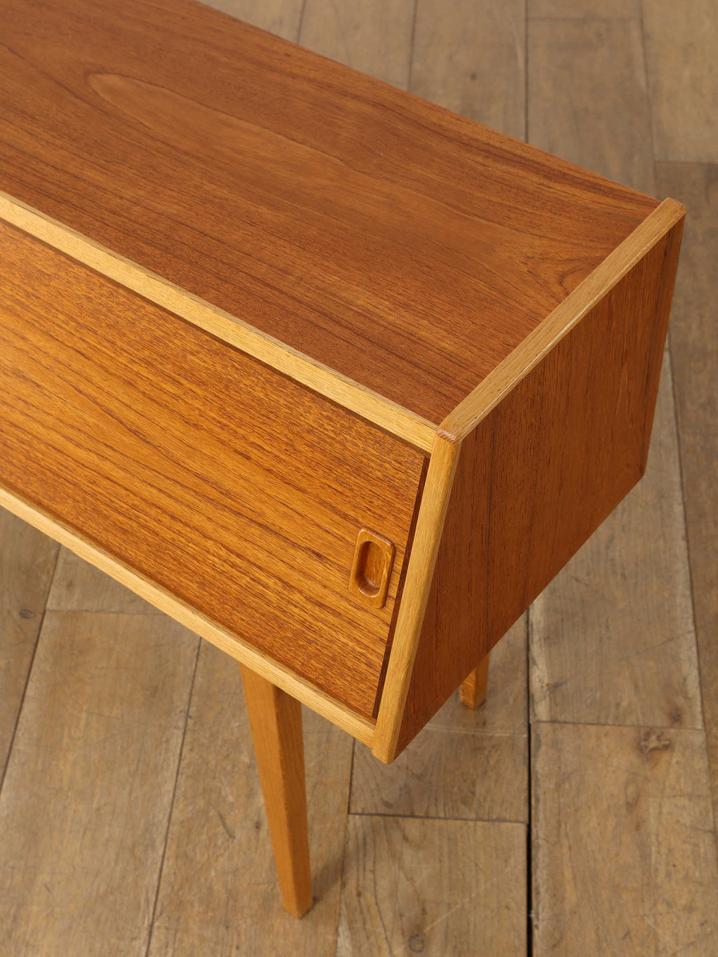1960年代(推定)、スウェーデン、チーク材を使用したコンパクトなキャビネット。スリムな脚と軽やかな構造が北欧デザインらしい洗練を感じさせ、限られた空間でも圧迫感なく置けるのが魅力です。スライド式の扉と棚板により、実用性と美観を両立。リビングではサイドボードとして、寝室ではナイトテーブルとしても活躍します。経年によるチークの深みある風合いが、空間に落ち着きと上質感を添えてくれる、ヴィンテージならではの一台です。