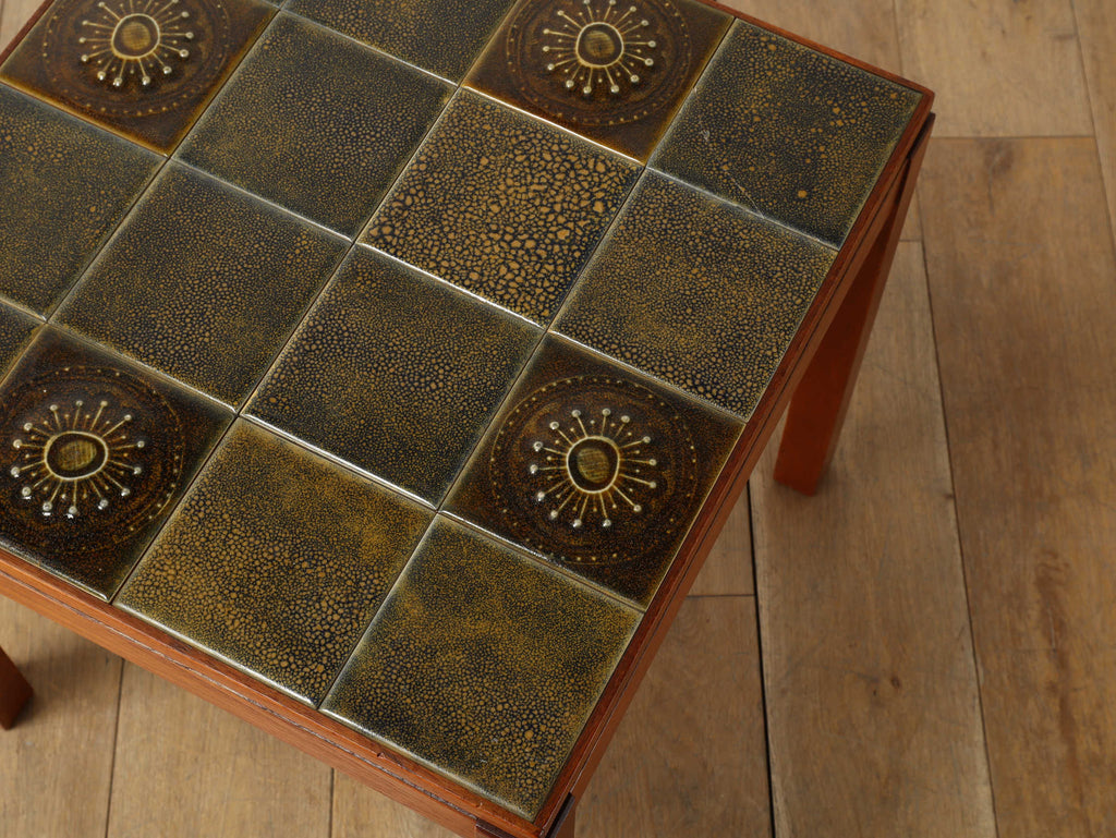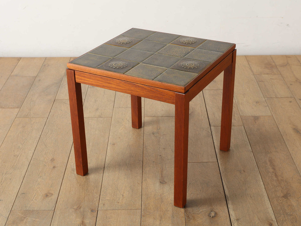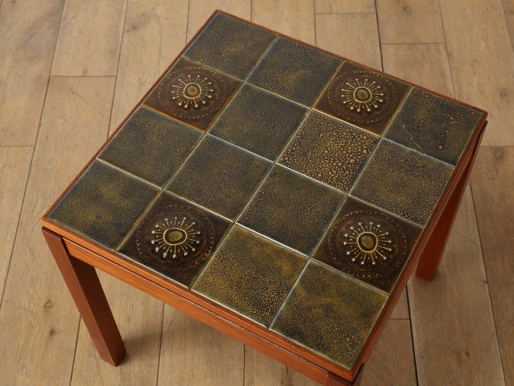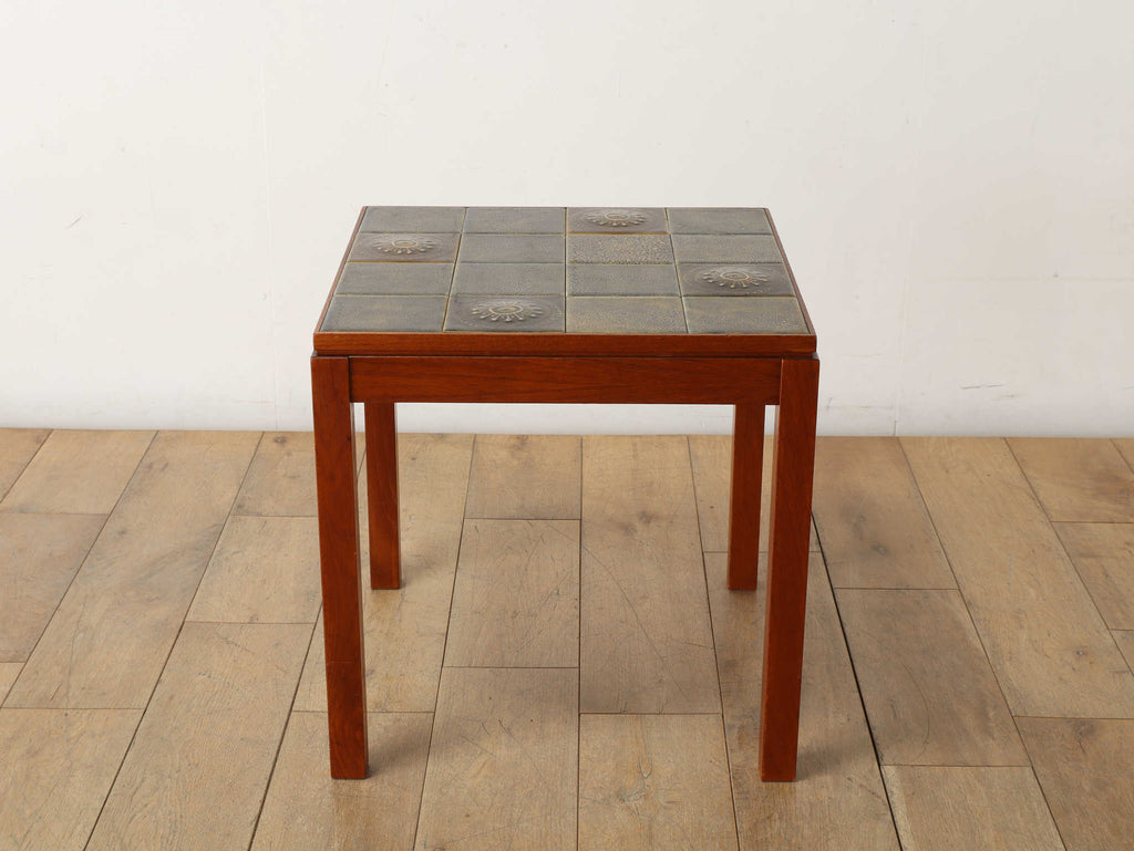 1950年代デンマーク、チーク材の脚部と陶製タイル天板のコントラストが美しいヴィンテージサイドテーブル。天板には職人による手仕事を感じさせる装飾タイルが用いられ、特に放射状のモチーフは太陽を思わせる温かな表情をもたらします。熱や水に強く、マグカップや花器を気兼ねなく置ける実用性も魅力。チーク材のフレームは経年により深みを増し、北欧らしい温もりを空間に添えてくれます。リビングのアクセントとして、穏やかな時間を彩る一台です。
