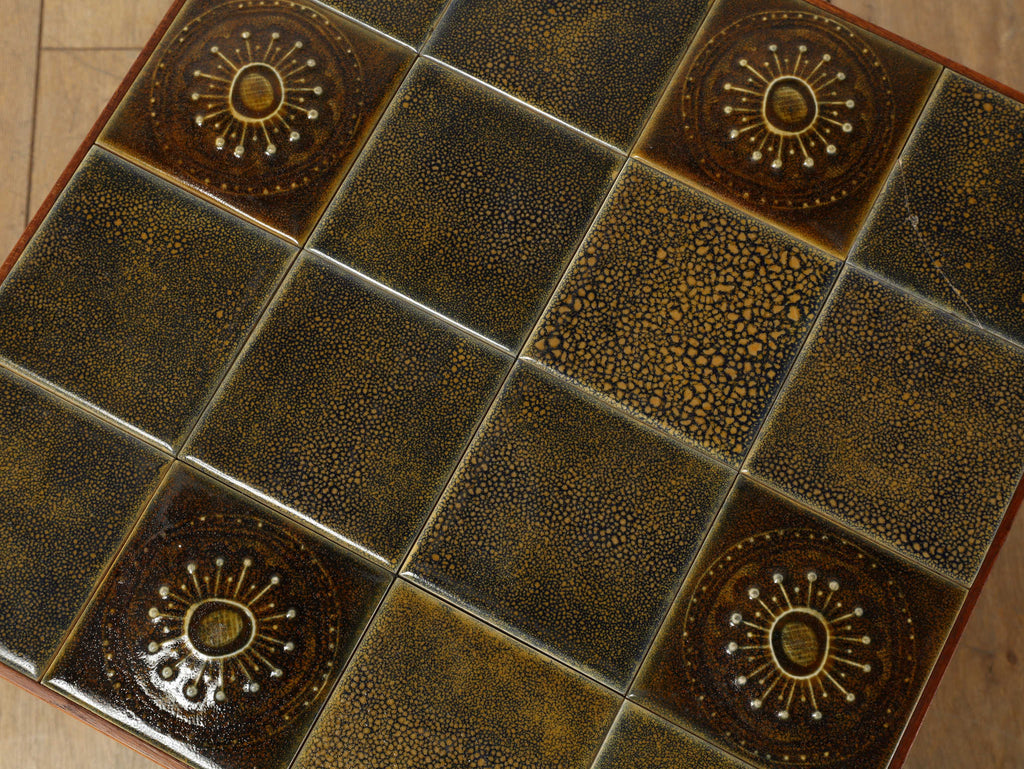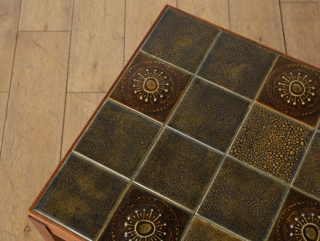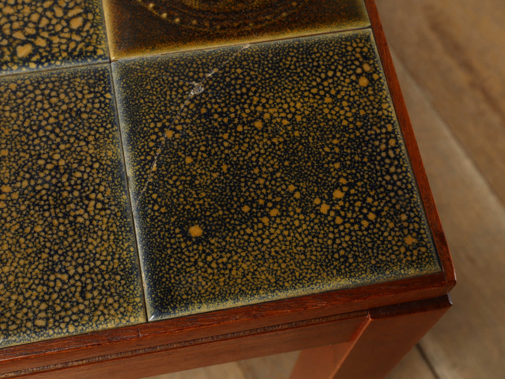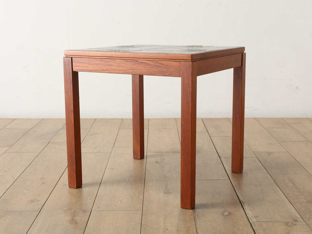 1950年代デンマーク、チーク材の脚部と陶製タイル天板のコントラストが美しいヴィンテージサイドテーブル。天板には職人による手仕事を感じさせる装飾タイルが用いられ、特に放射状のモチーフは太陽を思わせる温かな表情をもたらします。熱や水に強く、マグカップや花器を気兼ねなく置ける実用性も魅力。チーク材のフレームは経年により深みを増し、北欧らしい温もりを空間に添えてくれます。リビングのアクセントとして、穏やかな時間を彩る一台です。