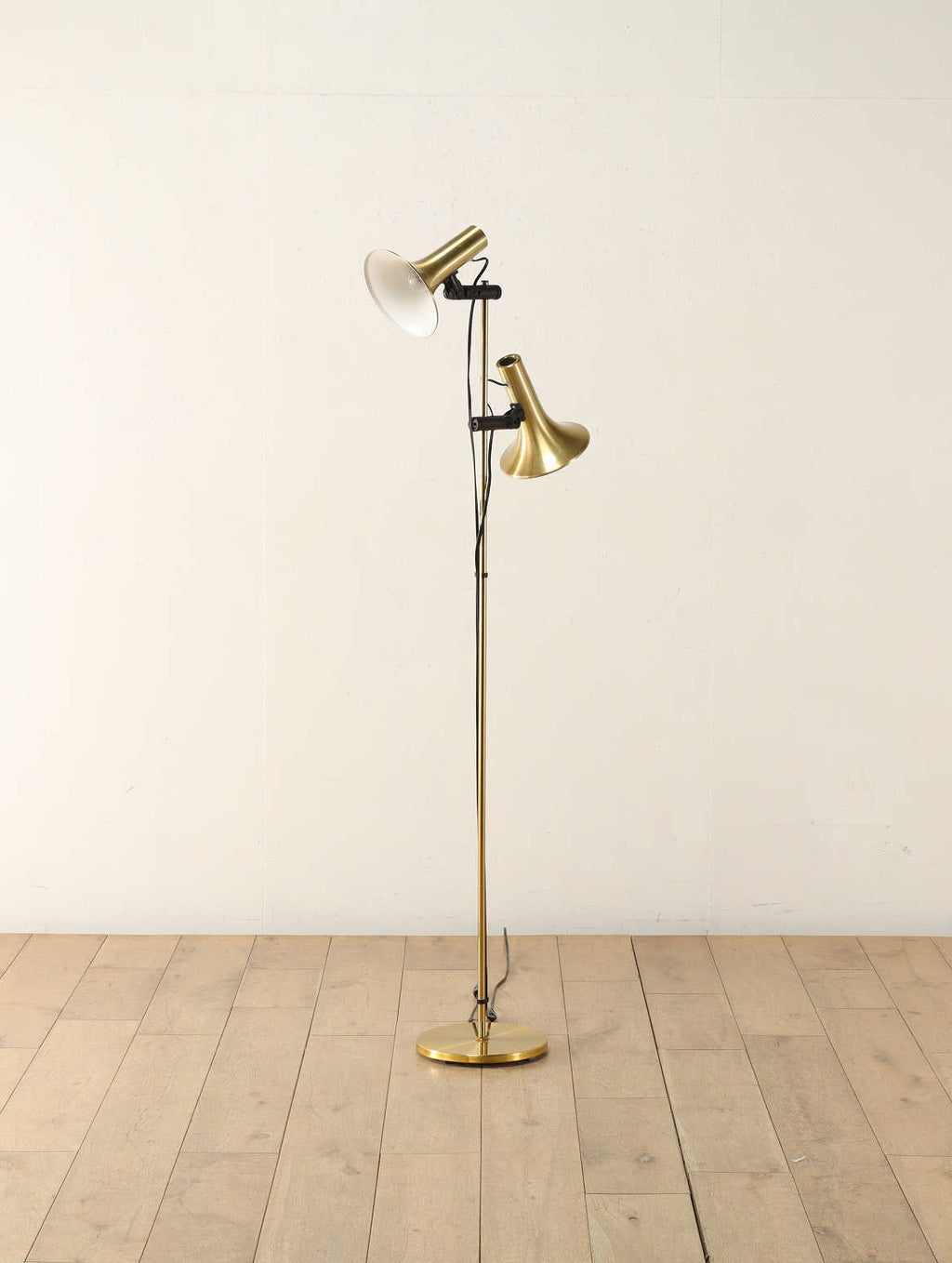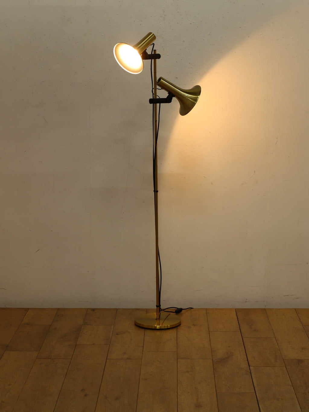 ラッパ形の2灯のシェードのデザインが特徴的なブラス素材を使用したヴィンテージフロアランプ。シェードは角度を自由に変えることができ、ソファやチェア、ベッドサイドなど、さまざまなシーンでお使いいただけます。木を用いたフロアランプとは一味違った雰囲気を醸し出すアイテムをぜひ取り入れてみてはいかがでしょうか。