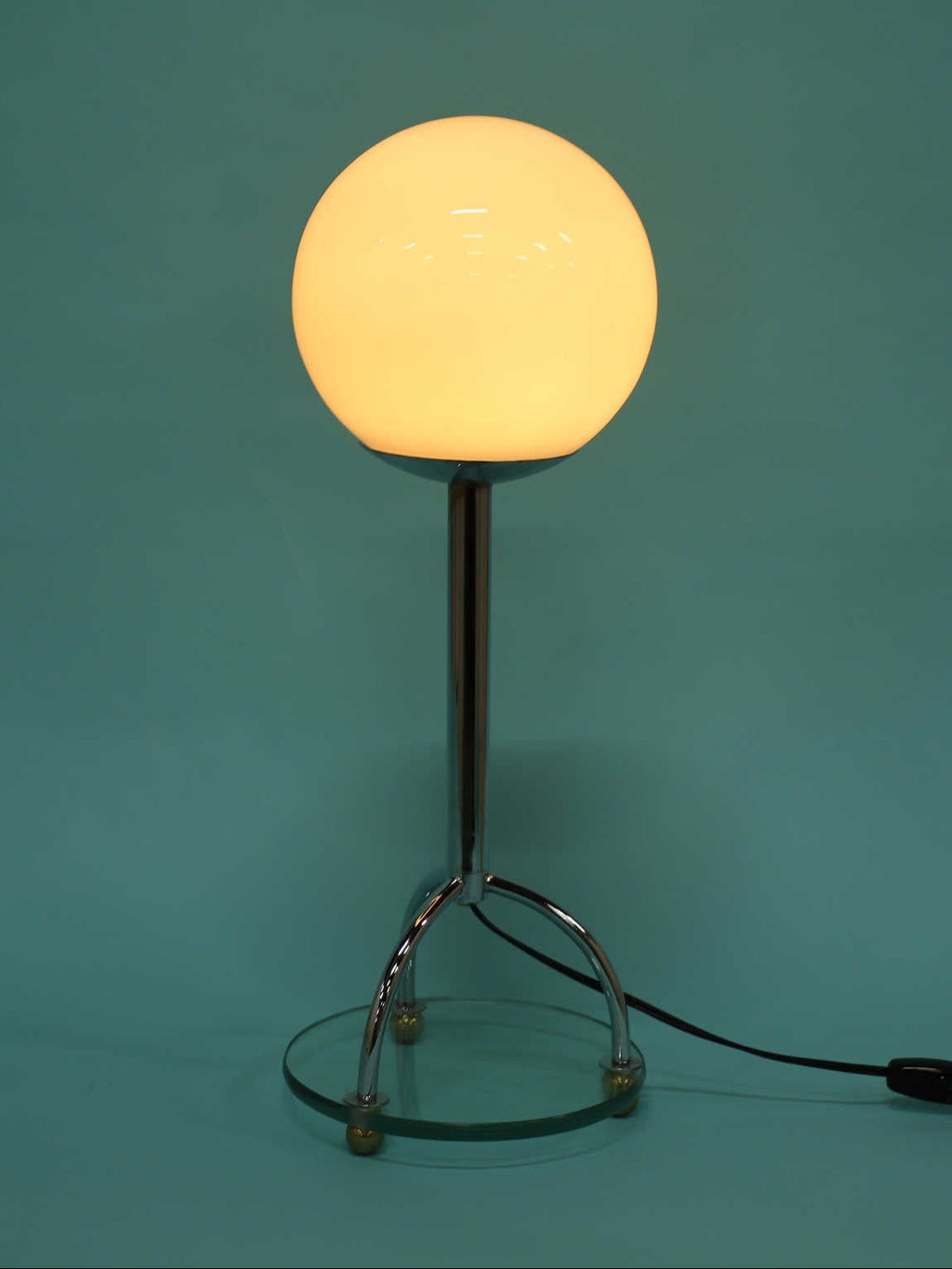 丸い乳白色のガラスグローブが印象的な、モダンスタイルなテーブルランプです。スリムなクロームメッキの支柱と透明なガラスベースが、浮遊感のある軽やかなデザインを演出。点灯すると、柔らかく幻想的な光がお部屋全体を包み込み、リラックスできる空間を作り出します。リビングのコーナーや寝室のサイドランプとして、またショップのディスプレイにも最適です。シンプルながらも存在感があり、どんなインテリアにも馴染む洗練された一品です。