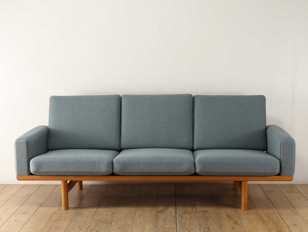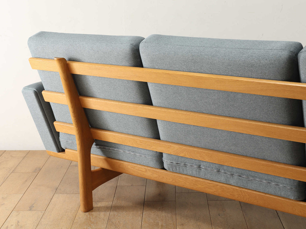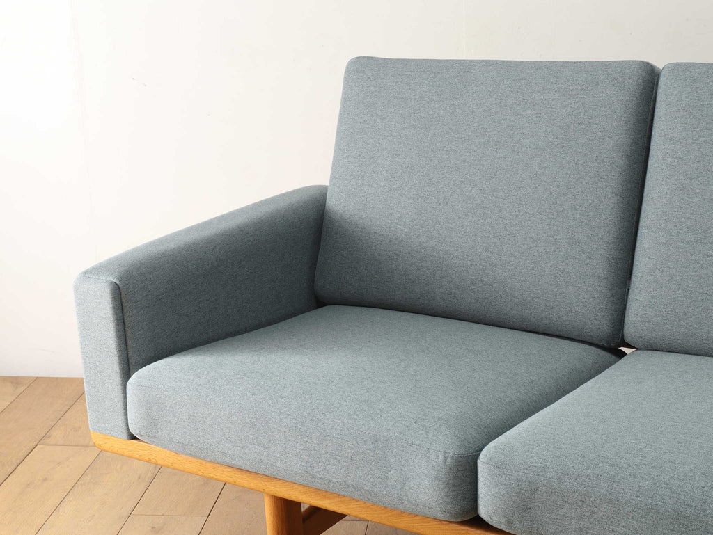 ハンス・J・ウェグナー。生涯において、500脚以上のチェアをデザインしたといわれており、デンマークの家具デザイン史において、多大な影響を与えた巨匠の1人です。なかでもベッドのマットレスメーカーであるGETAMAから発表されたシリーズは、今日においても高い人気を誇り、代表作のひとつとなっています。こちらのGE236は木製のフレームならではの軽快さと、ファブリックで覆われたアームが持つ張り込んだソファのような柔らかな印象が絶妙なバランスで組み合わせられています。比較的サイズも大きくフラットな座面はデイベッドのように横になって楽しむのにもおすすめです。細部まで洗練された美しさと機能性を有した、名作と言える逸品です。【ファブリック】