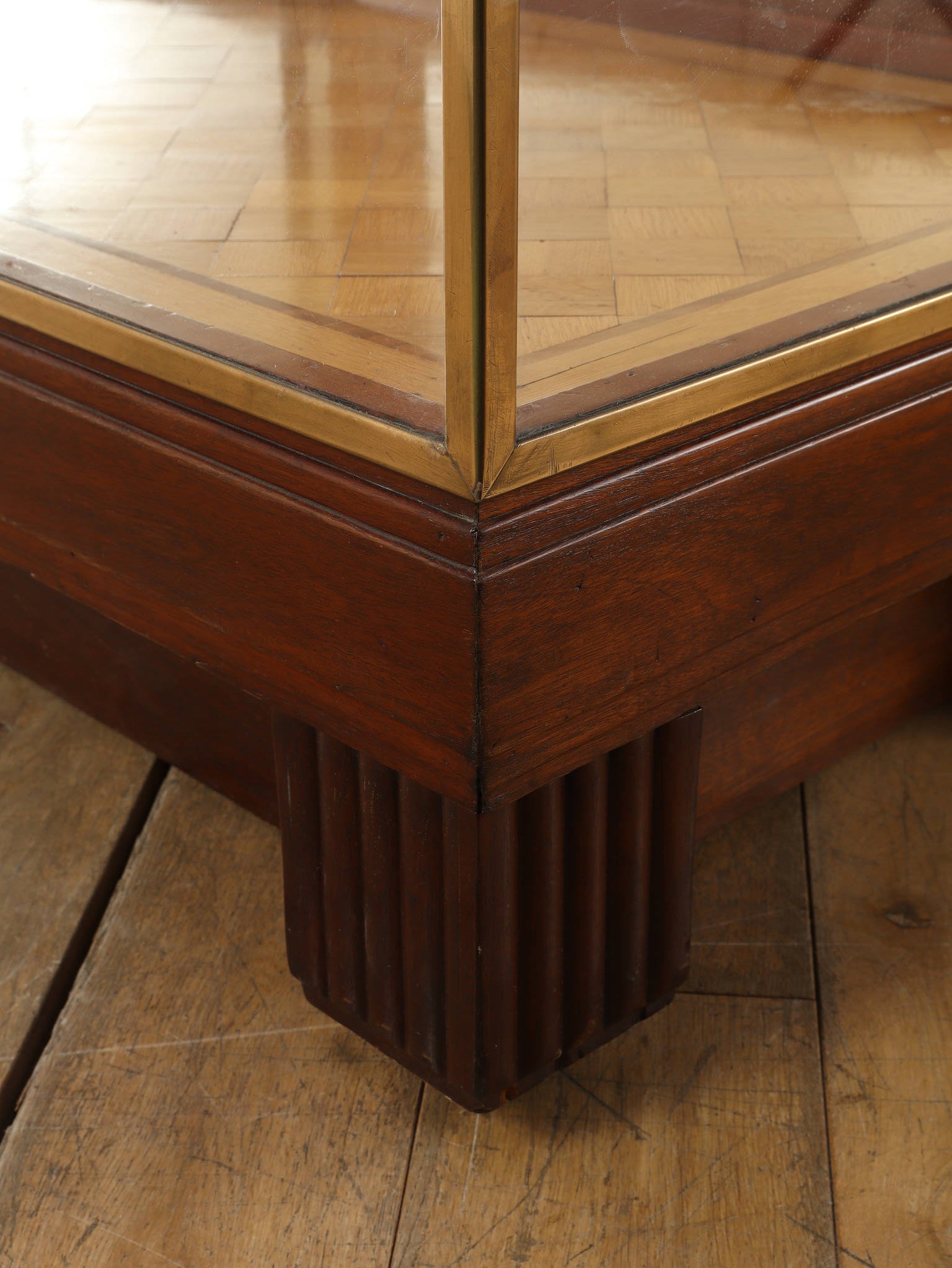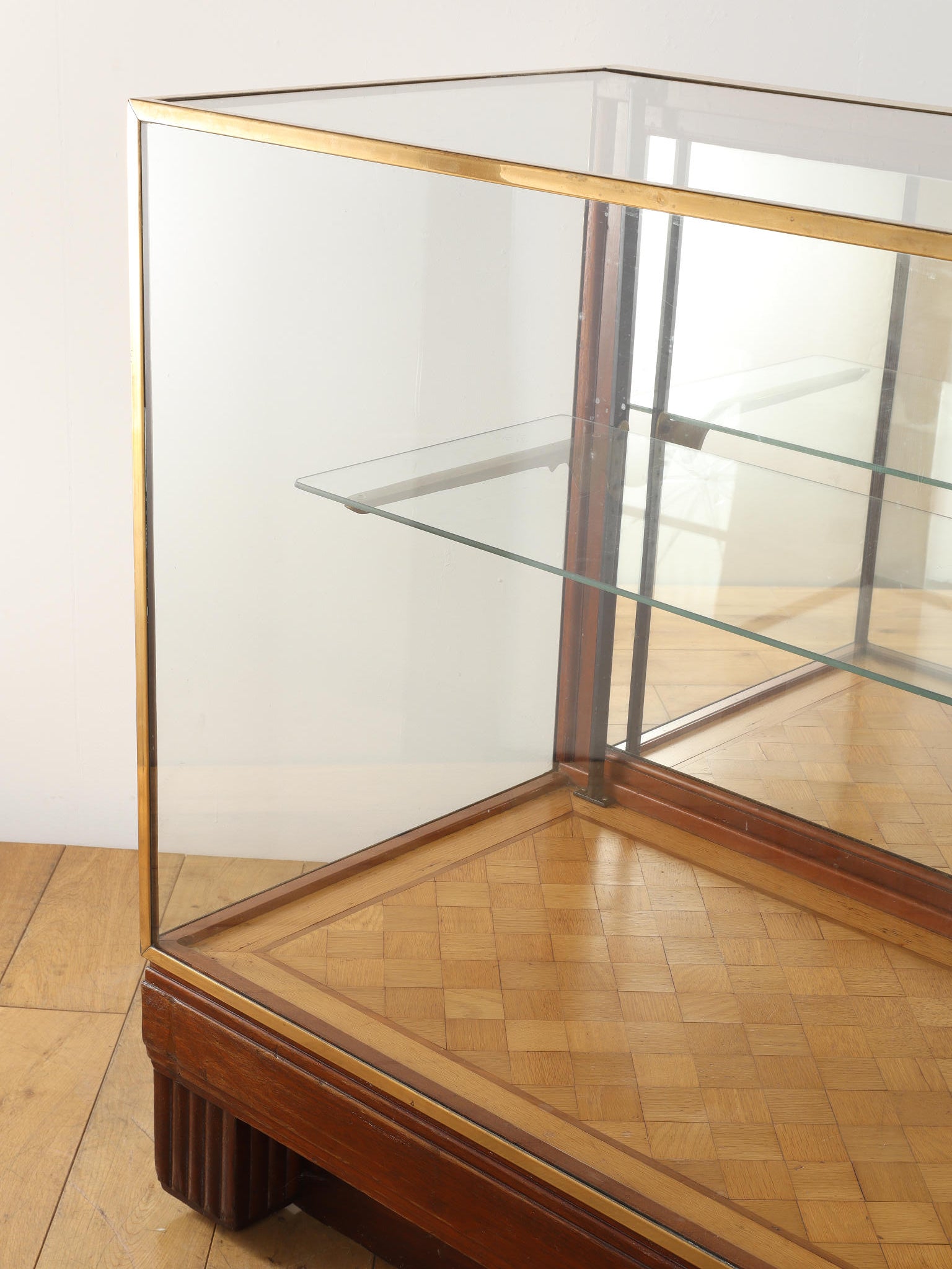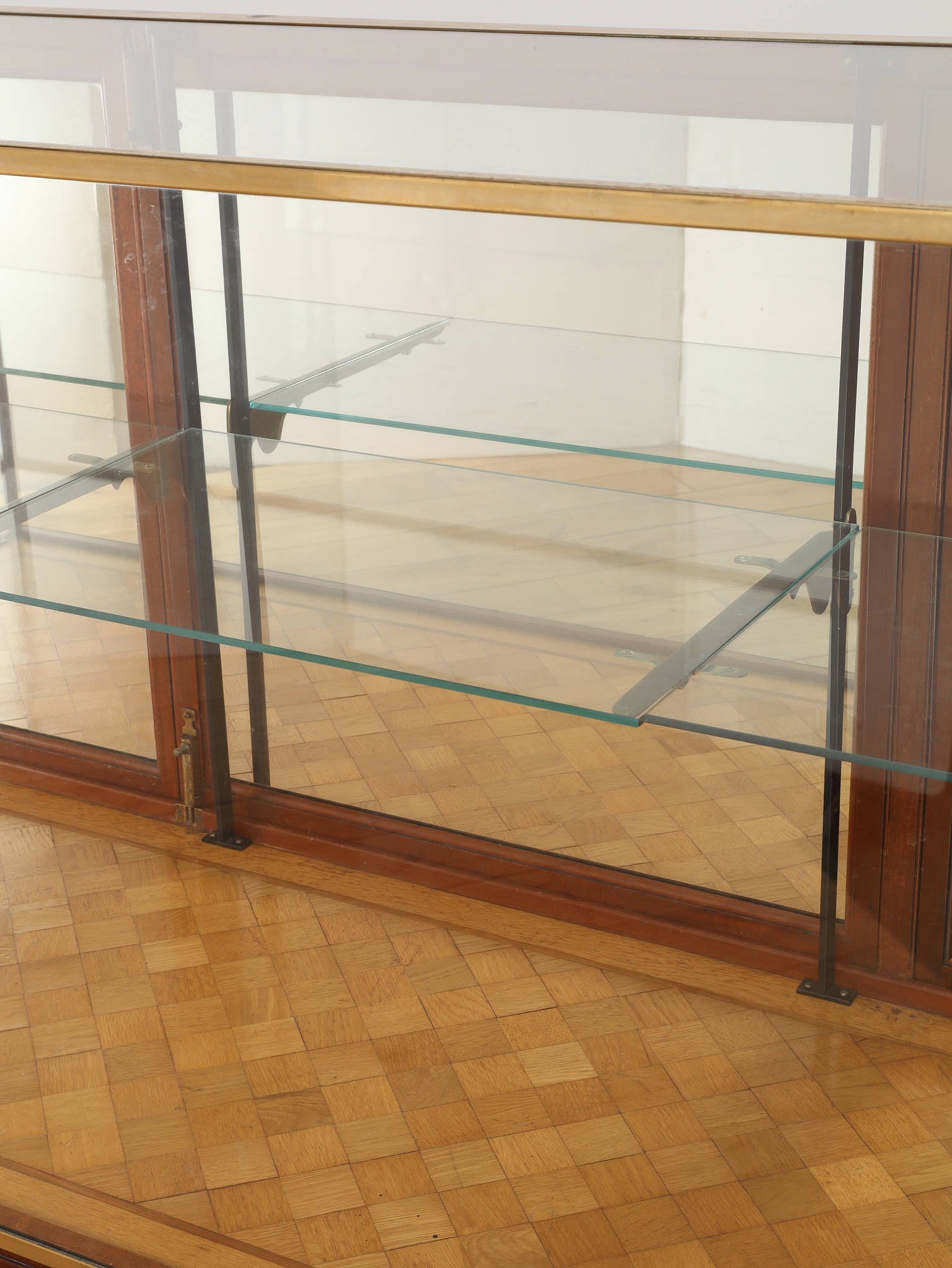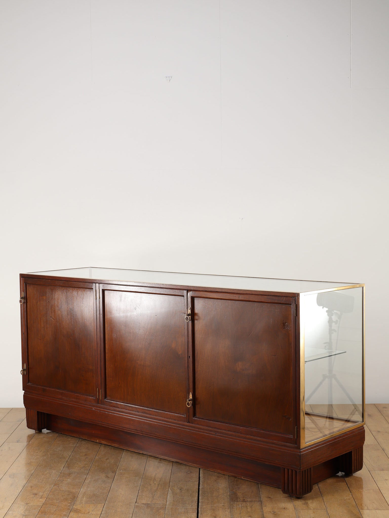 1920年代(推定)の著名な店舗内装メーカーPOLLARDS(ポラーズ)社によるショップディスプレイカウンター。当時、宝飾店や高級ブティックの什器を手掛けた同社の製品は、商品を最も美しく見せる「ディスプレイに特化した設計」が特徴です。繊細な真鍮フレームとマホガニー材の重厚感が、洗練された品格を醸し出します。特筆すべきは、底板に施された美しいパーケット(寄木細工)と、空間に奥行きを与える背面のミラー。W2140mmの堂々たるステージが、並べたコレクションを一つ上のランクへと引き上げます。