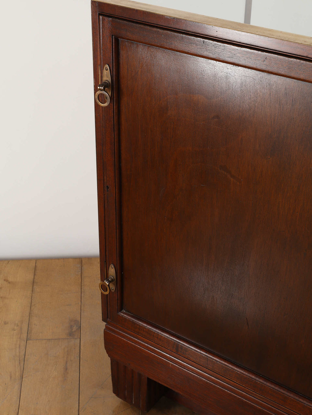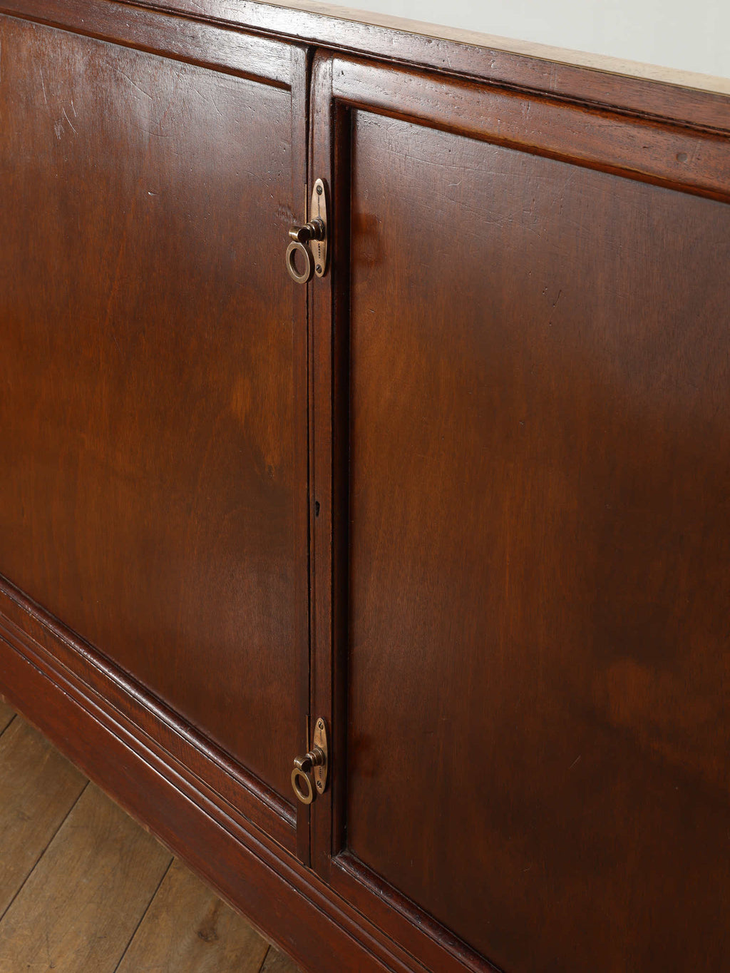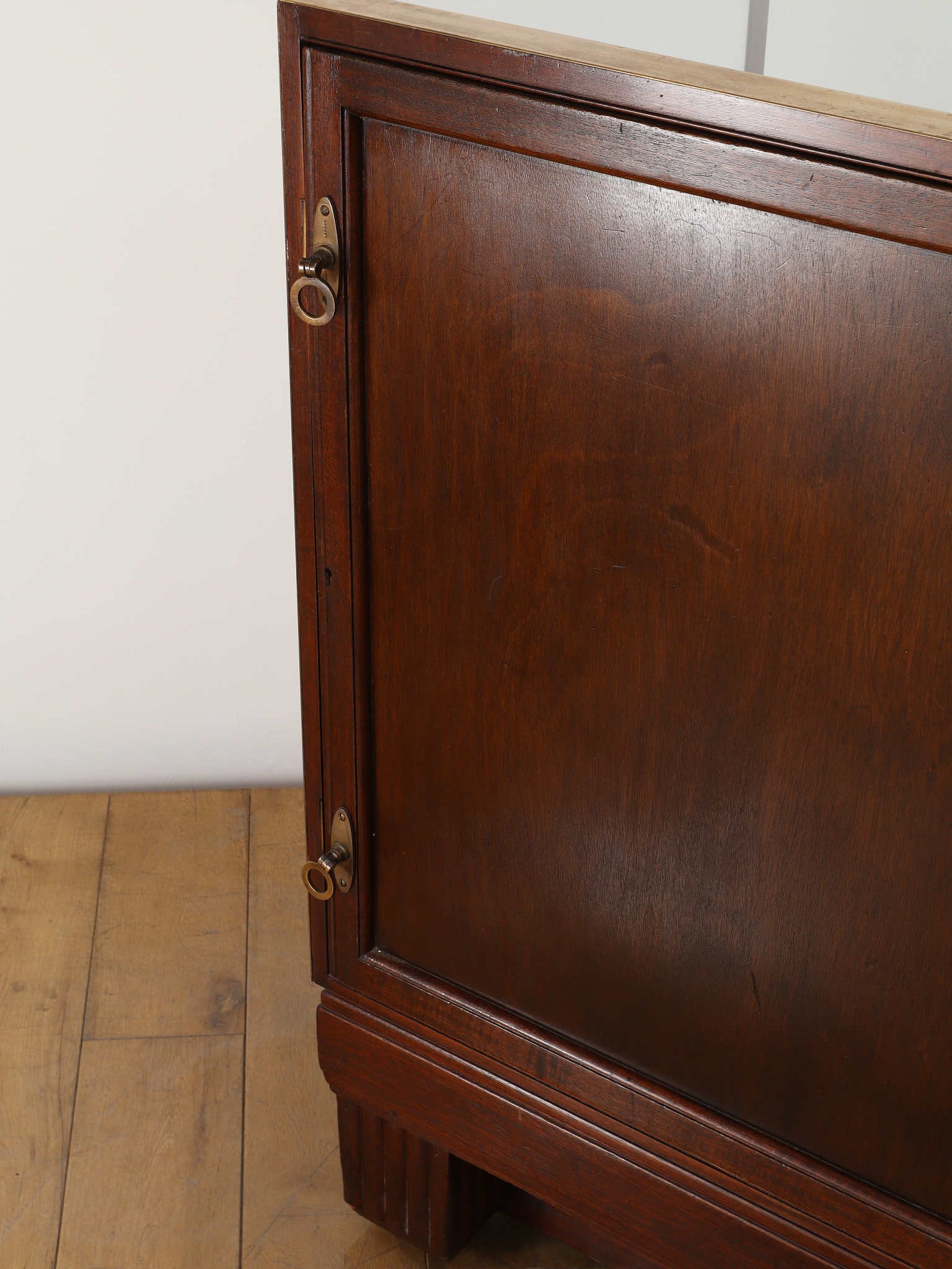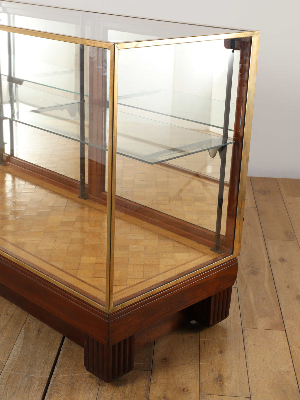 1920年代(推定)の著名な店舗内装メーカーPOLLARDS(ポラーズ)社によるショップディスプレイカウンター。当時、宝飾店や高級ブティックの什器を手掛けた同社の製品は、商品を最も美しく見せる「ディスプレイに特化した設計」が特徴です。繊細な真鍮フレームとマホガニー材の重厚感が、洗練された品格を醸し出します。特筆すべきは、底板に施された美しいパーケット(寄木細工)と、空間に奥行きを与える背面のミラー。W2140mmの堂々たるステージが、並べたコレクションを一つ上のランクへと引き上げます。