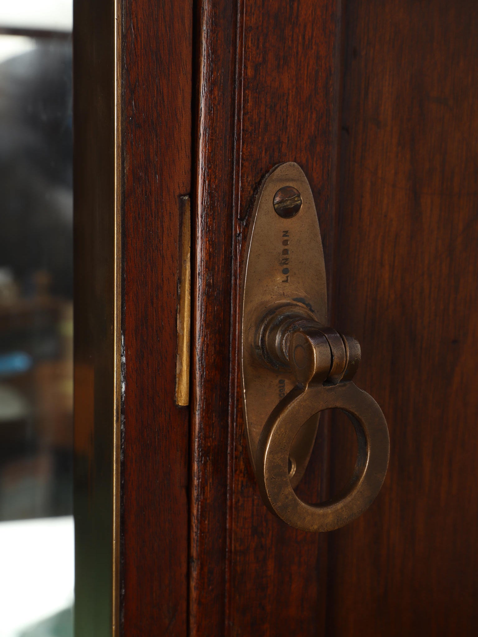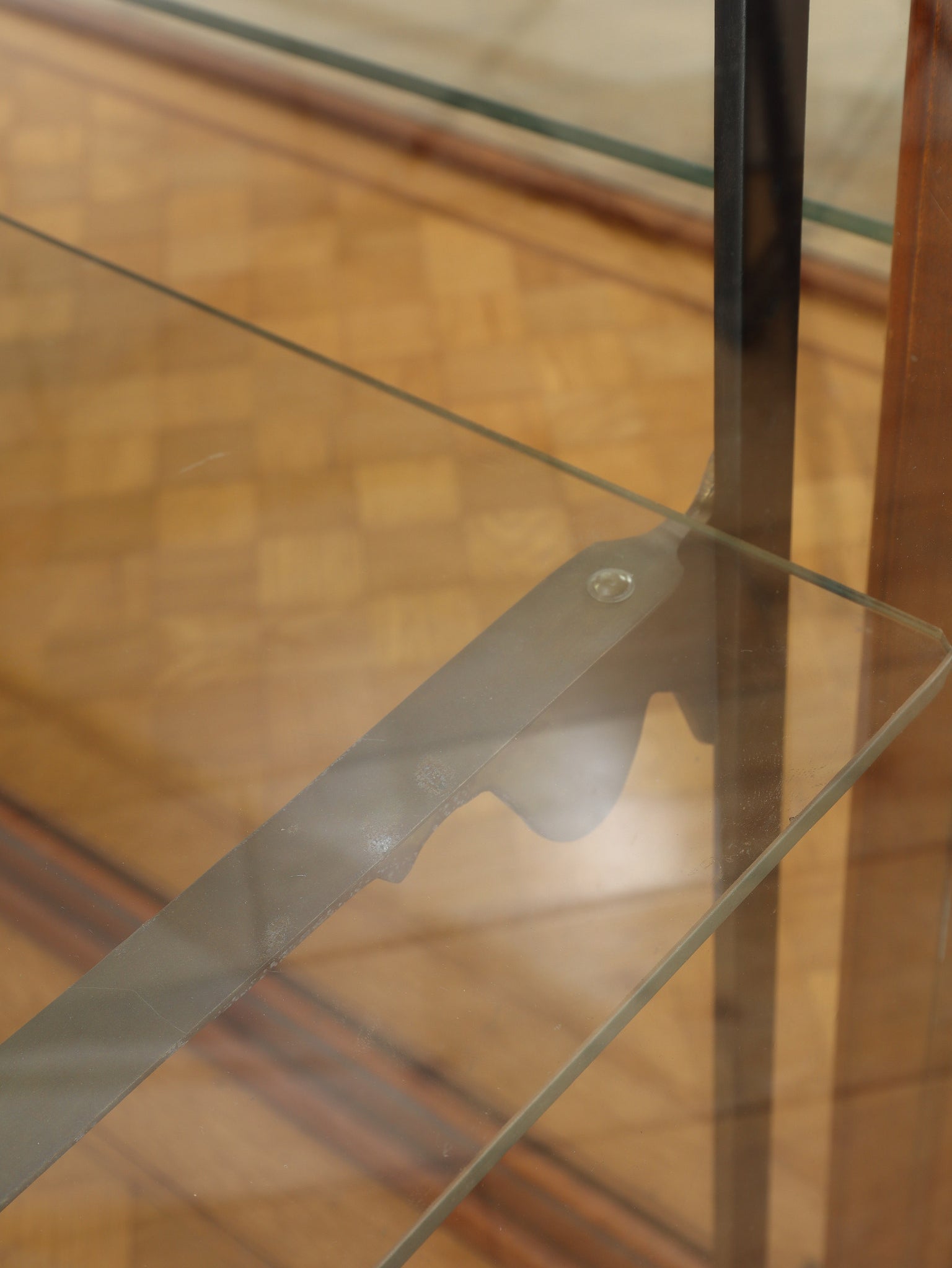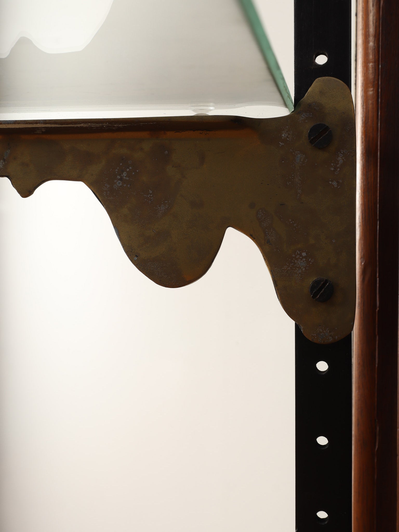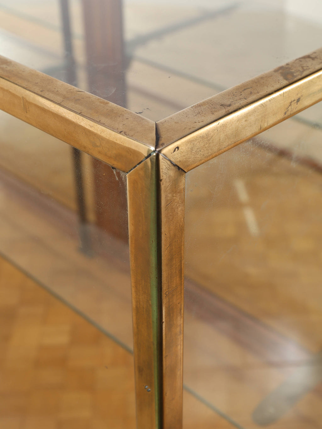 1920年代(推定)の著名な店舗内装メーカーPOLLARDS(ポラーズ)社によるショップディスプレイカウンター。当時、宝飾店や高級ブティックの什器を手掛けた同社の製品は、商品を最も美しく見せる「ディスプレイに特化した設計」が特徴です。繊細な真鍮フレームとマホガニー材の重厚感が、洗練された品格を醸し出します。特筆すべきは、底板に施された美しいパーケット(寄木細工)と、空間に奥行きを与える背面のミラー。W2140mmの堂々たるステージが、並べたコレクションを一つ上のランクへと引き上げます。