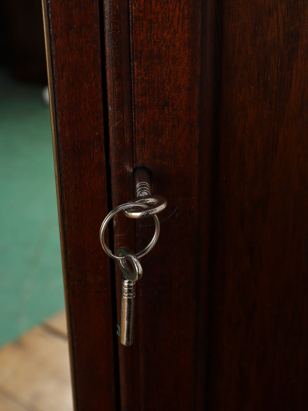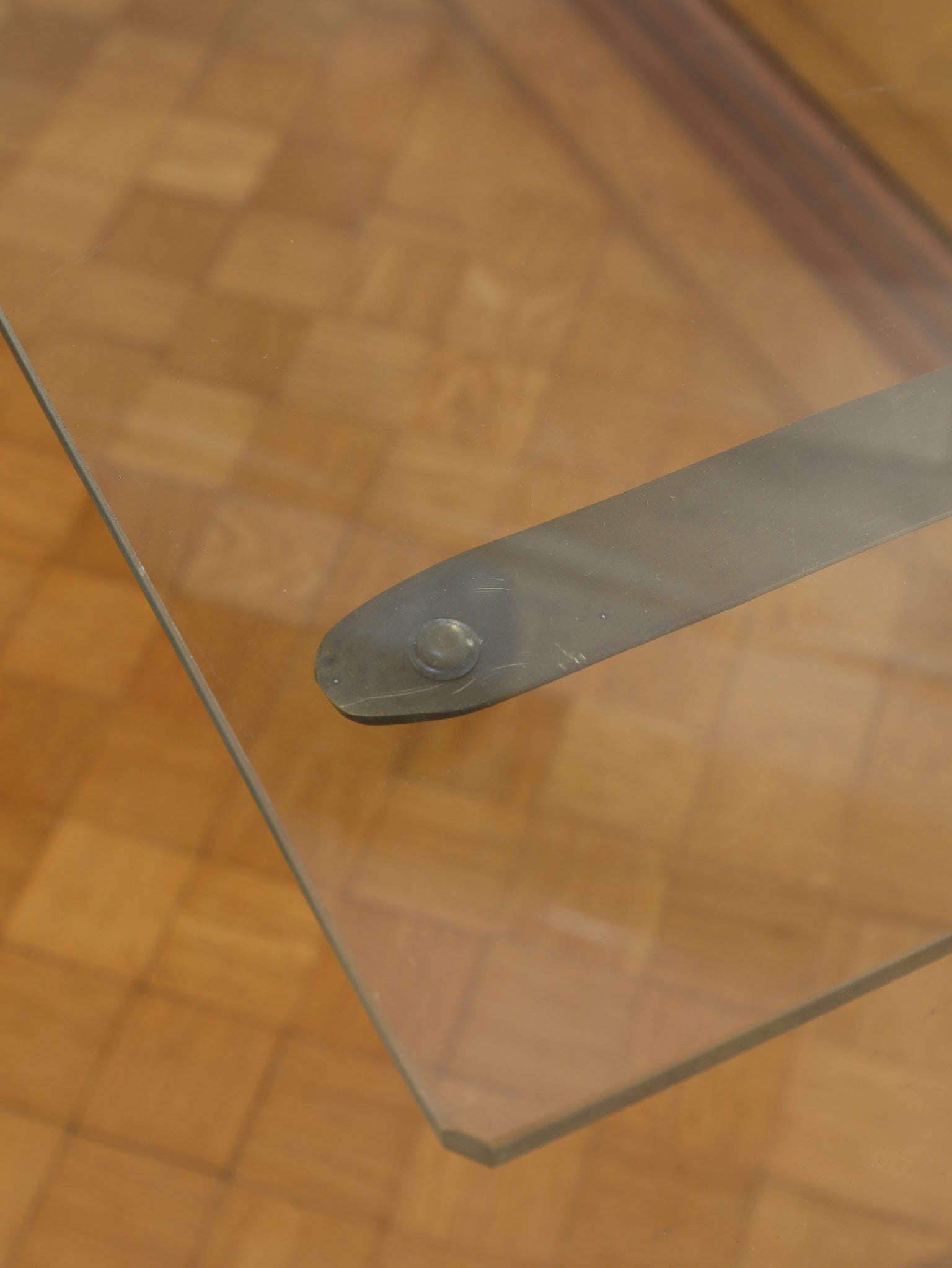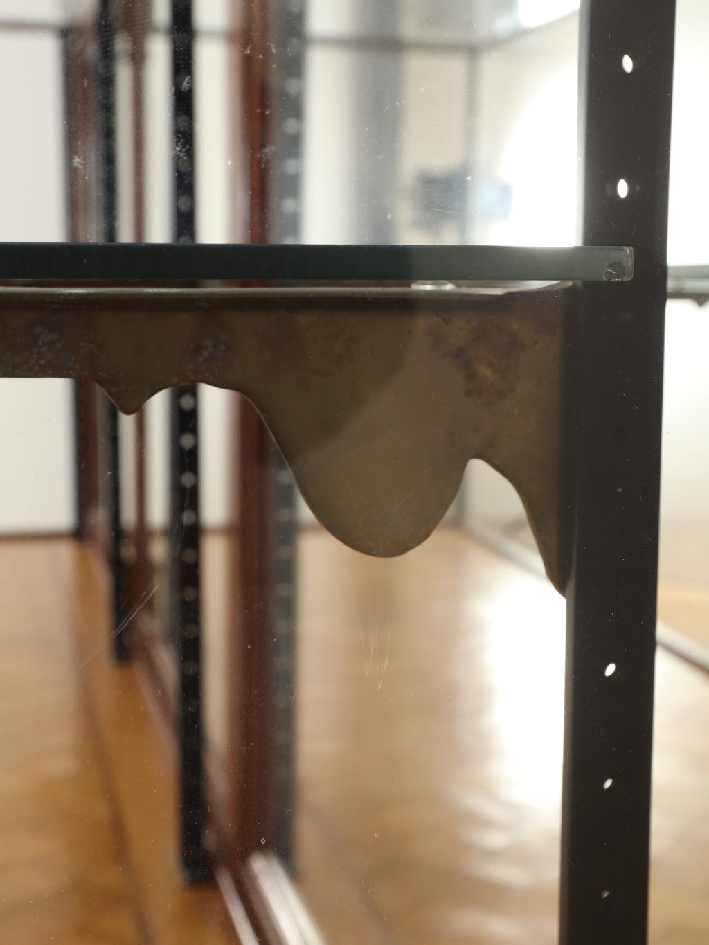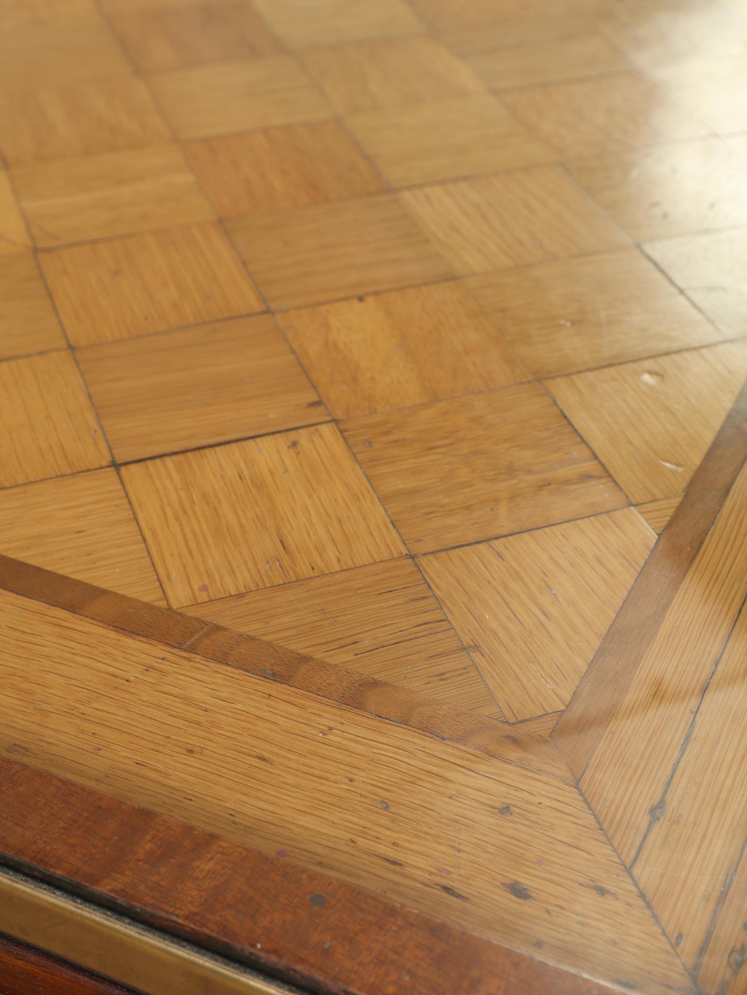 1920年代(推定)の著名な店舗内装メーカーPOLLARDS(ポラーズ)社によるショップディスプレイカウンター。当時、宝飾店や高級ブティックの什器を手掛けた同社の製品は、商品を最も美しく見せる「ディスプレイに特化した設計」が特徴です。繊細な真鍮フレームとマホガニー材の重厚感が、洗練された品格を醸し出します。特筆すべきは、底板に施された美しいパーケット(寄木細工)と、空間に奥行きを与える背面のミラー。W2140mmの堂々たるステージが、並べたコレクションを一つ上のランクへと引き上げます。