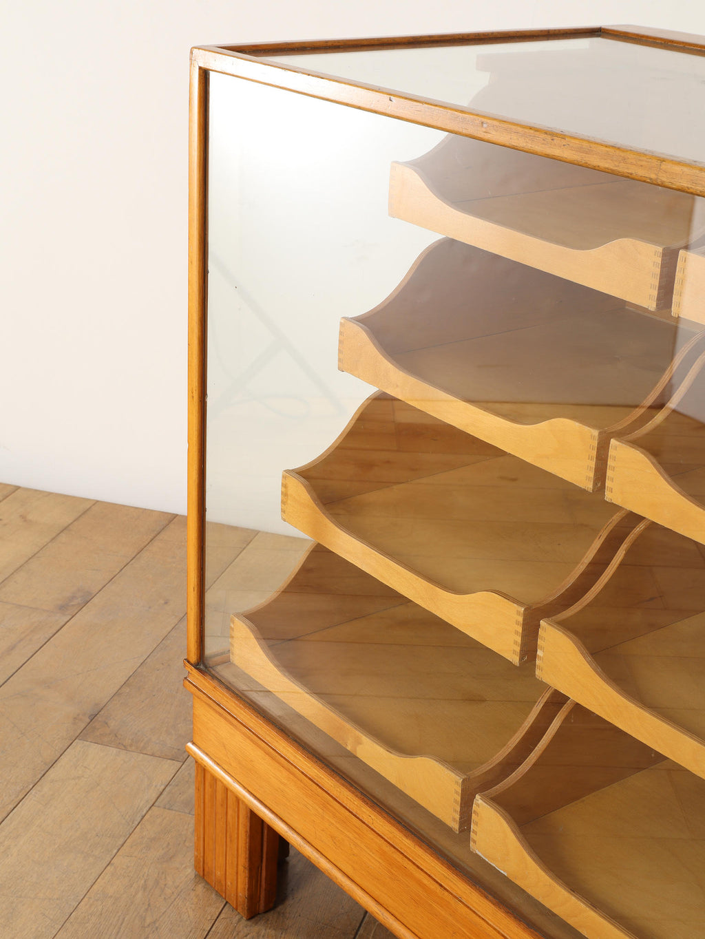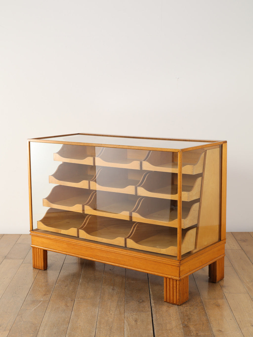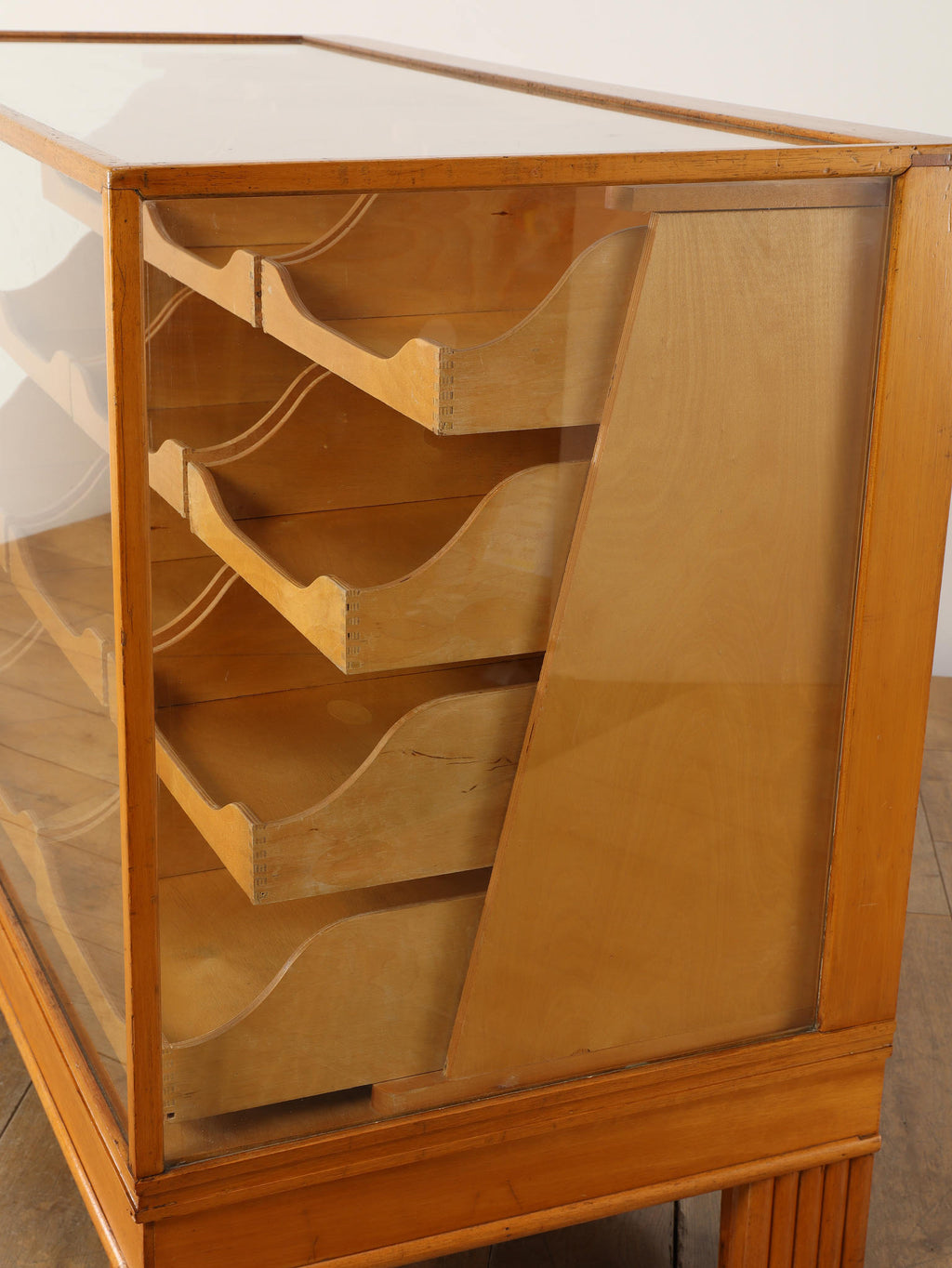 1950年代(推定)のイギリスで、実際に什器として活躍していたビーチ材のシャツカウンター。かつて英国の紳士服店で、仕立ての良いシャツを美しく陳列・販売するために使われていた当時の情景を色濃く残す一台です。 ガラス面に囲まれたデザインは、中に入れた物を埃から守りつつ、ショーケースのように魅力的に演出します。本来は大型のものが多い店舗什器ですが、こちらは幅1220mmと非常にコンパクトなサイズ感が魅力。ご自宅のコレクションケースとしてはもちろん、店舗のアイキャッチとなるディスプレイ什器としても、空間を上質に彩る実用的な一品です。