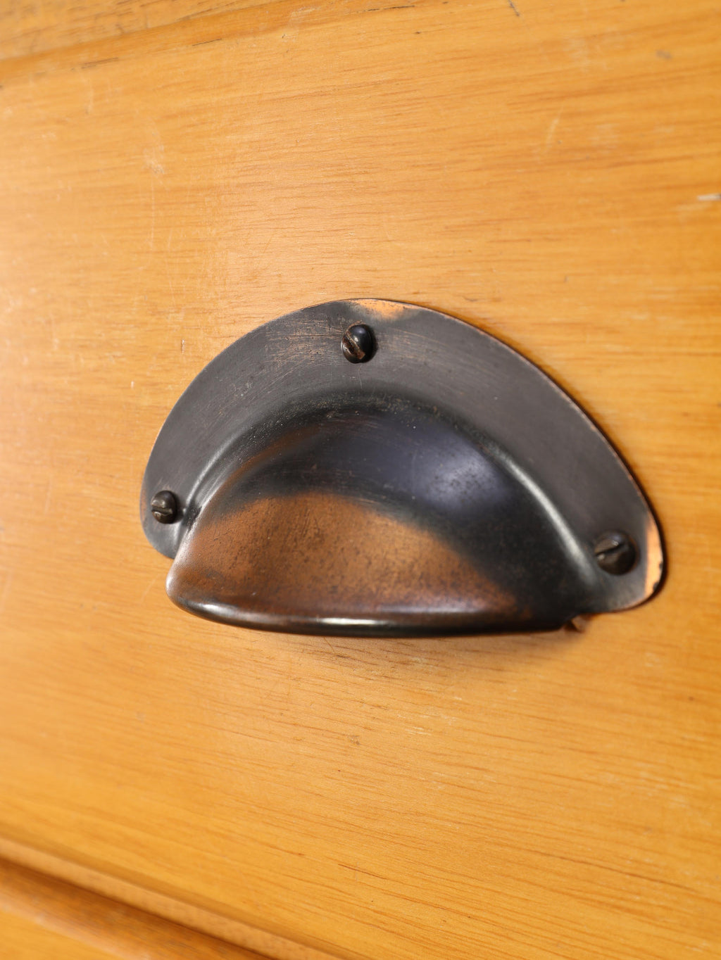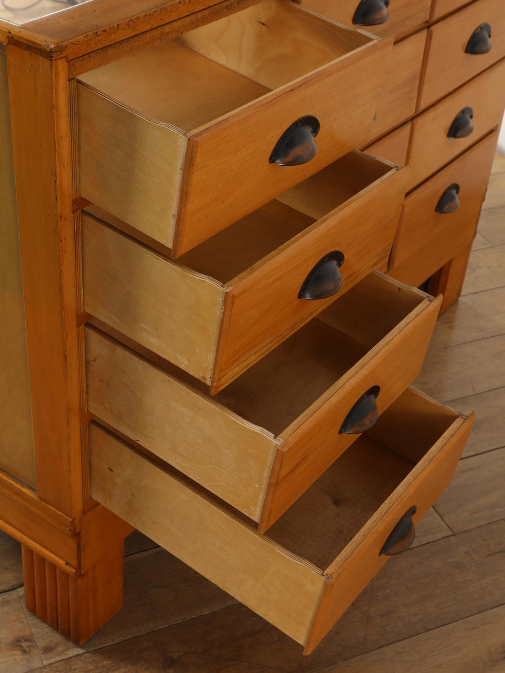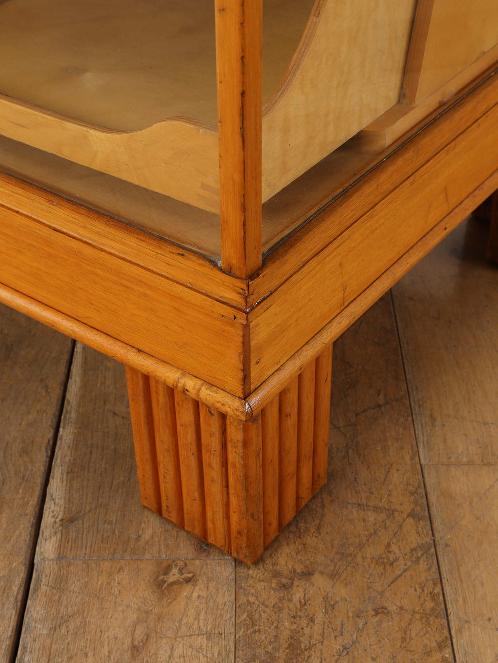 1950年代(推定)のイギリスで、実際に什器として活躍していたビーチ材のシャツカウンター。かつて英国の紳士服店で、仕立ての良いシャツを美しく陳列・販売するために使われていた当時の情景を色濃く残す一台です。 ガラス面に囲まれたデザインは、中に入れた物を埃から守りつつ、ショーケースのように魅力的に演出します。本来は大型のものが多い店舗什器ですが、こちらは幅1220mmと非常にコンパクトなサイズ感が魅力。ご自宅のコレクションケースとしてはもちろん、店舗のアイキャッチとなるディスプレイ什器としても、空間を上質に彩る実用的な一品です。