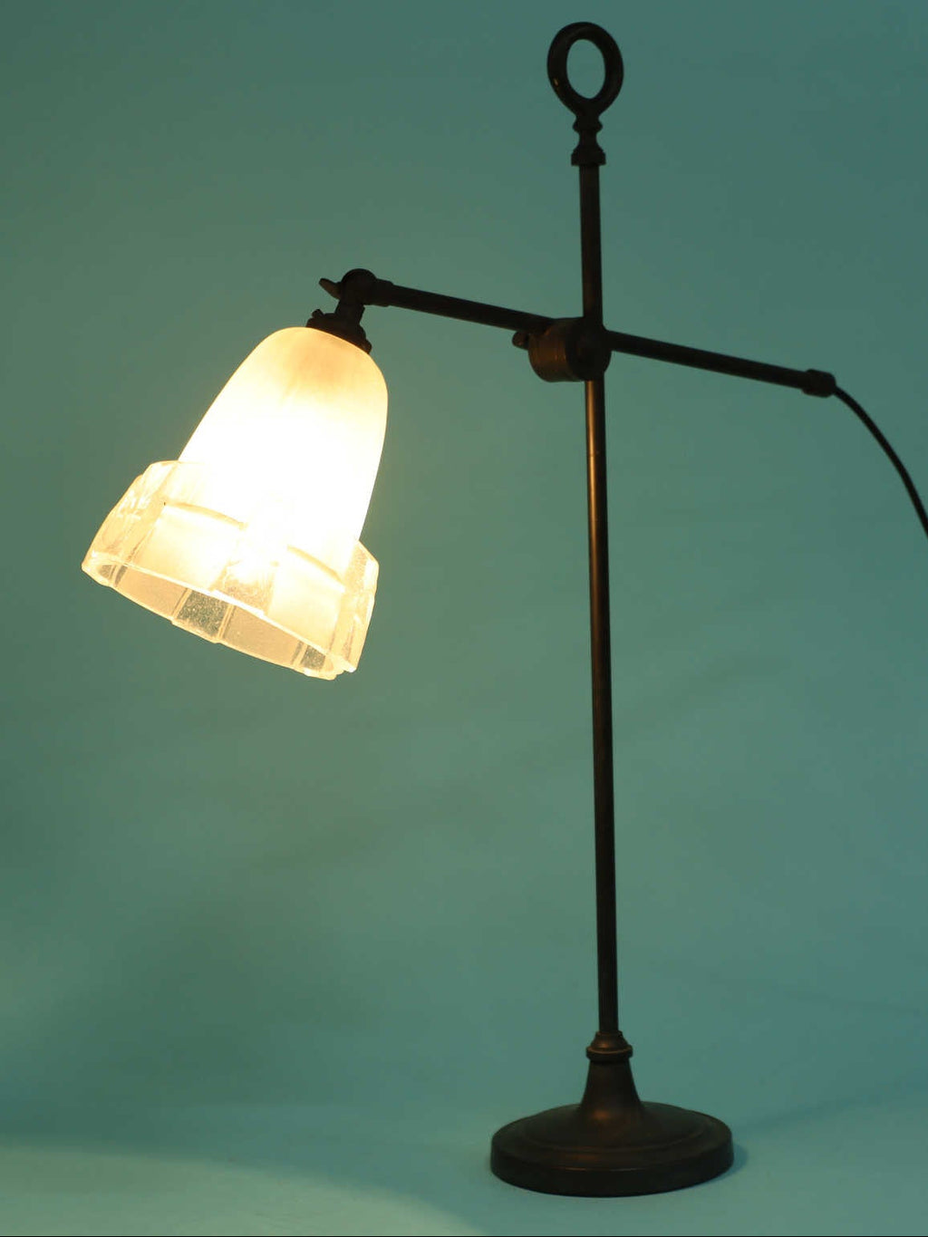 1950年代(推定)にベルギーで製造された、重厚な存在感を放つヴィンテージランプです。ベースとフレームには、歴史を感じさせる深みのあるアイアンが用いられ、その無骨な素材感がモダンなデザインを引き締めています。シェードは柔らかな光を透過する美しい磨りガラスで、アールデコの幾何学的なカットが施されています。全体的な佇まいは、まるでモダンアートのオブジェのような造形で、点灯していない時でも空間に確かな存在感を与えます。最大の特長はアームのジョイント機構です。シェードの高さと角度を自由に調節できるため、読書や作業用のデスクランプとして最適です。手元を集中的に照らすだけでなく、間接照明のように使うこともでき、多様なシーンに対応します。