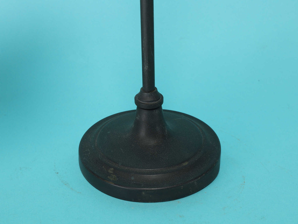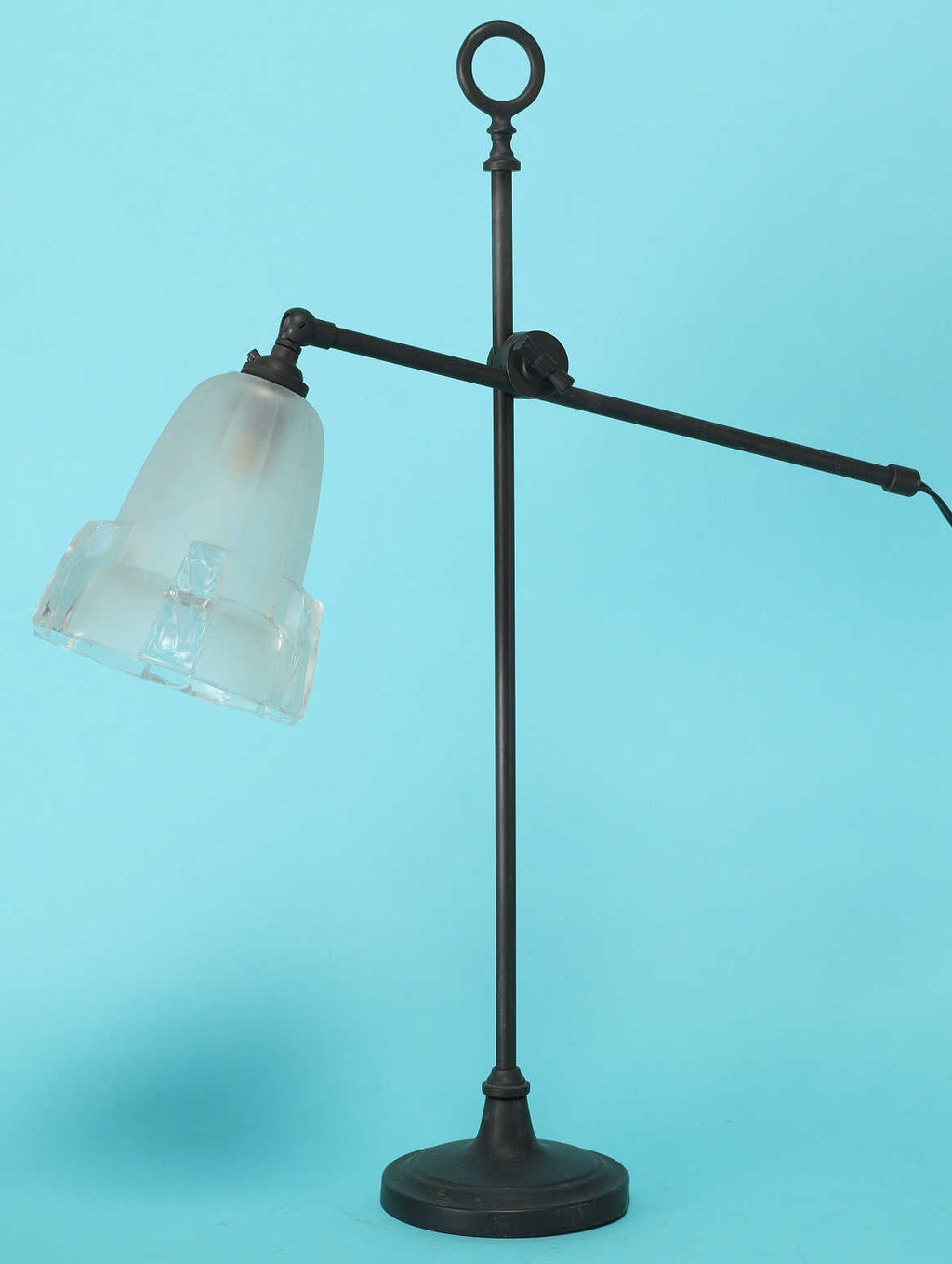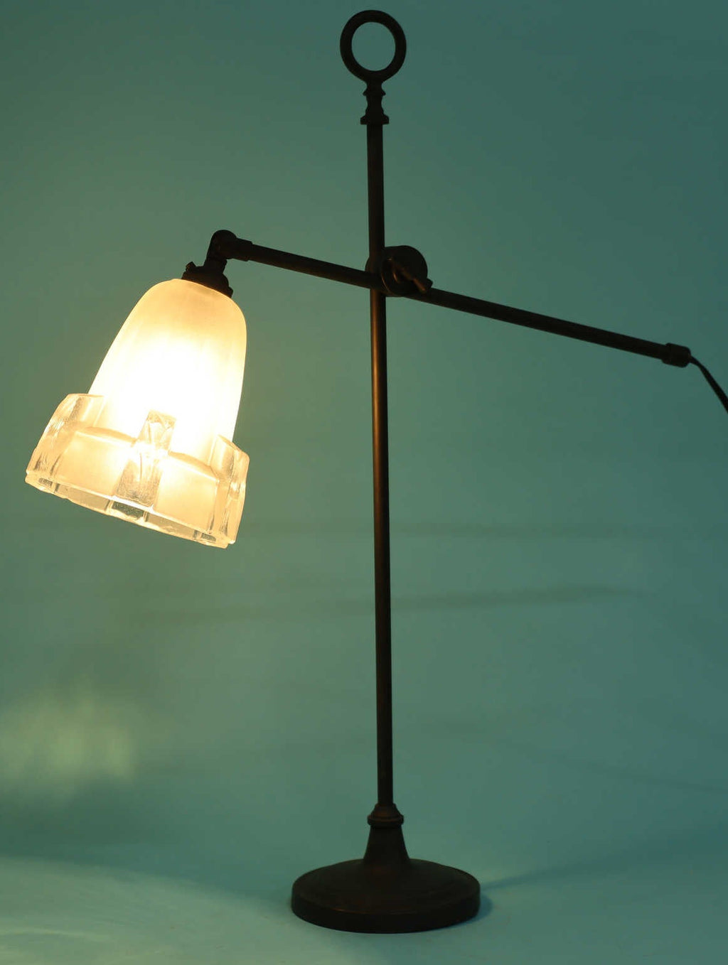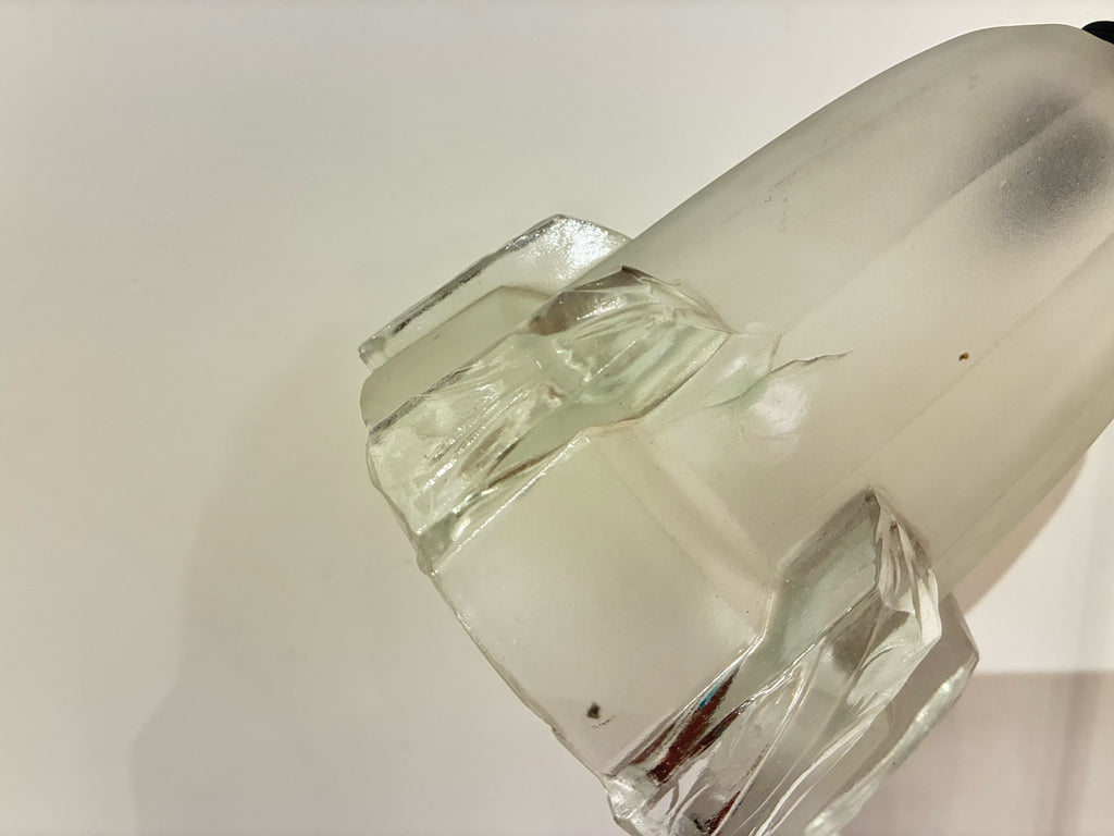 1950年代(推定)にベルギーで製造された、重厚な存在感を放つヴィンテージランプです。ベースとフレームには、歴史を感じさせる深みのあるアイアンが用いられ、その無骨な素材感がモダンなデザインを引き締めています。シェードは柔らかな光を透過する美しい磨りガラスで、アールデコの幾何学的なカットが施されています。全体的な佇まいは、まるでモダンアートのオブジェのような造形で、点灯していない時でも空間に確かな存在感を与えます。最大の特長はアームのジョイント機構です。シェードの高さと角度を自由に調節できるため、読書や作業用のデスクランプとして最適です。手元を集中的に照らすだけでなく、間接照明のように使うこともでき、多様なシーンに対応します。