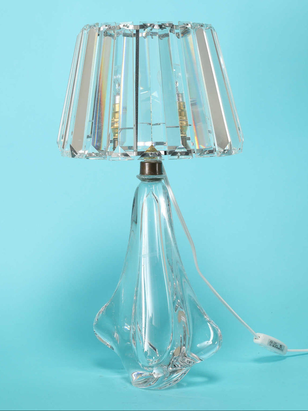 1950年代(推定)のベルギーで製作された、ラグジュアリーな存在感を放つテーブルランプ。厚みのあるクリアガラスのベースは、彫刻のようなフォルムと光の屈折が織りなす流動的な美を湛えています。シェードには、面取りされたガラスを幾重にも重ね、灯りをともすとまるでダイヤモンドのティアラのようです。光を複雑に反射し、天井や壁に華やかなスペクトルを描き出します。リビングのサイドテーブルやエントランスに置けば、洗練された非日常へと変わることでしょう。