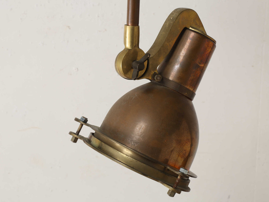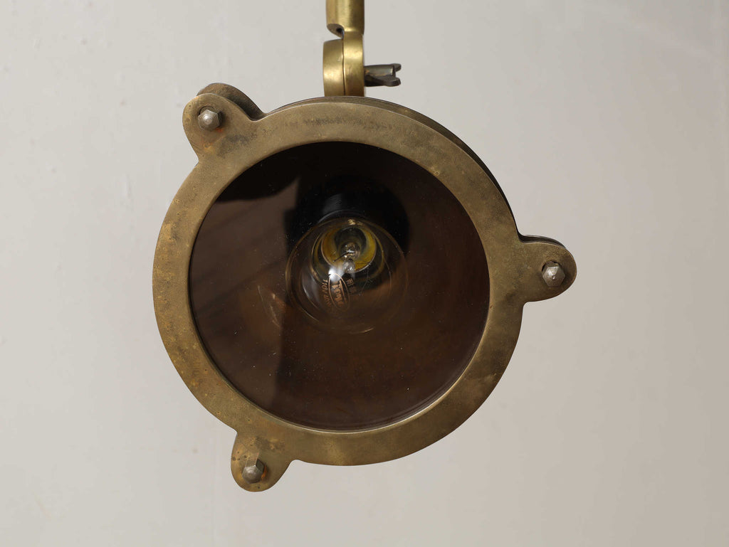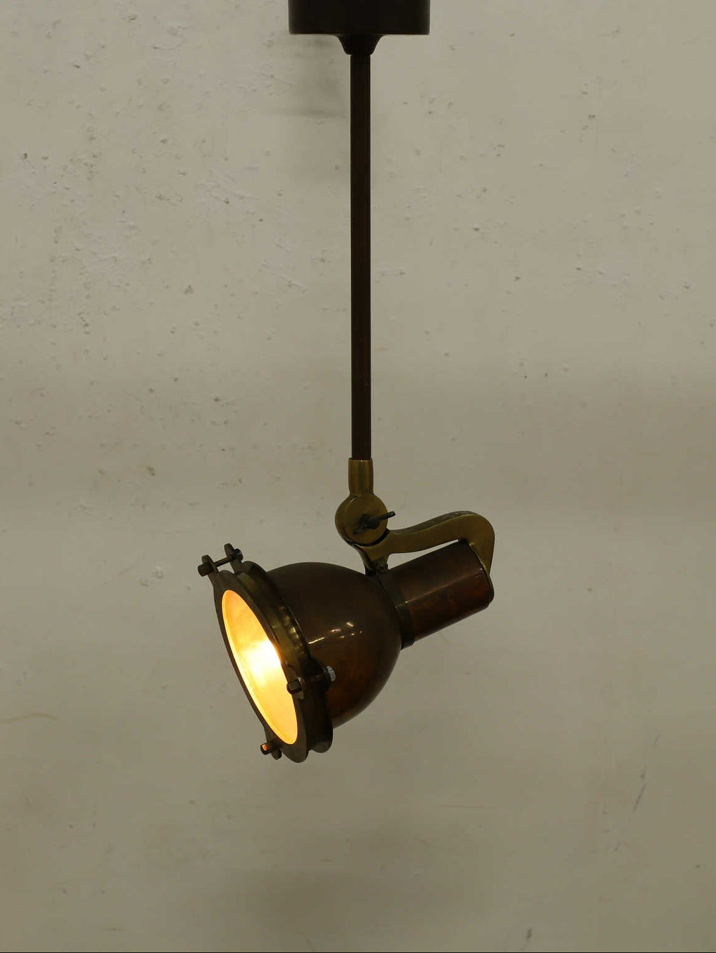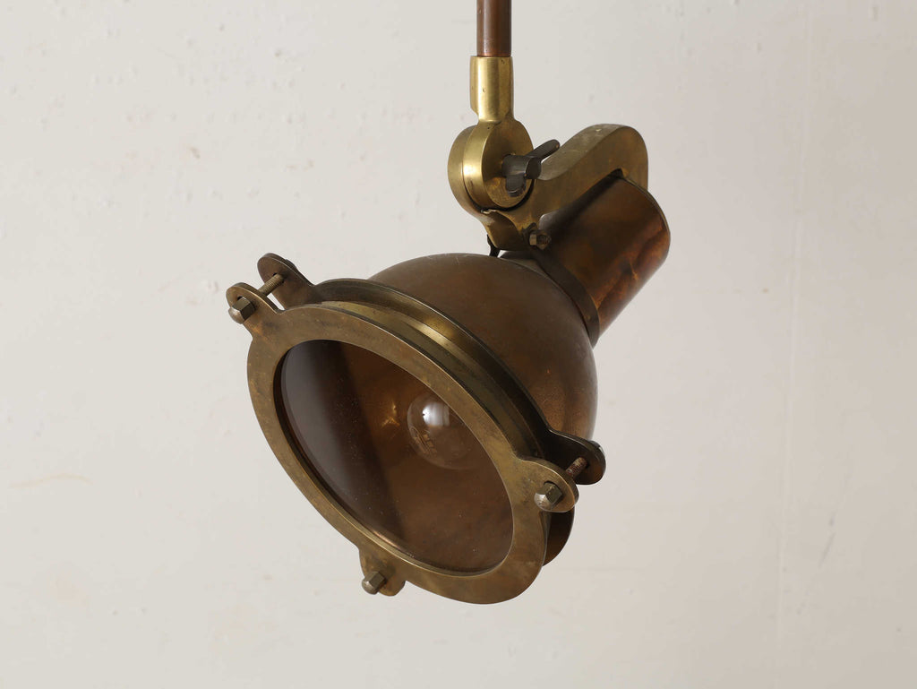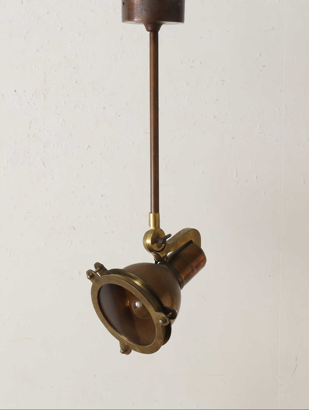 1950年代(推定)のベルギーで製作された、重厚な真鍮の質感が際立つシーリングランプです。そのデザインは、船の甲板や機関室で使われていた船舶ランプや、舞台照明のスポットライトからインスピレーションを受けています。時間の経過とともに増した重厚な風合いは、物語を語りかけてくるようです。シェードのガラスは濃色で、点灯すると光が凝縮され、空間にドラマチックな光の柱を投げかけます。ガレージや書斎、または現代的なキッチンのカウンター上など、無骨さと質感を求める空間に最適です。