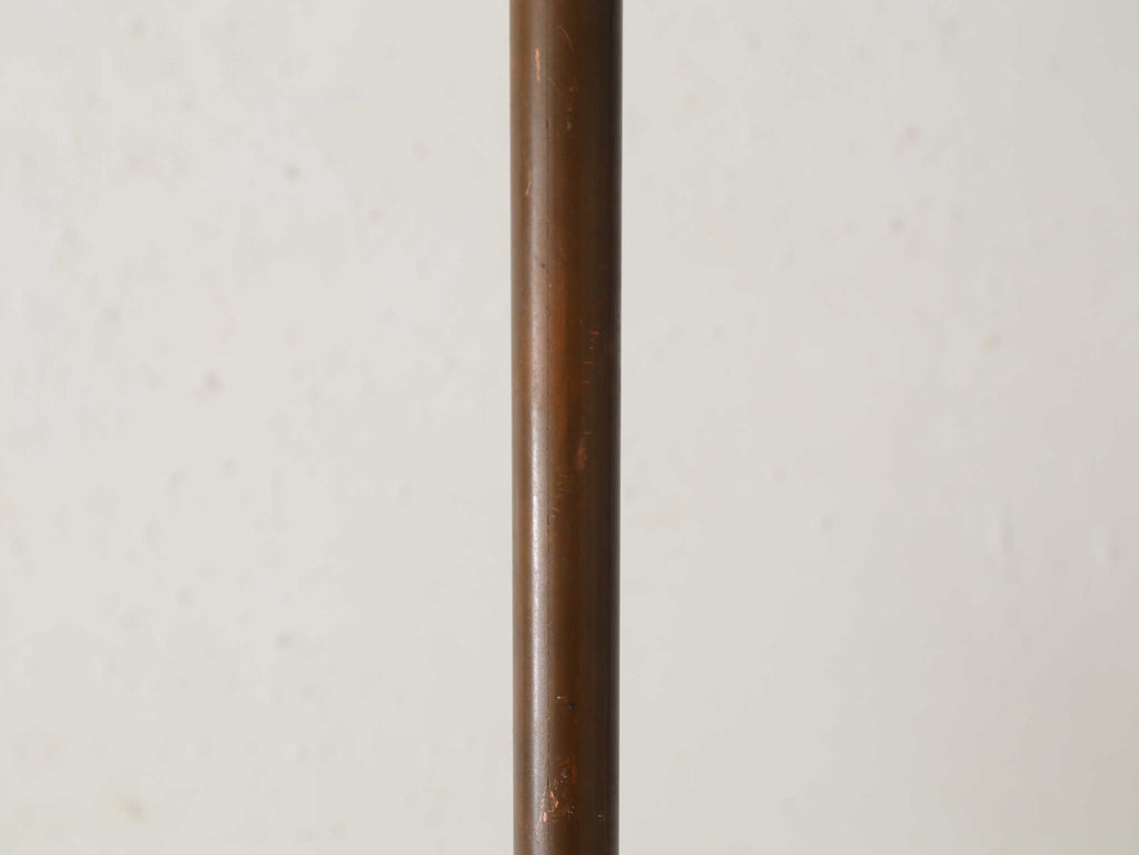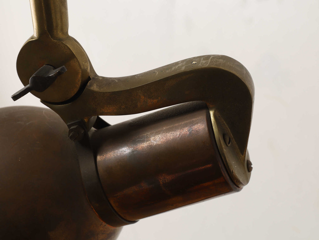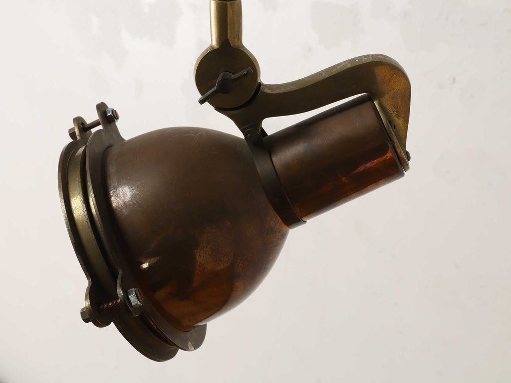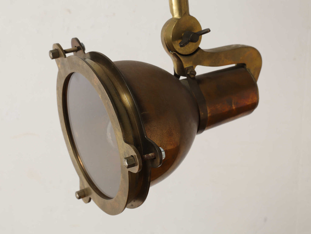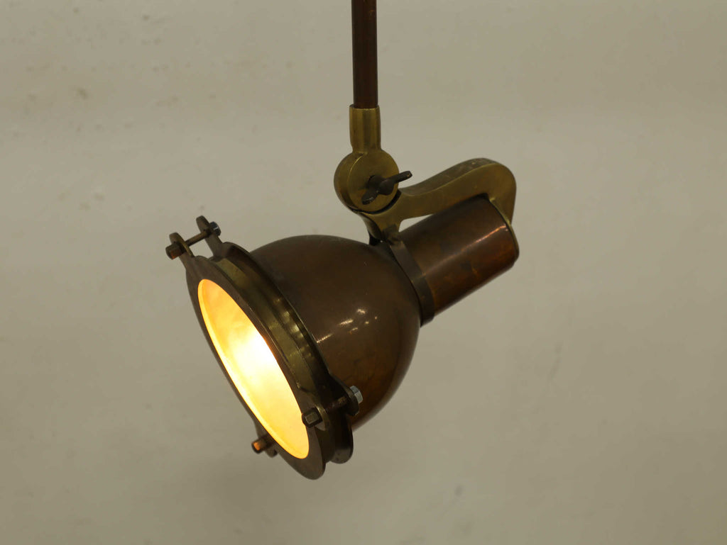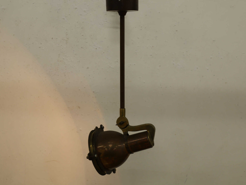 1950年代(推定)のベルギーで製作された、重厚な真鍮の質感が際立つシーリングランプです。そのデザインは、船の甲板や機関室で使われていた船舶ランプや、舞台照明のスポットライトからインスピレーションを受けています。時間の経過とともに増した重厚な風合いは、物語を語りかけてくるようです。シェードのガラスは濃色で、点灯すると光が凝縮され、空間にドラマチックな光の柱を投げかけます。ガレージや書斎、または現代的なキッチンのカウンター上など、無骨さと質感を求める空間に最適です。