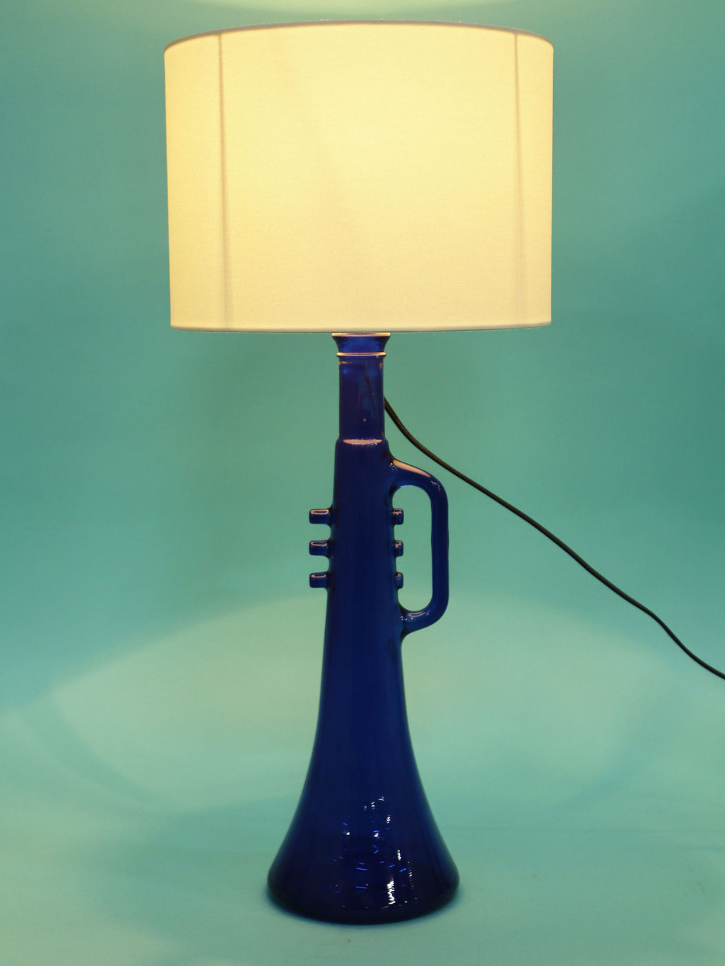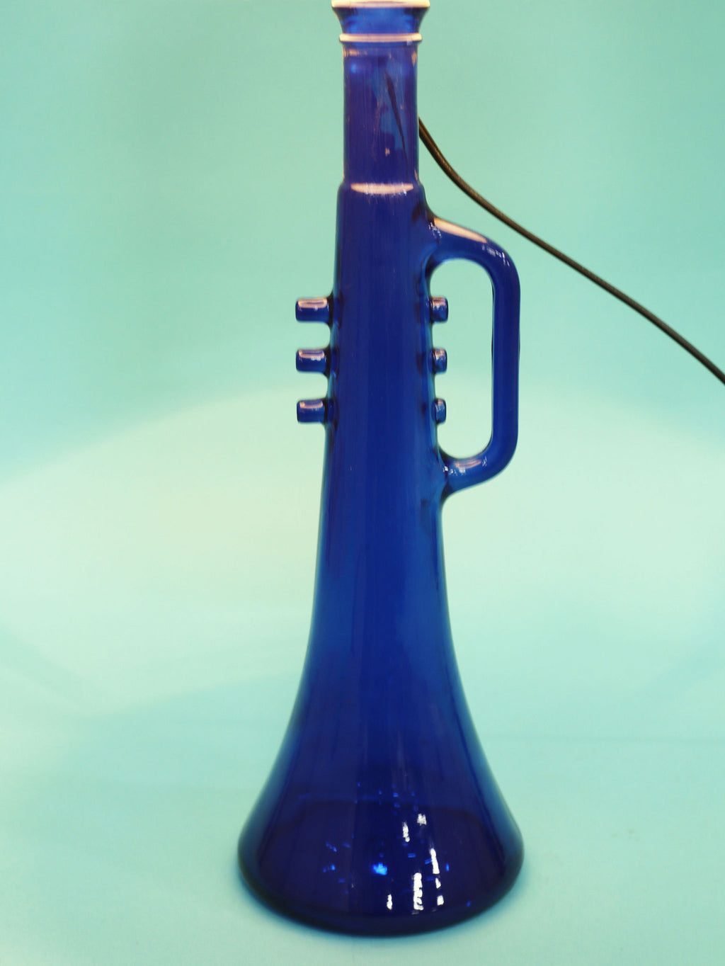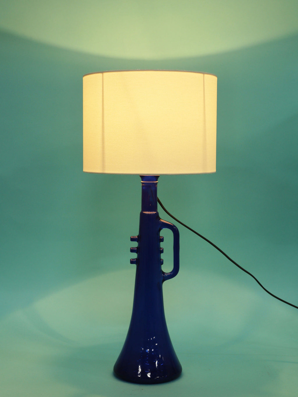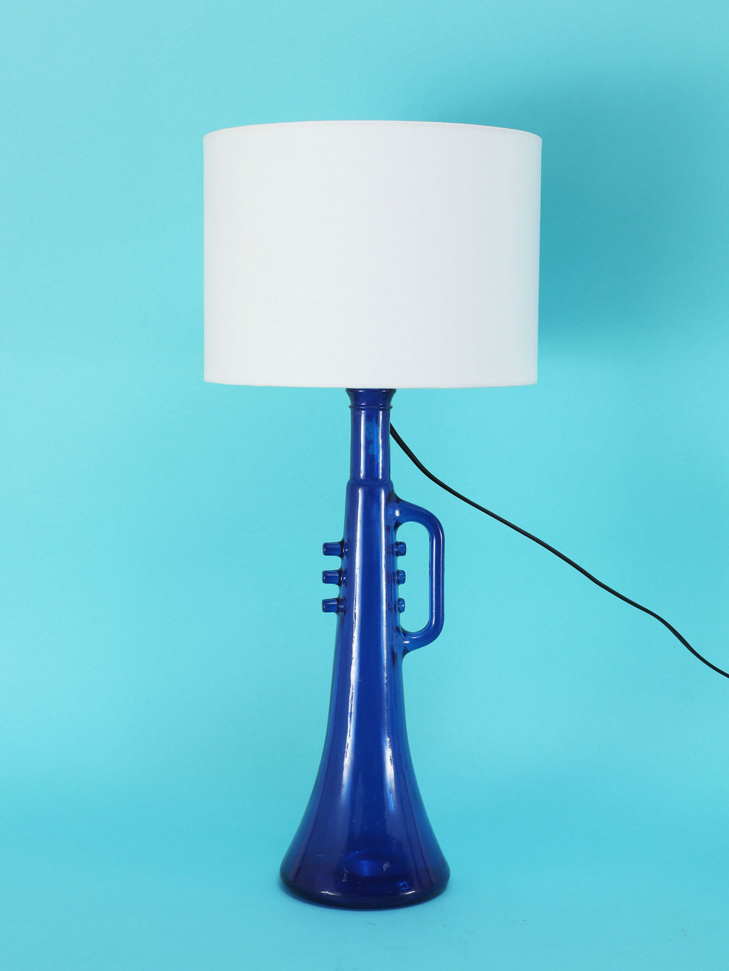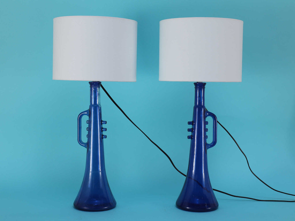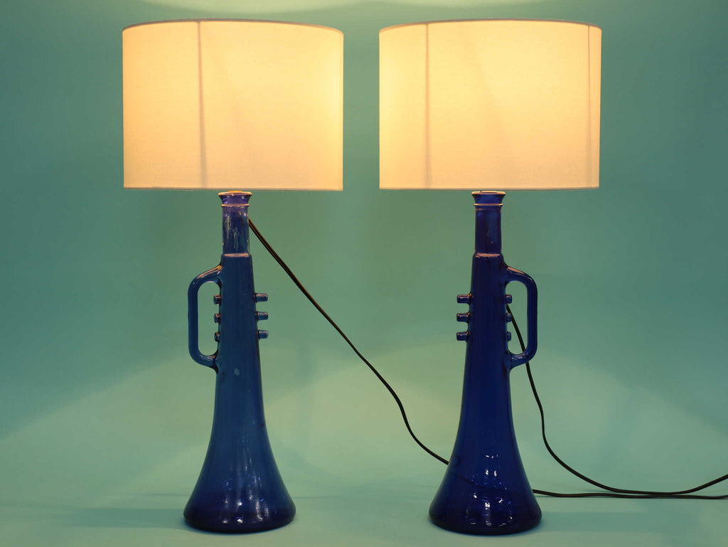 鮮やかなコバルトブルーが美しい、1970年代(推定)に作られたガラス製のテーブルランプです。トランペットを模したユニークで遊び心のあるフォルムが目を惹きます。明かりを灯すと、深い青色のガラスを通して幻想的な光が広がり、お部屋をムーディーに演出してくれます。ミッドセンチュリーやモダンなインテリアにのアクセントとしてもおすすめです。オブジェとして飾っておくだけでも存在感のある、アートピースのような照明です。2つセットでシンメトリーに配置するのも素敵です。