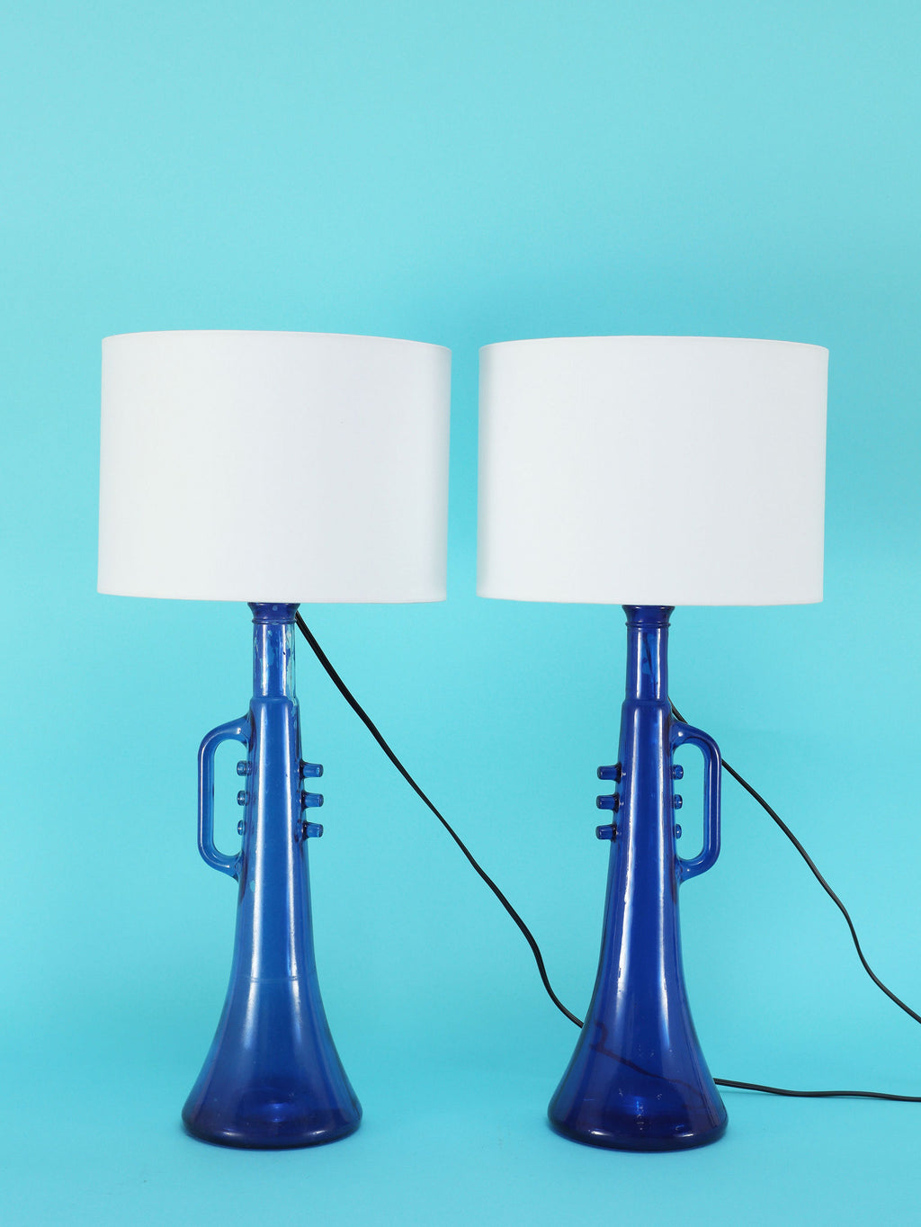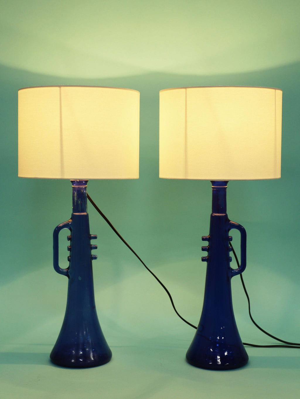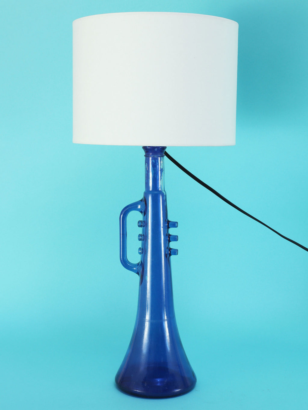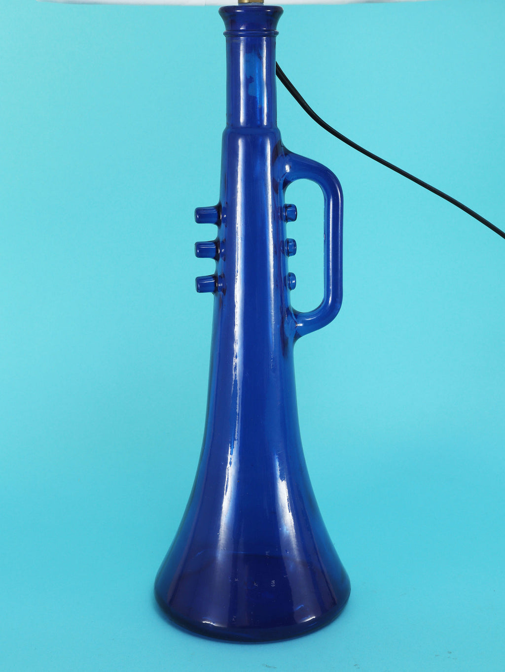 鮮やかなコバルトブルーが美しい、1970年代(推定)に作られたガラス製のテーブルランプです。トランペットを模したユニークで遊び心のあるフォルムが目を惹きます。明かりを灯すと、深い青色のガラスを通して幻想的な光が広がり、お部屋をムーディーに演出してくれます。ミッドセンチュリーやモダンなインテリアにのアクセントとしてもおすすめです。オブジェとして飾っておくだけでも存在感のある、アートピースのような照明です。2つセットでシンメトリーに配置するのも素敵です。