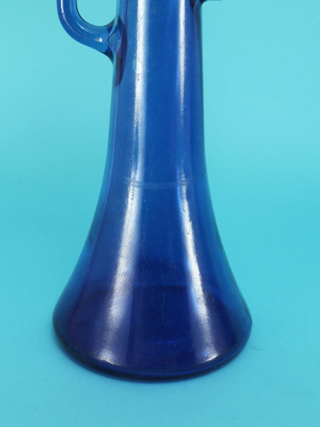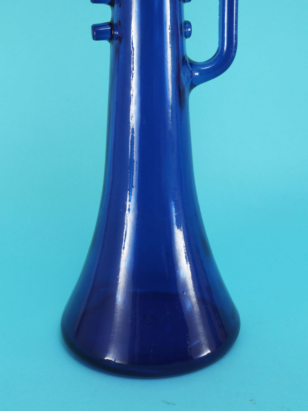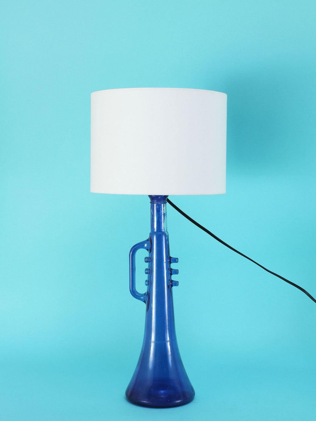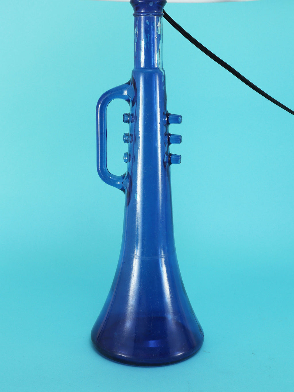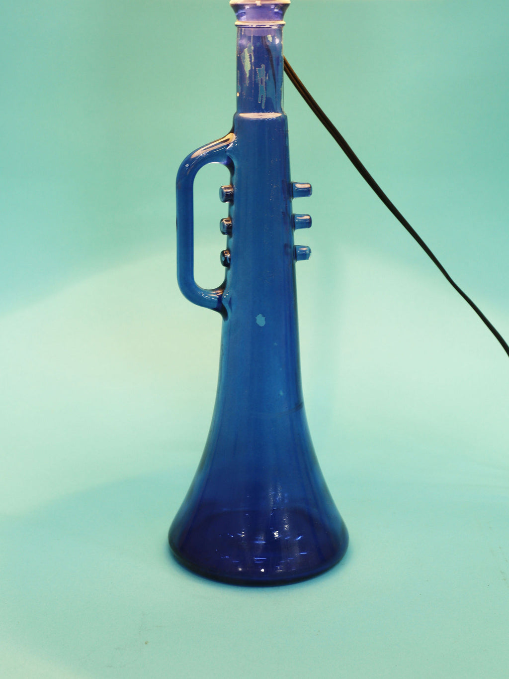 鮮やかなコバルトブルーが美しい、1970年代(推定)に作られたガラス製のテーブルランプです。トランペットを模したユニークで遊び心のあるフォルムが目を惹きます。明かりを灯すと、深い青色のガラスを通して幻想的な光が広がり、お部屋をムーディーに演出してくれます。ミッドセンチュリーやモダンなインテリアにのアクセントとしてもおすすめです。オブジェとして飾っておくだけでも存在感のある、アートピースのような照明です。2つセットでシンメトリーに配置するのも素敵です。